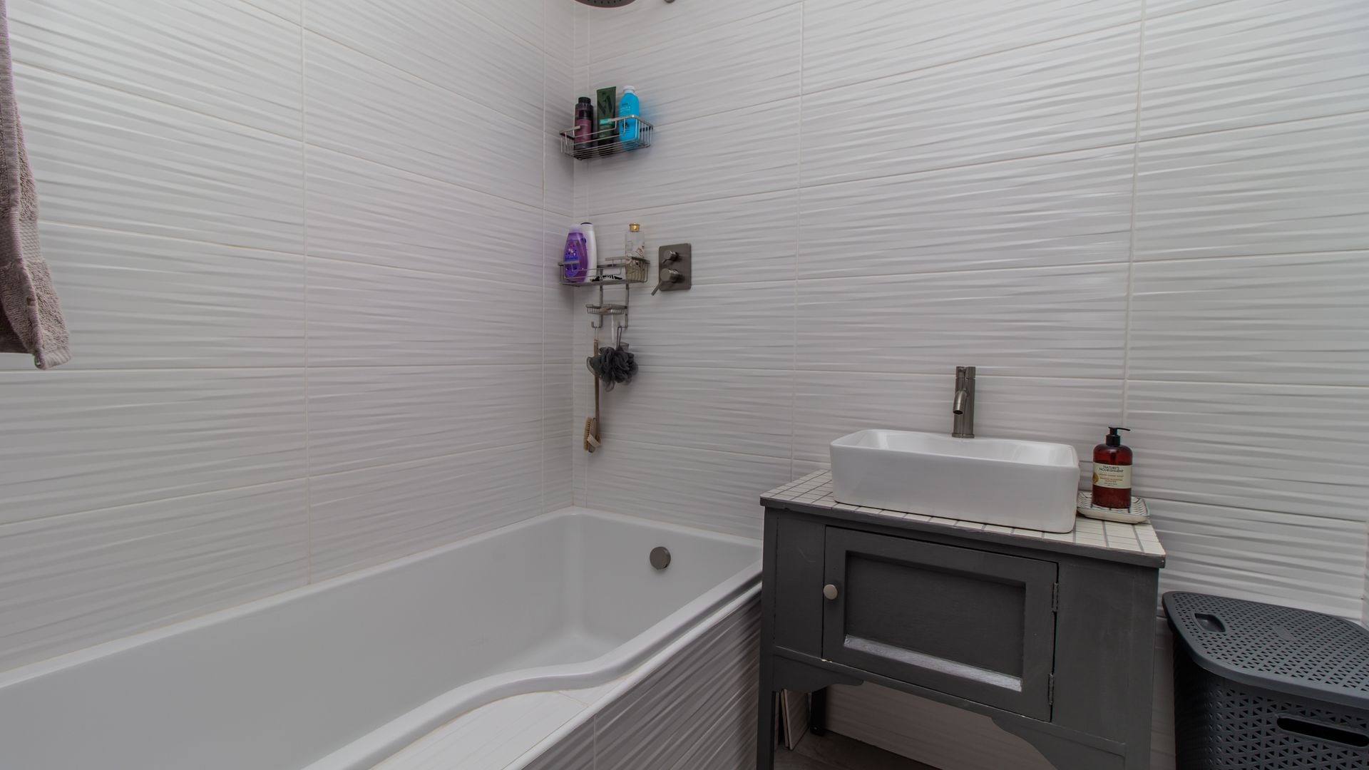The modern bathroom is a real highlight, featuring stylish white textured wall tiles, a built-in bathtub with an integrated shower.