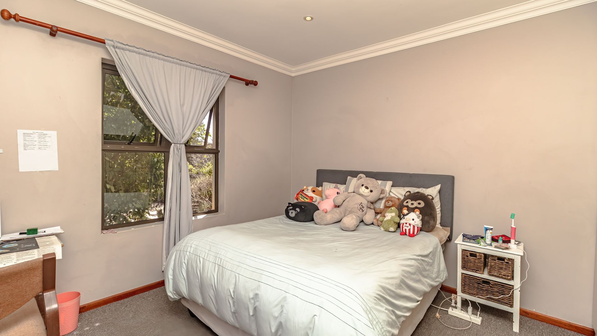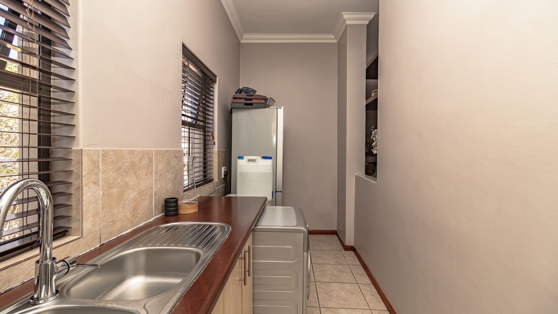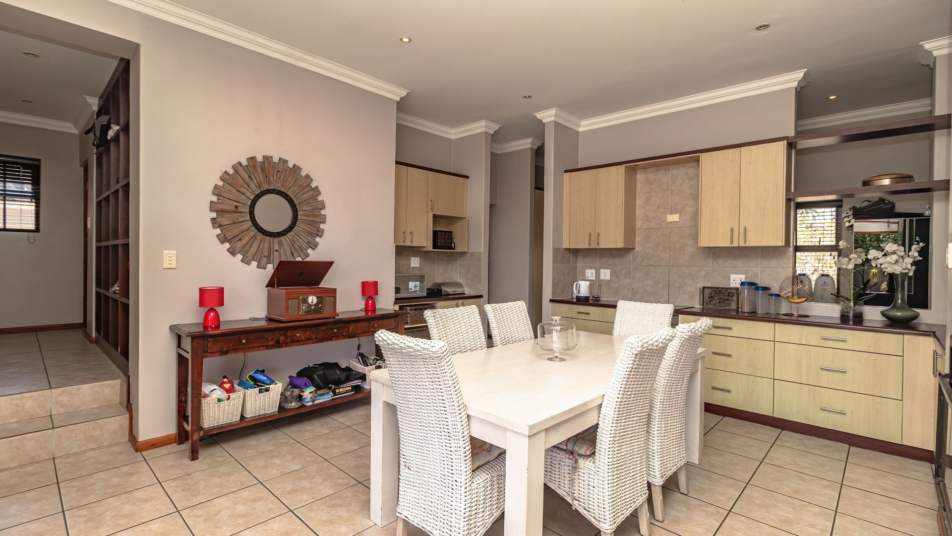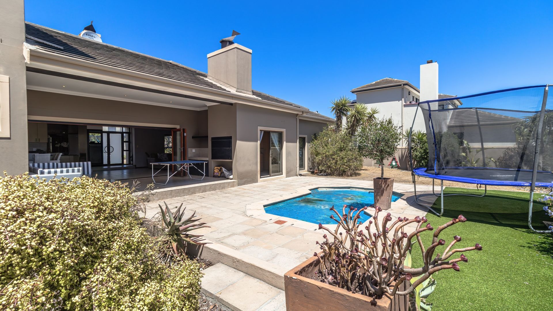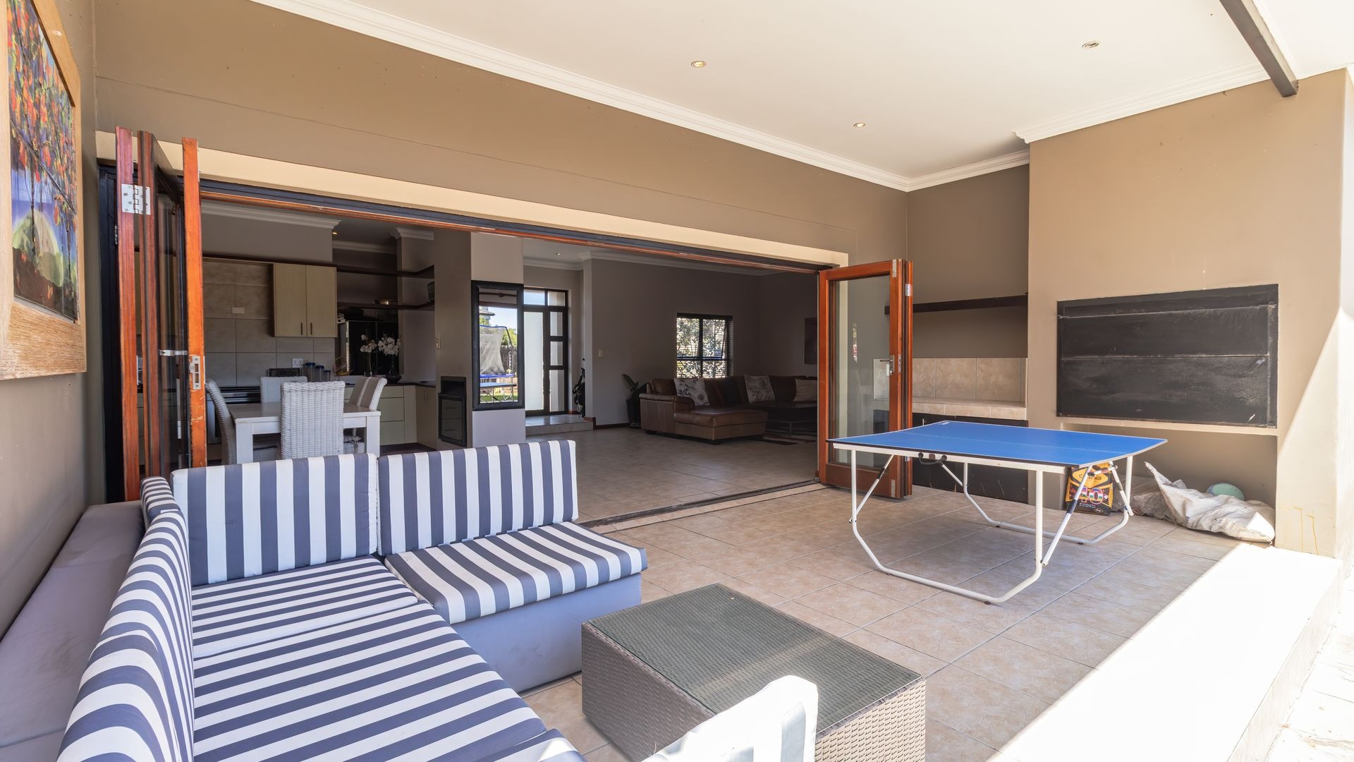 If you’re searching for a secure haven in a beautiful estate with 24-hour access control, this property is the perfect fit. Solidly built and full of potential, it offers timeless features such as wooden doors and stacker doors that open onto a sunny, north-facing entertainment area. Here you’ll find a spacious patio with a built-in braai, flowing seamlessly into a generous garden and sparkling pool—ideal for family gatherings and relaxed weekends.