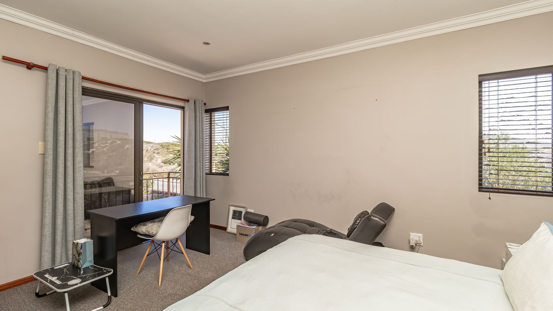 Inside, the home offers flexibility: three carpeted bedrooms downstairs (or two plus a study, if you prefer), while upstairs the main bedroom opens onto a private balcony. The en-suite bathroom is thoughtfully designed with a double vanity, bidet, shower, and toilet. From the kitchen scullery, a neat courtyard provides a practical space to hang laundry out of sight.
