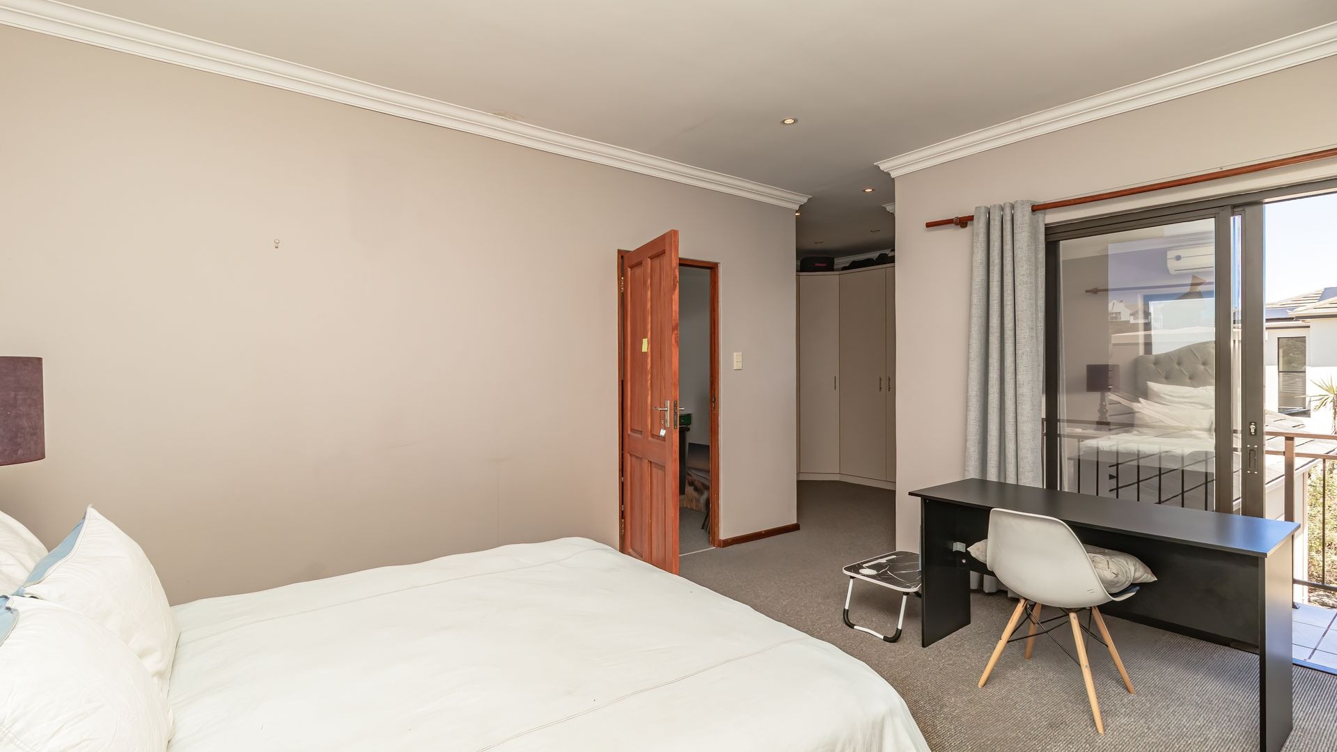 Inside, the home offers flexibility: three carpeted bedrooms downstairs (or two plus a study, if you prefer), while upstairs the main bedroom opens onto a private balcony. The en-suite bathroom is thoughtfully designed with a double vanity, bidet, shower, and toilet. From the kitchen scullery, a neat courtyard provides a practical space to hang laundry out of sight.