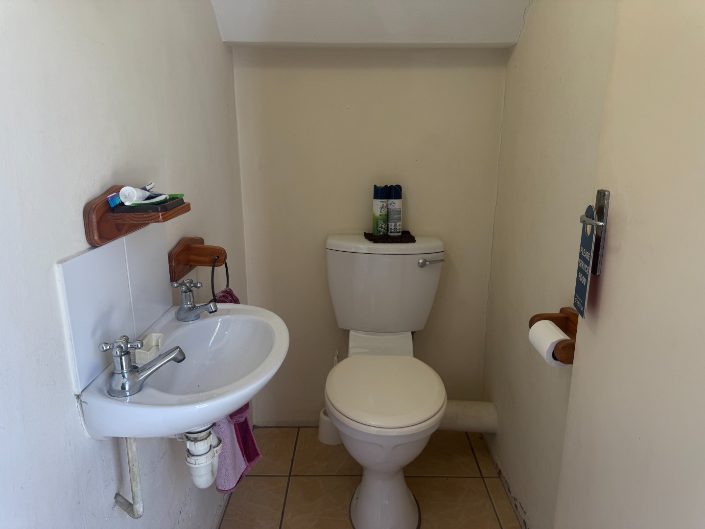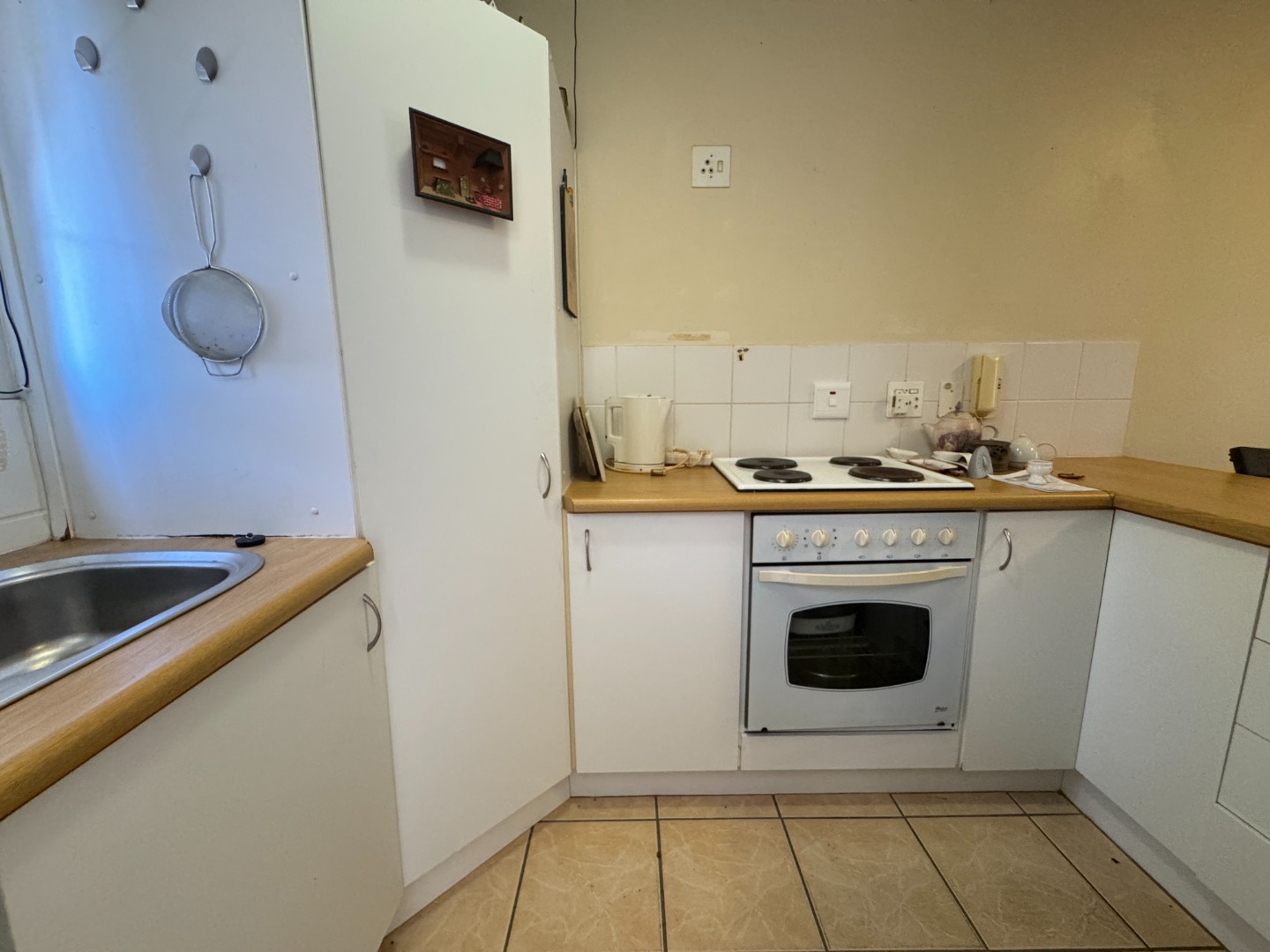 The apartment comprises two bedrooms, providing private retreats. Complementing these are 1.5 bathrooms, featuring essential fixtures. The main bathroom includes a bathtub, toilet, and basin, while an additional guest toilet offers convenience. The compact kitchen is equipped with essential appliances, including a oven and hob, set against white cabinetry and wooden countertops, ensuring everyday functionality.