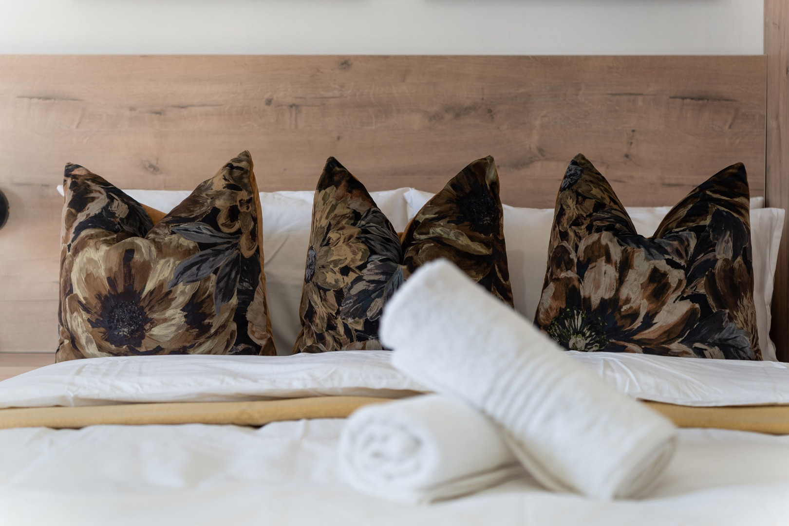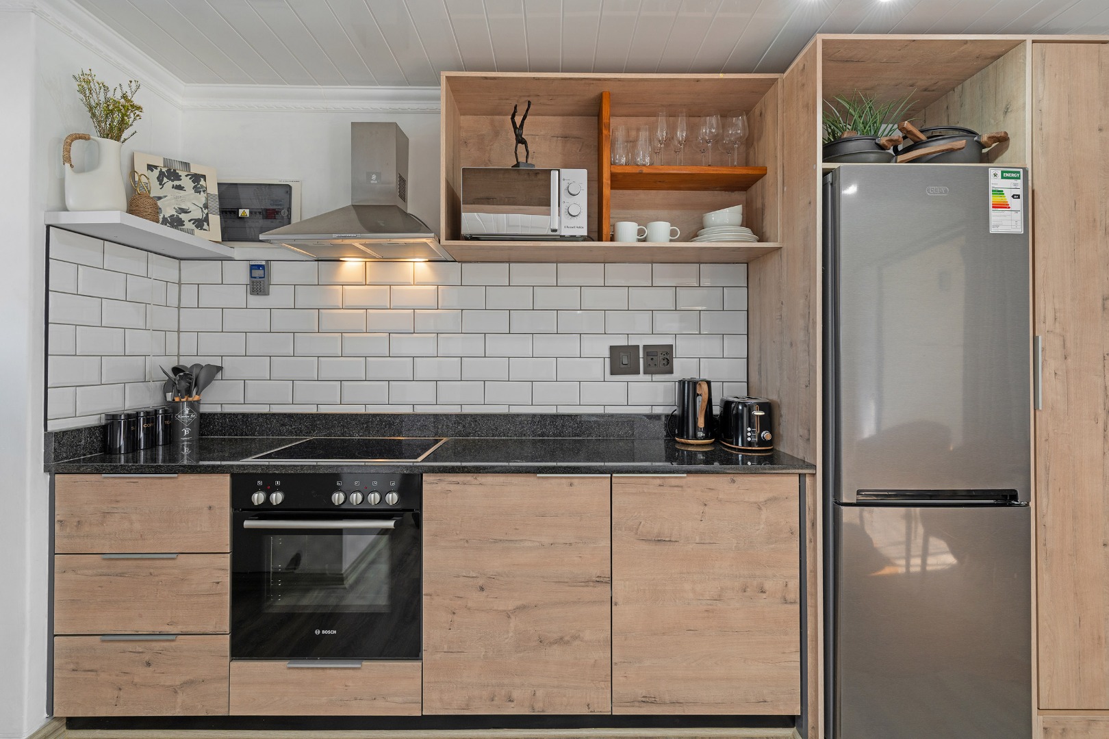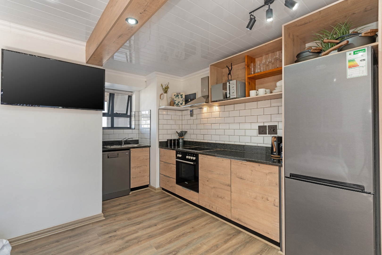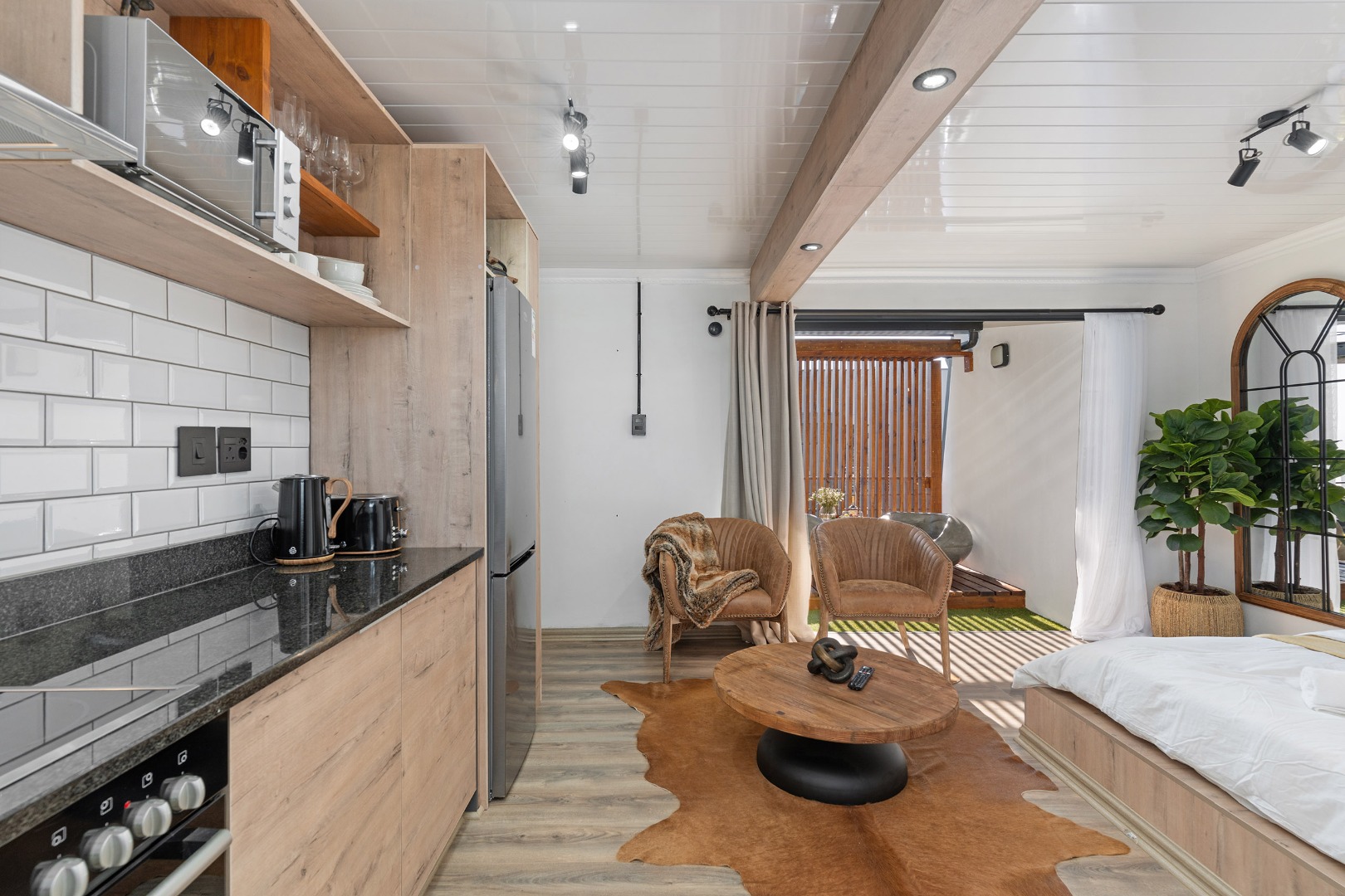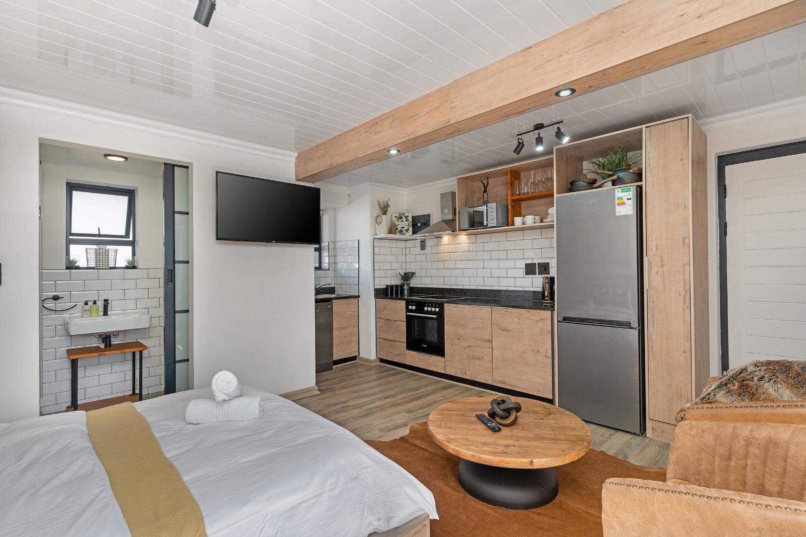 The well-appointed kitchen is a highlight, featuring modern appliances, wooden-look cabinets, and a subway tile backsplash, ensuring both aesthetic appeal and practicality. It integrates effortlessly into the main living space, which includes a comfortable sleeping area and a dedicated lounge zone, complete with a wall-mounted TV for entertainment. Natural light floods the space, enhancing the bright and inviting atmosphere.