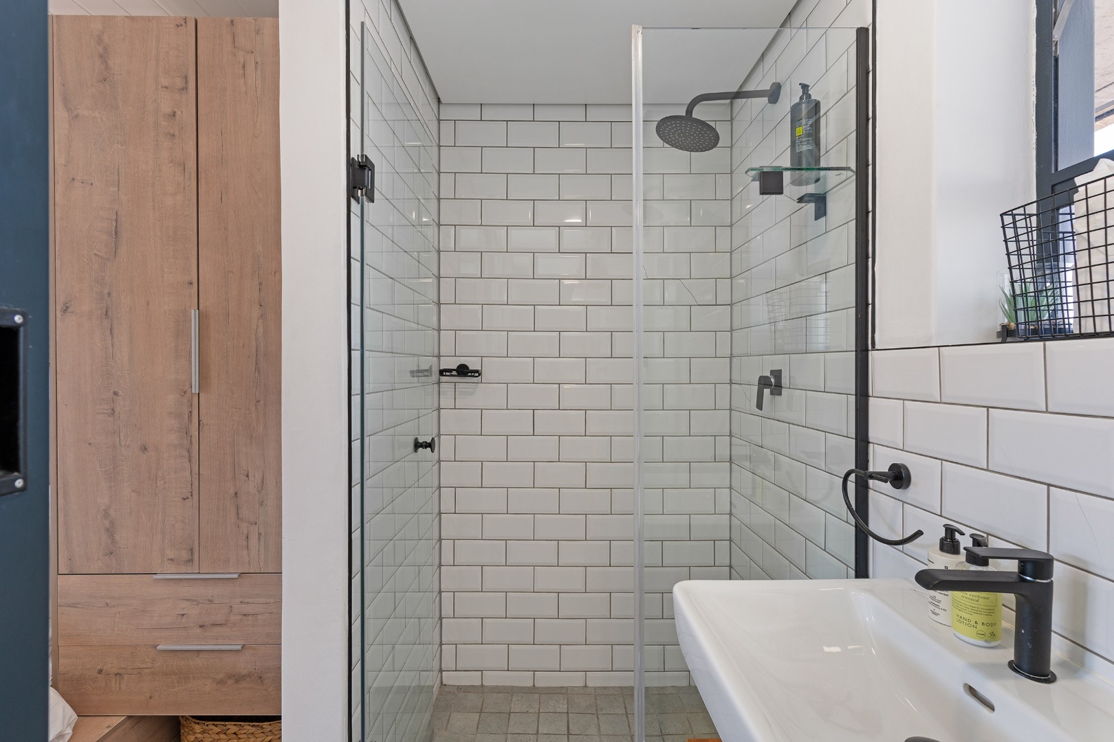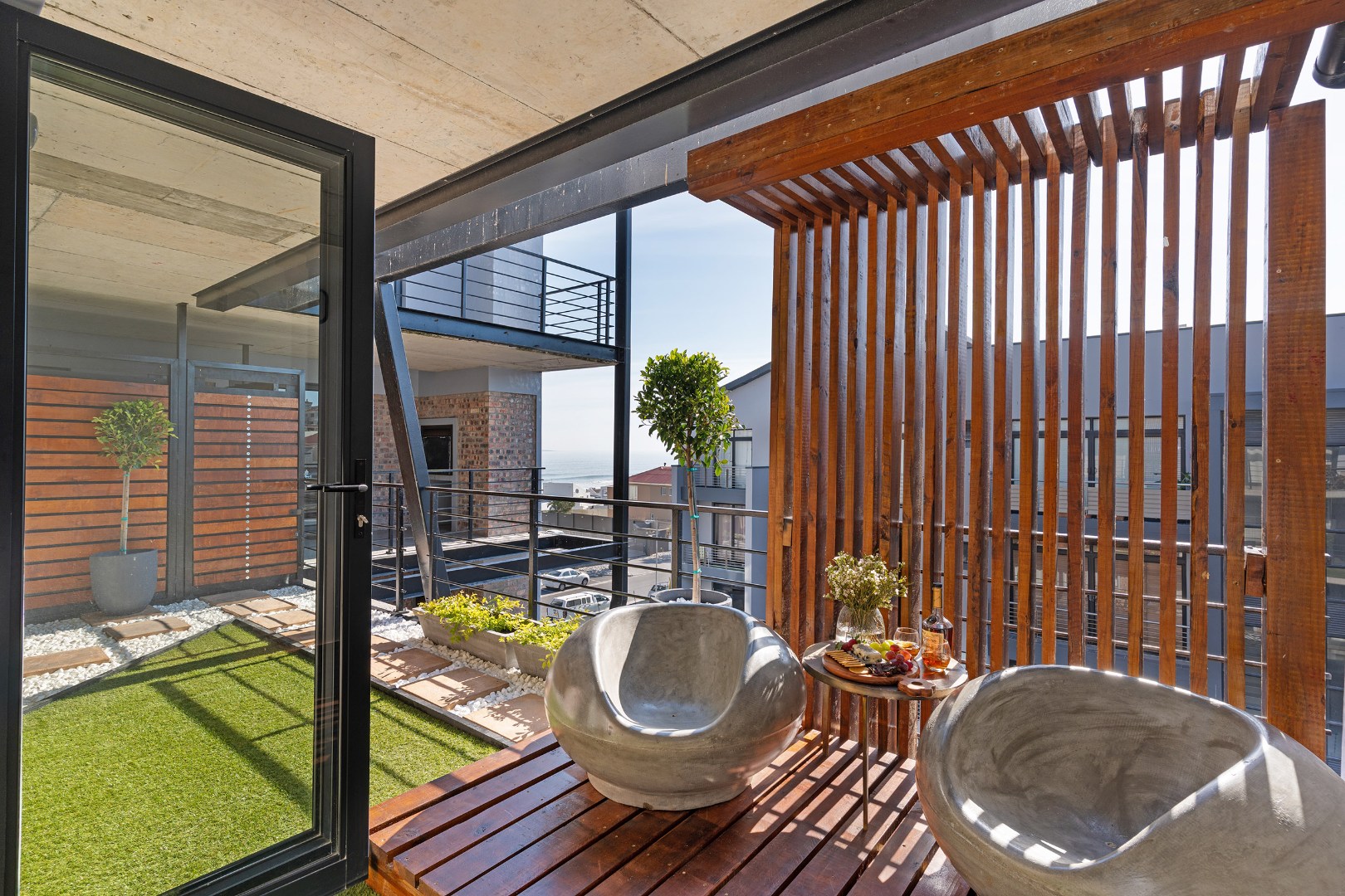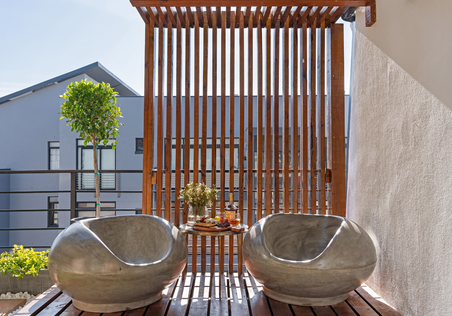The property includes a modern bathroom with a contemporary open-concept shower, reflecting the apartment's chic design. A key feature is the direct access to a private patio and balcony, offering a tranquil outdoor retreat and scenic views. This outdoor extension provides an ideal spot for relaxation or enjoying the coastal breeze, enhancing the overall living experience.