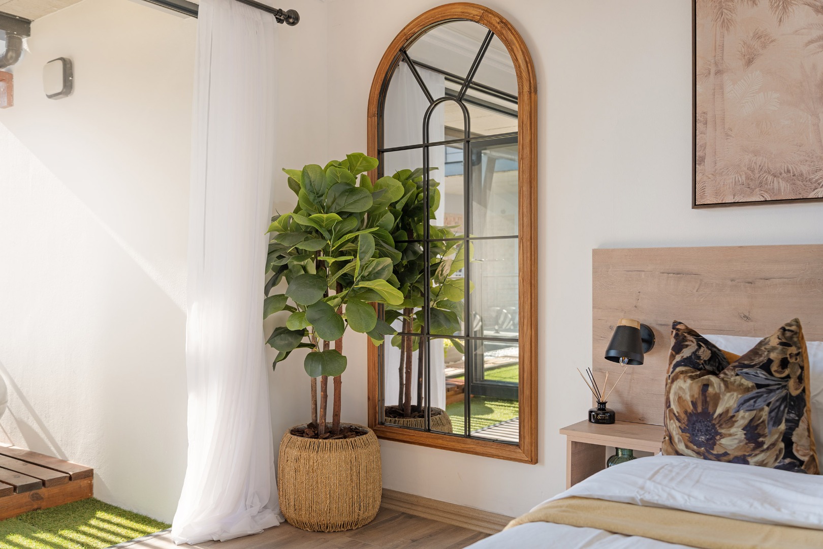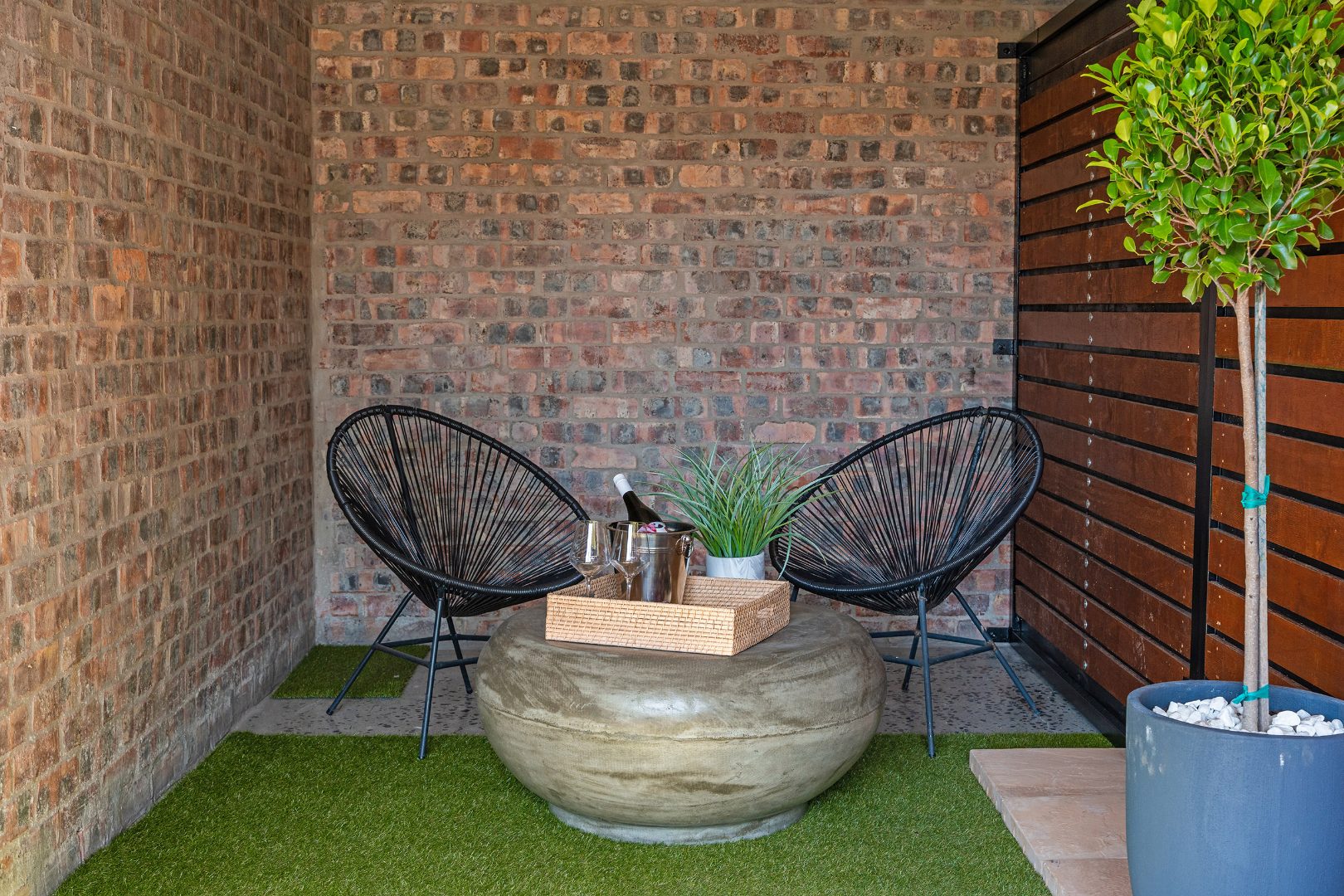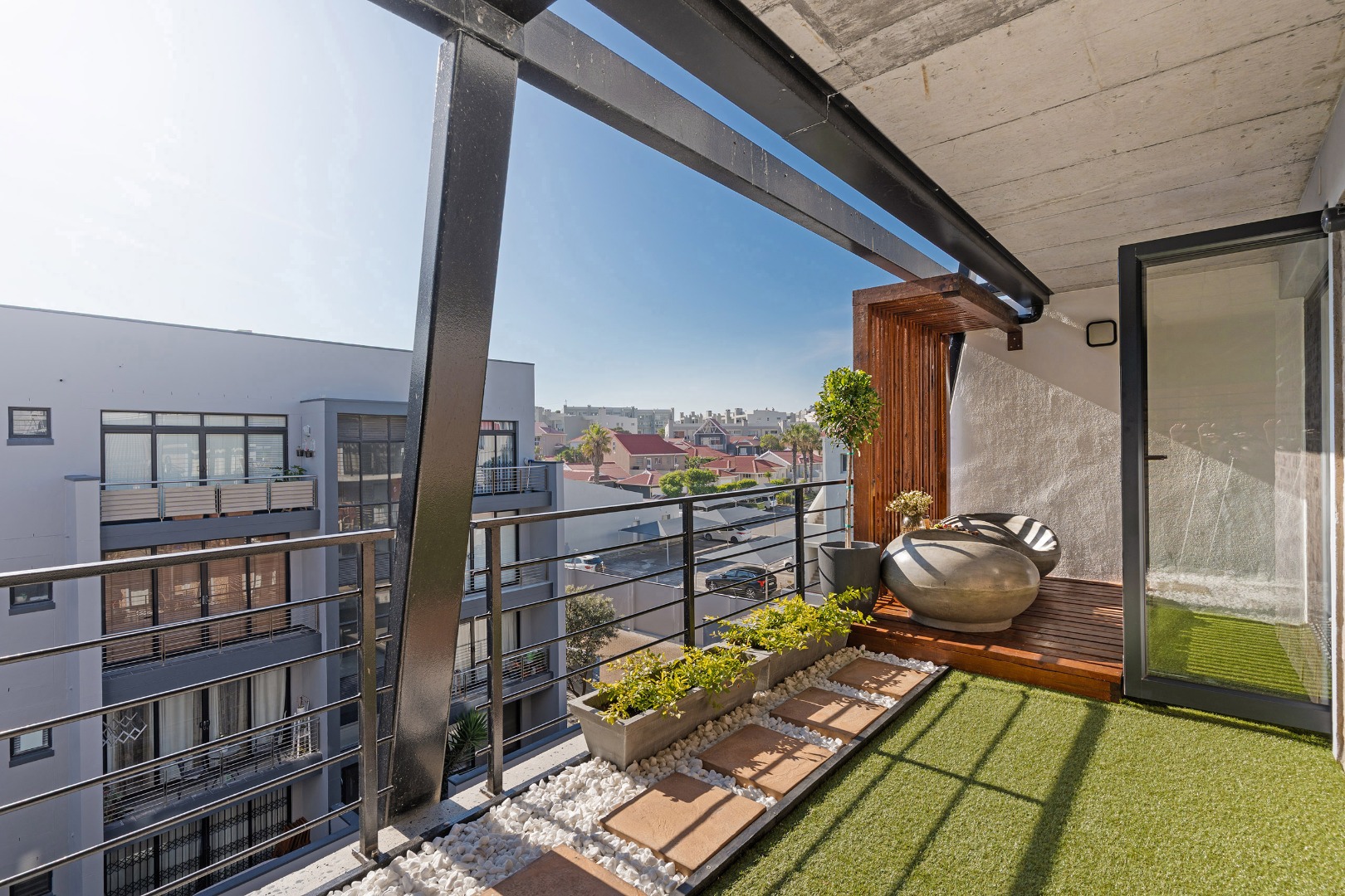The property includes a modern bathroom with a contemporary open-concept shower, reflecting the apartment's chic design. A key feature is the direct access to a private patio and balcony, offering a tranquil outdoor retreat and scenic views. This outdoor extension provides an ideal spot for relaxation or enjoying the coastal breeze, enhancing the overall living experience.