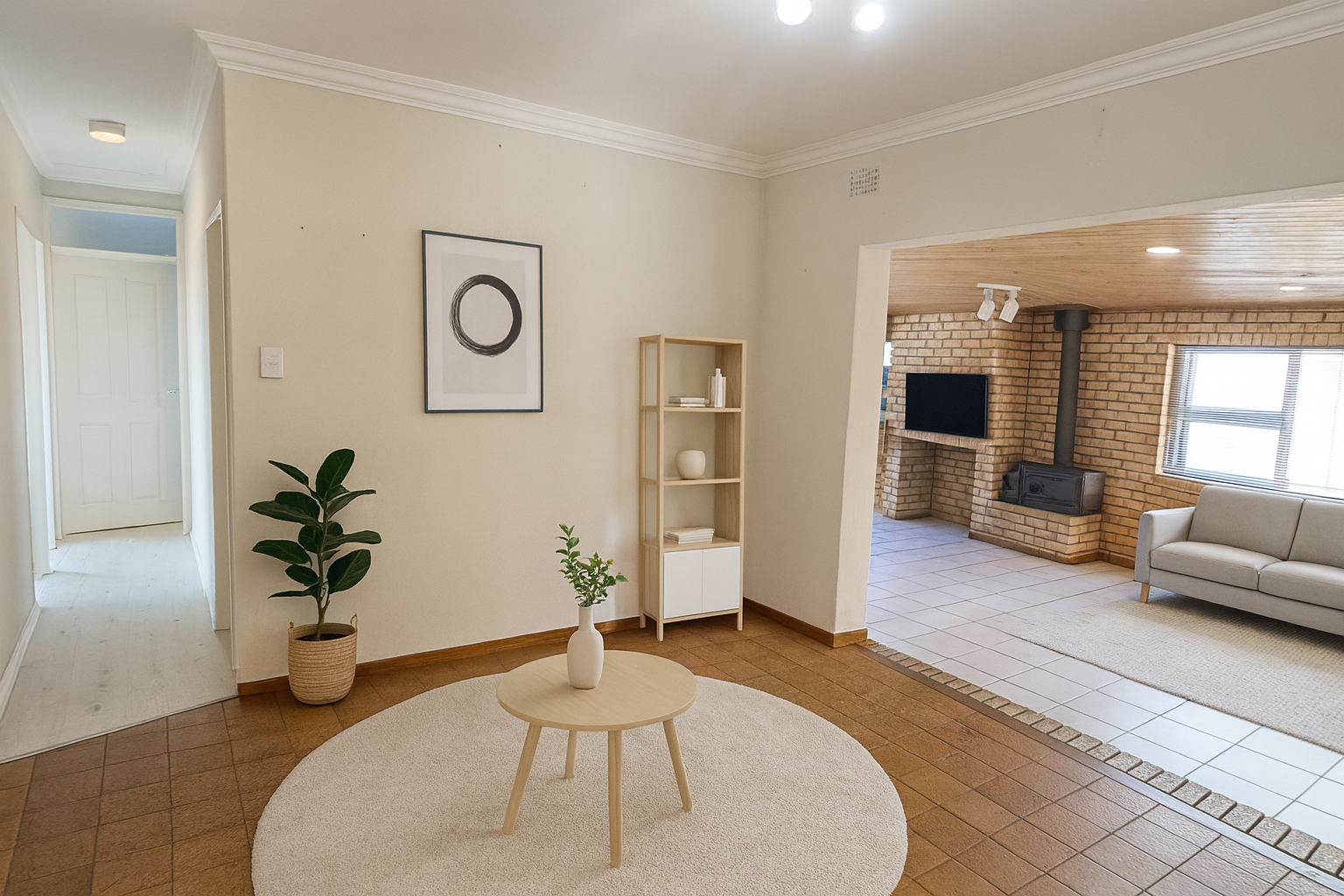 The spacious living and dining areas feature a charming brick complemented by a separate family TV room.