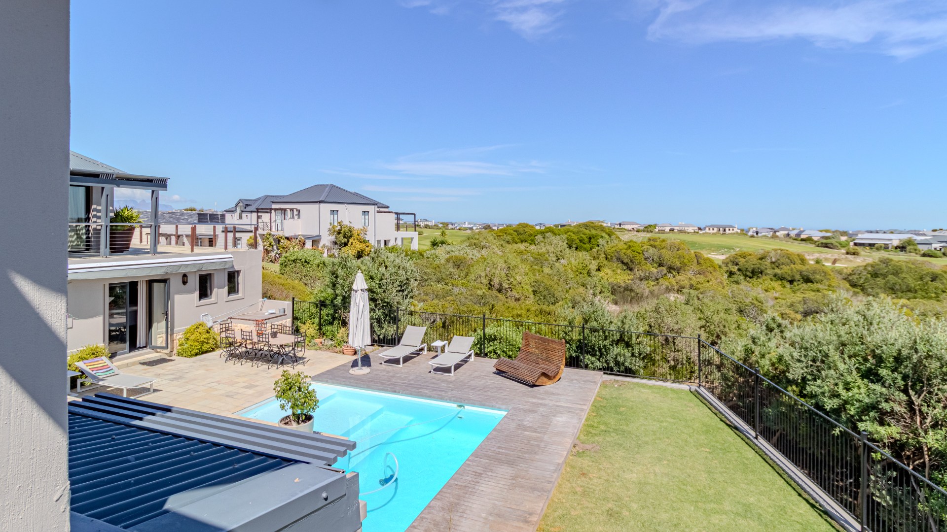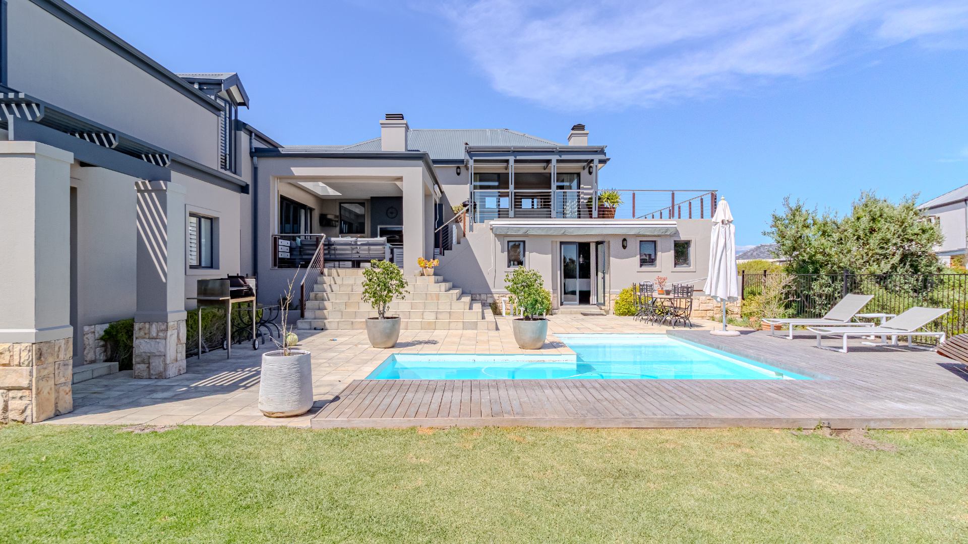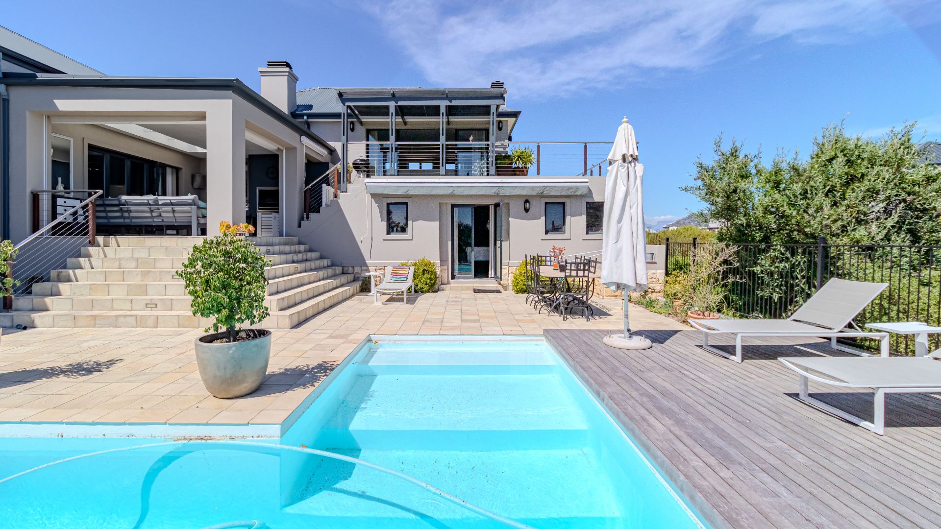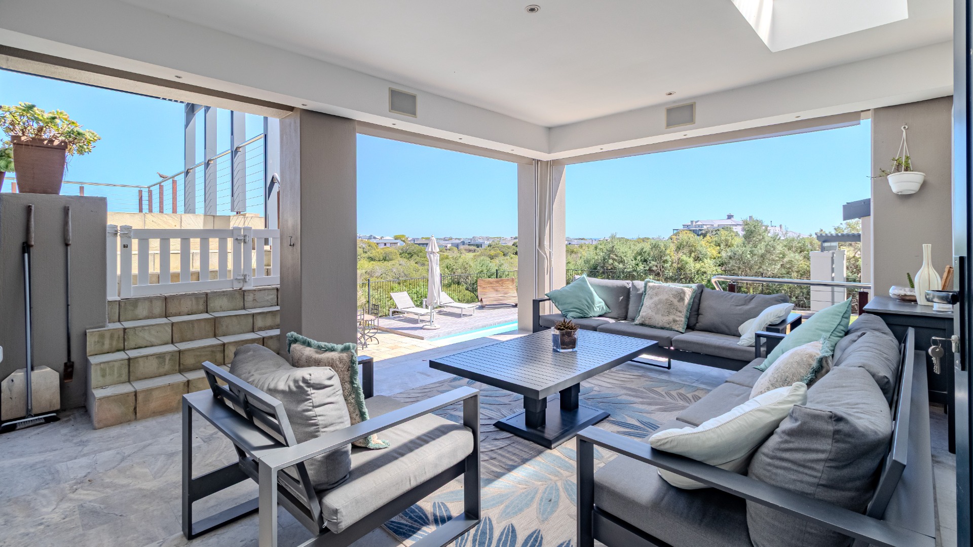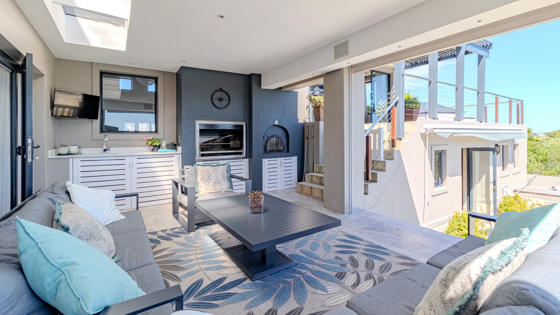 The dining and lounge area flow well out to the undercover patio with built in braai and drop down blinds. It has lovely views that sweep across the Estate. You have more than 180 degree views. Whilst enjoying the outdoor space, you overlook the pool and garden that are well maintained.