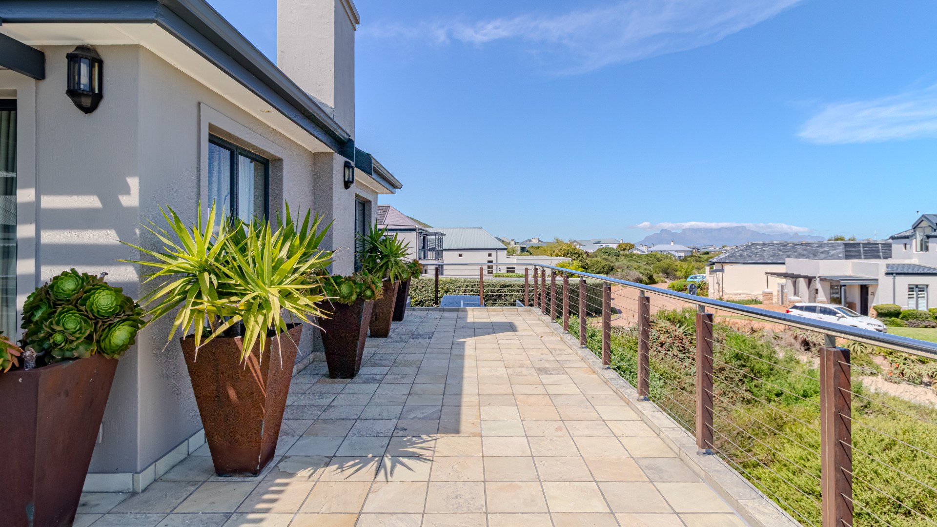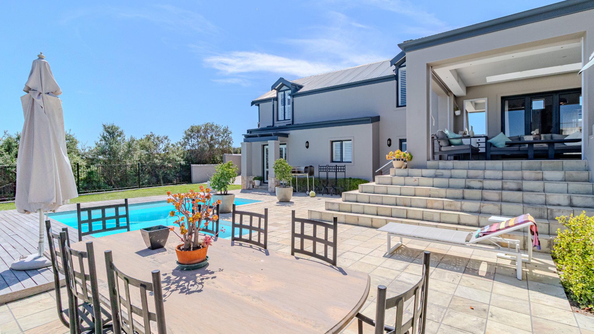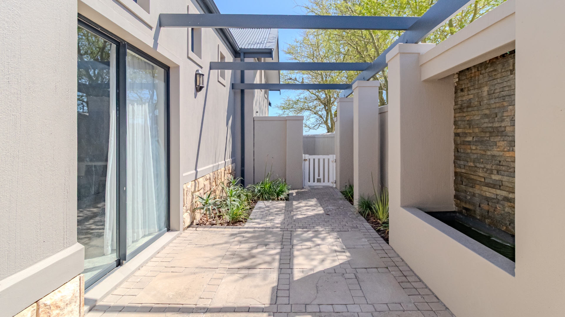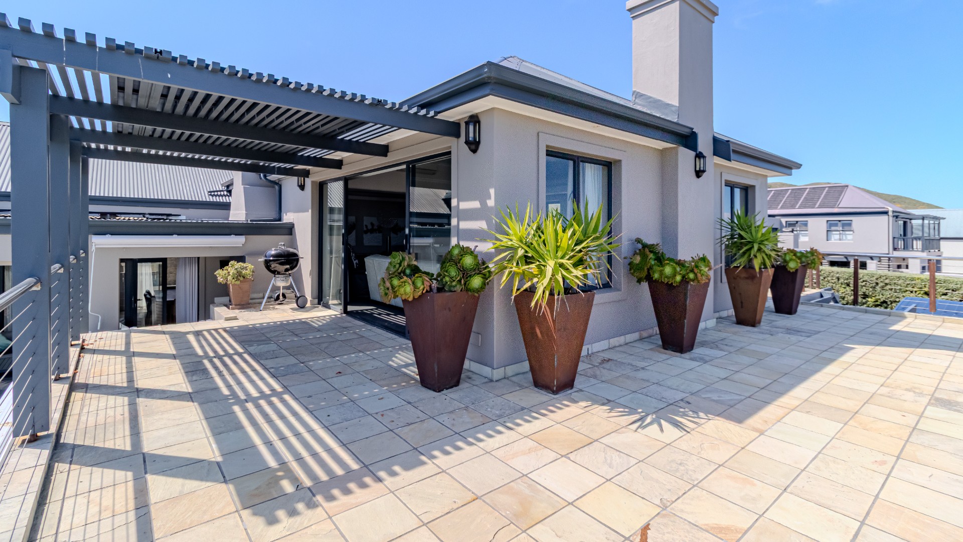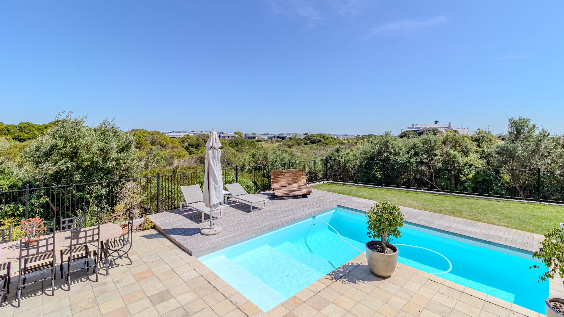 The dining and lounge area flow well out to the undercover patio with built in braai and drop down blinds. It has lovely views that sweep across the Estate. You have more than 180 degree views. Whilst enjoying the outdoor space, you overlook the pool and garden that are well maintained.