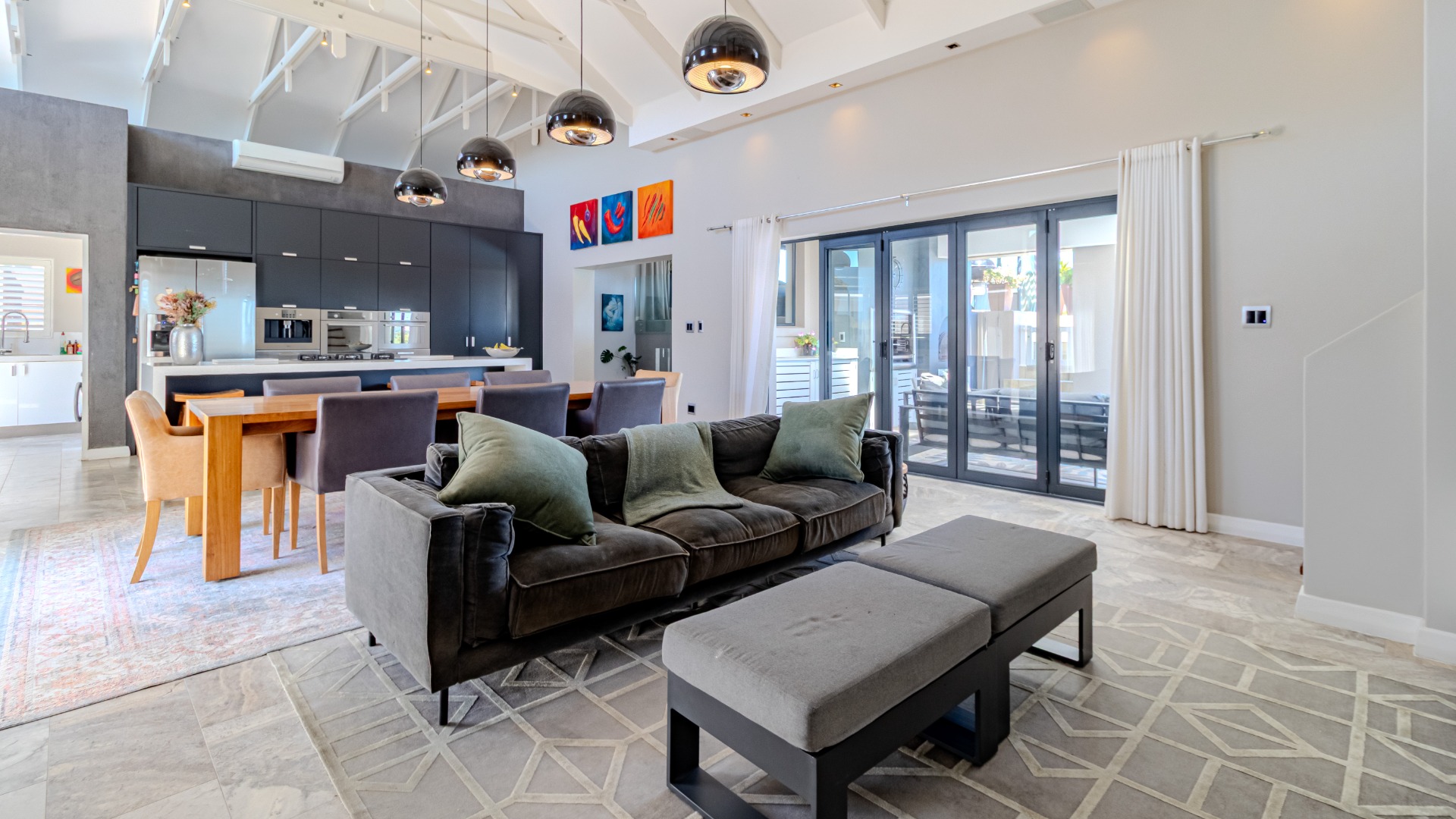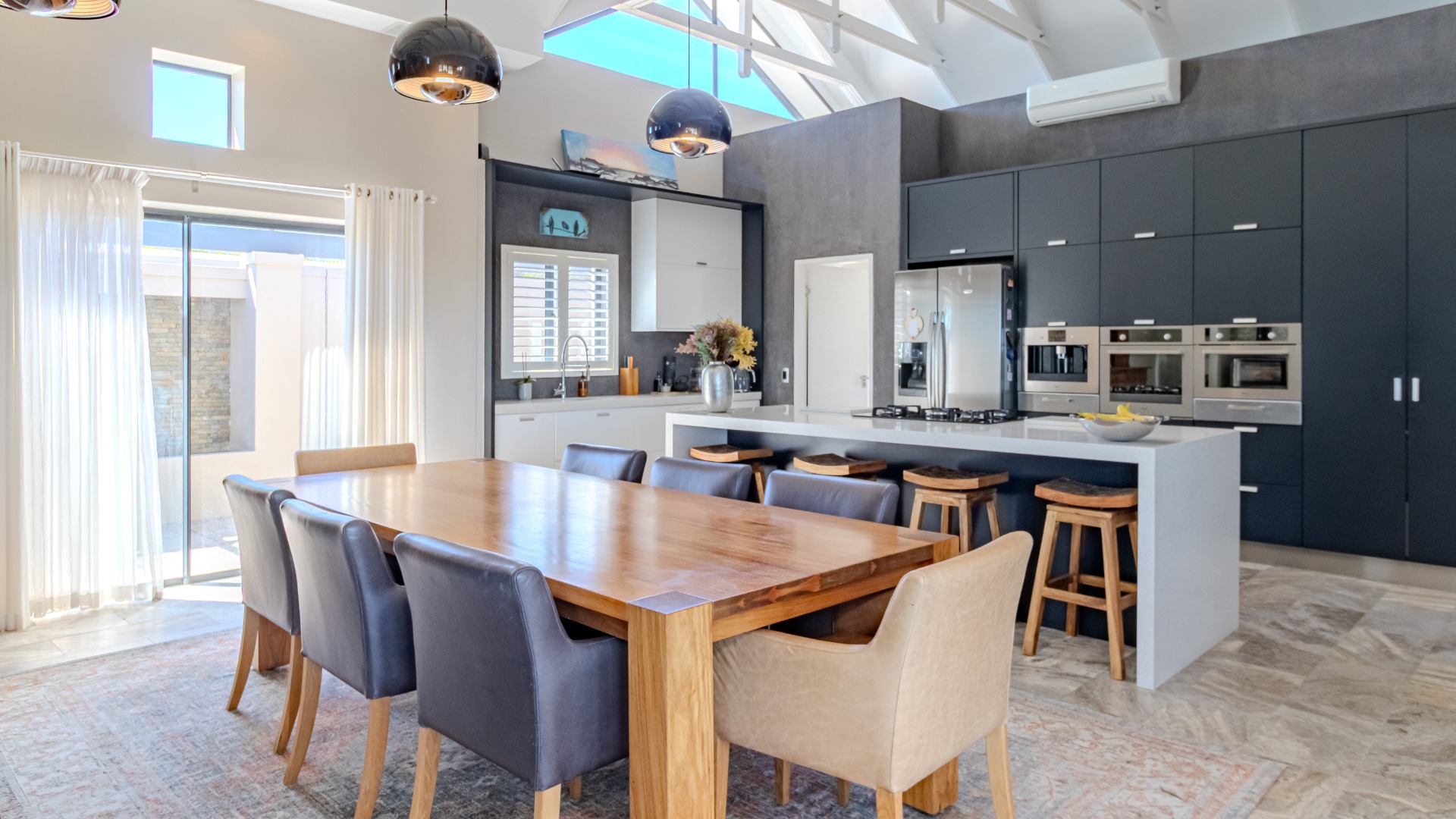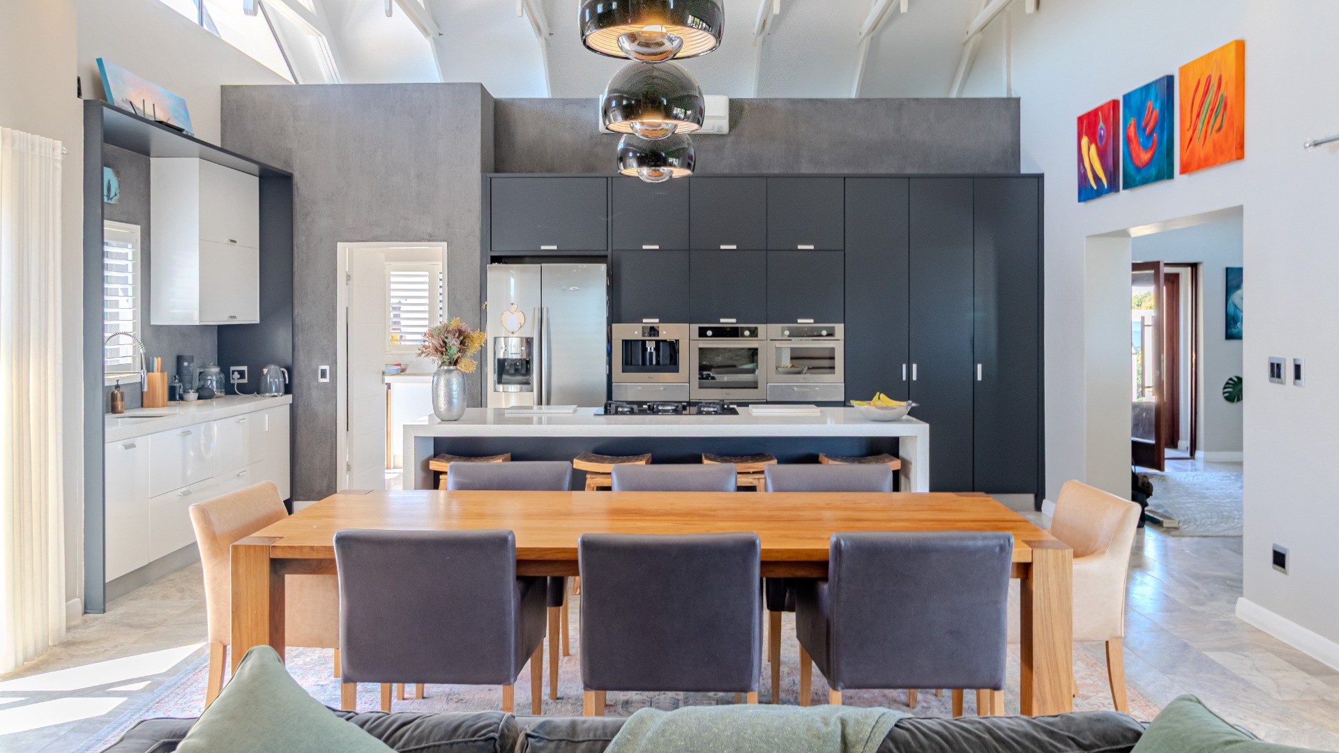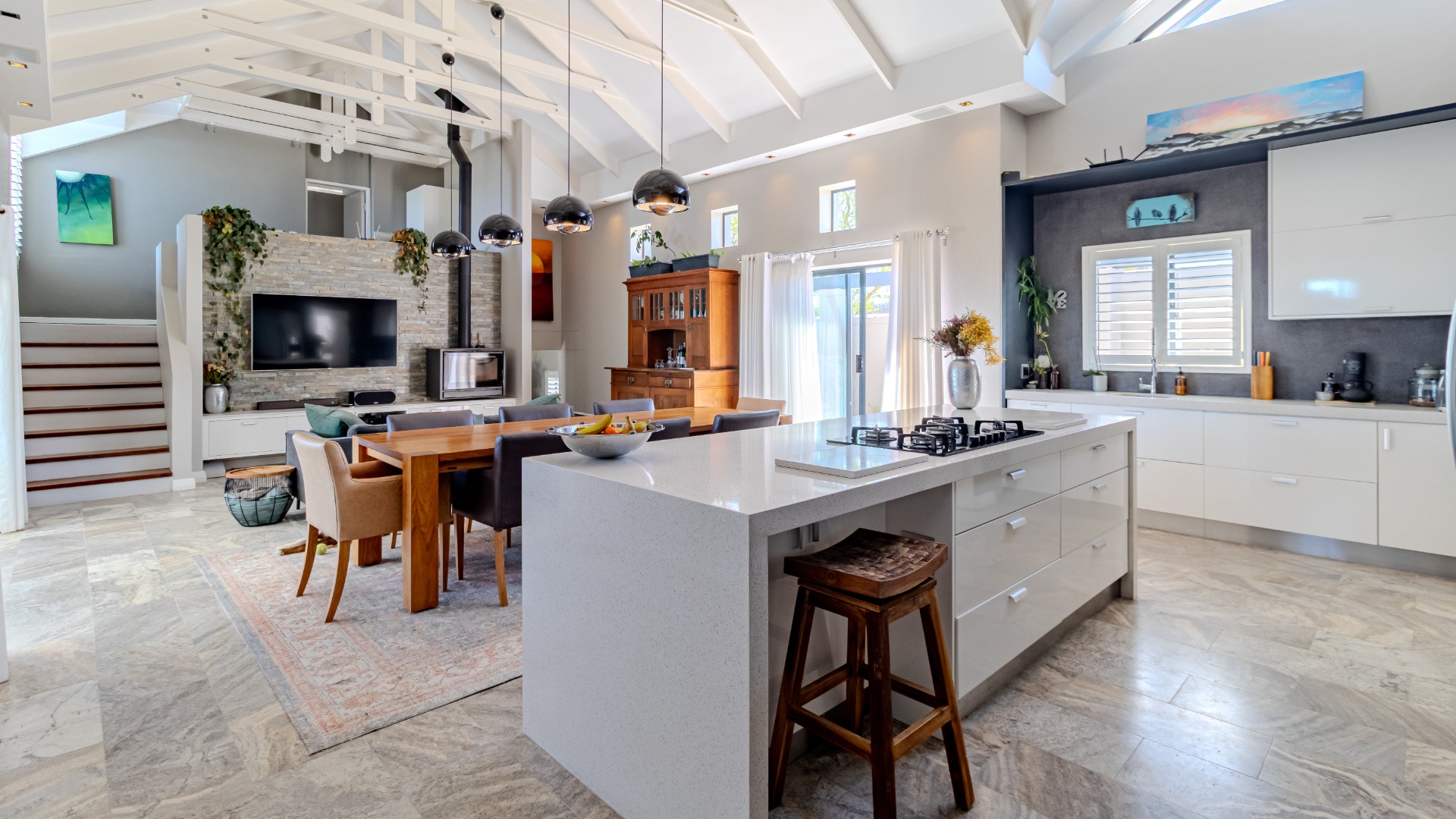 The kitchen is set in a double volume area with lot of cupboard space. This large area is ideal as the kitchen is open plan to the dining and the lounge. There is a lovely fireplace, with beautiful lighting for that cosy feel. The kitchen has fully integrated appliances (except the fridge). It has a large separate scullery.