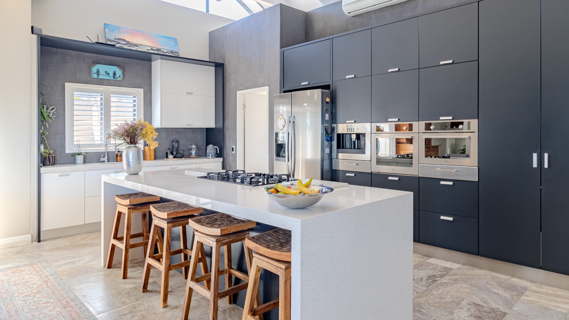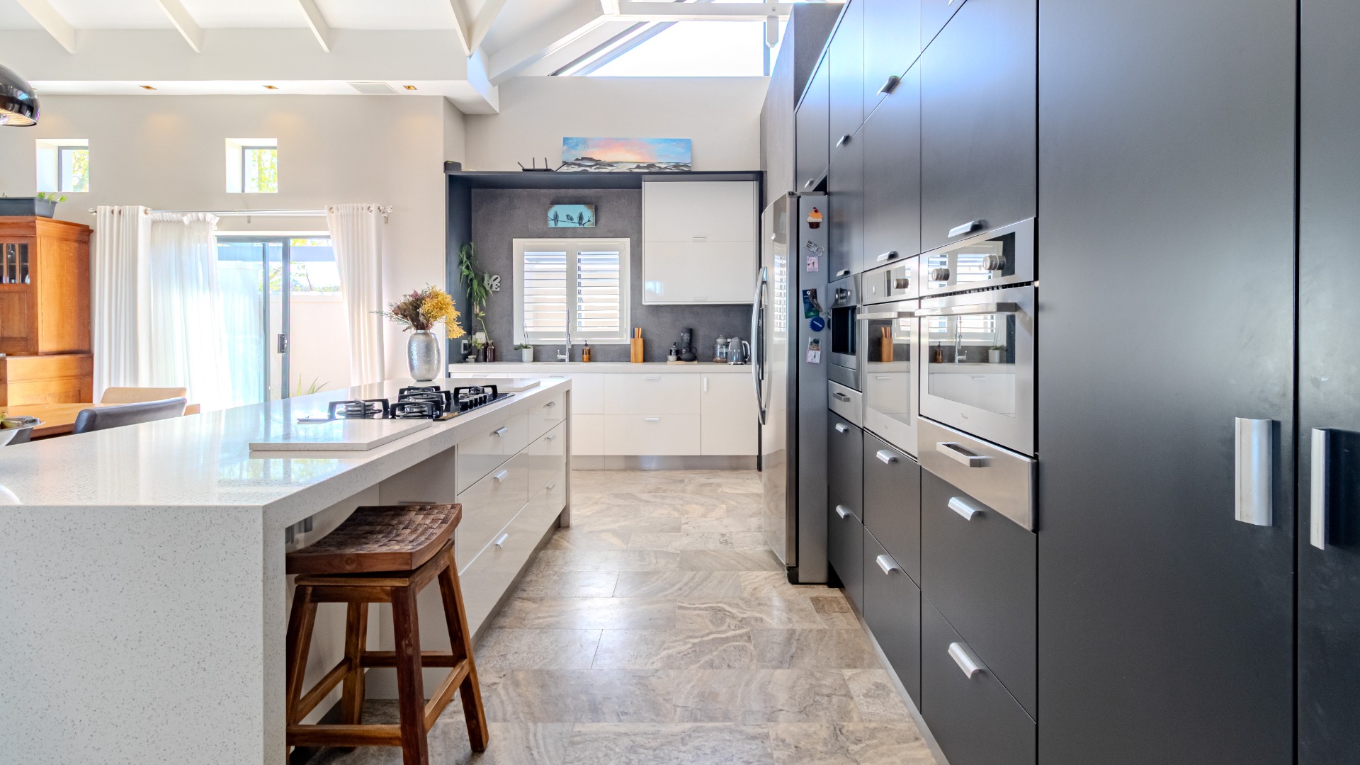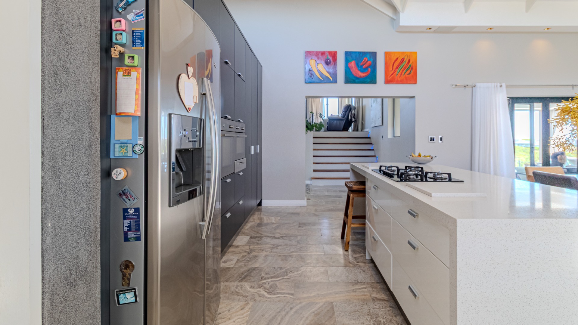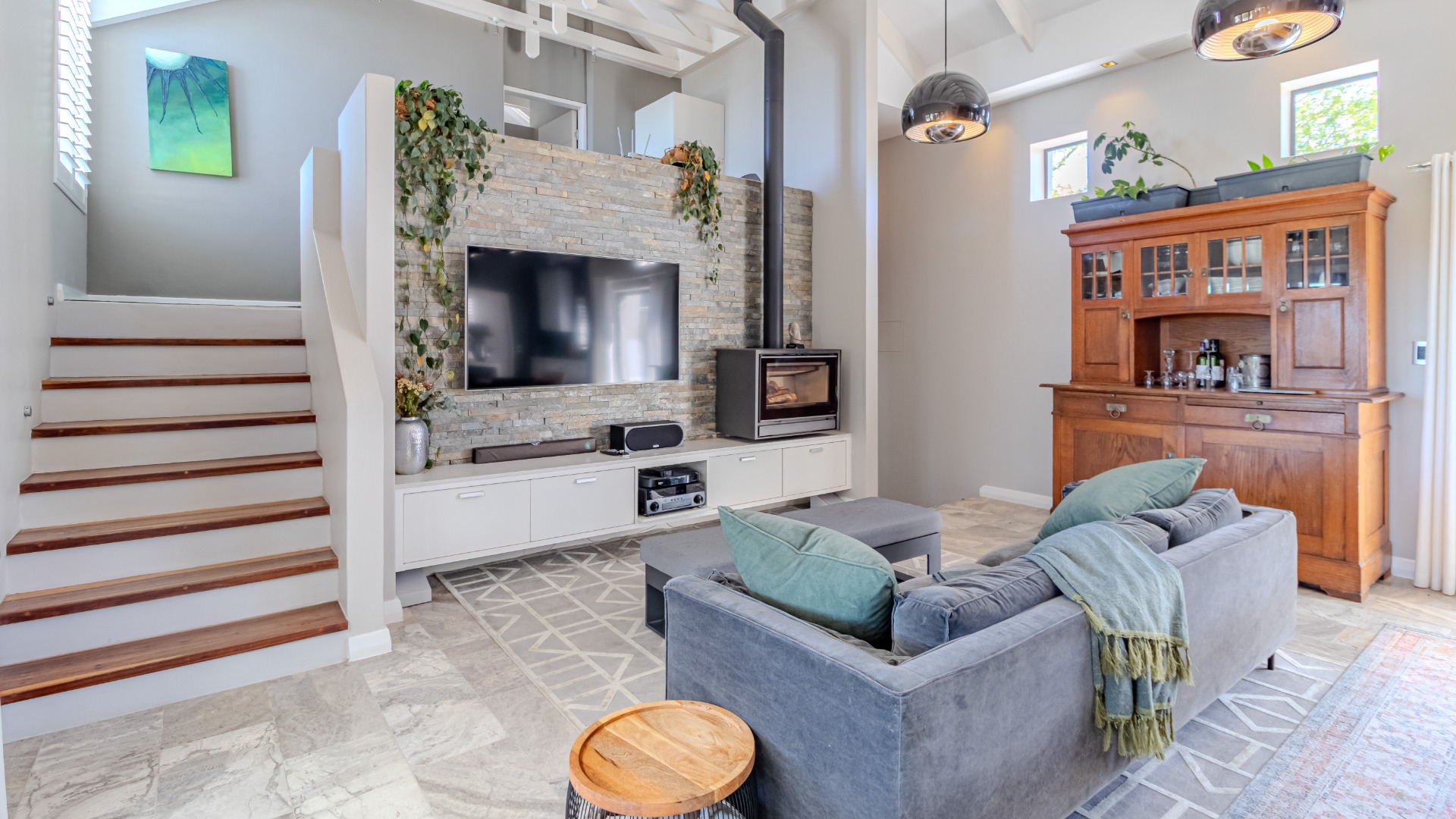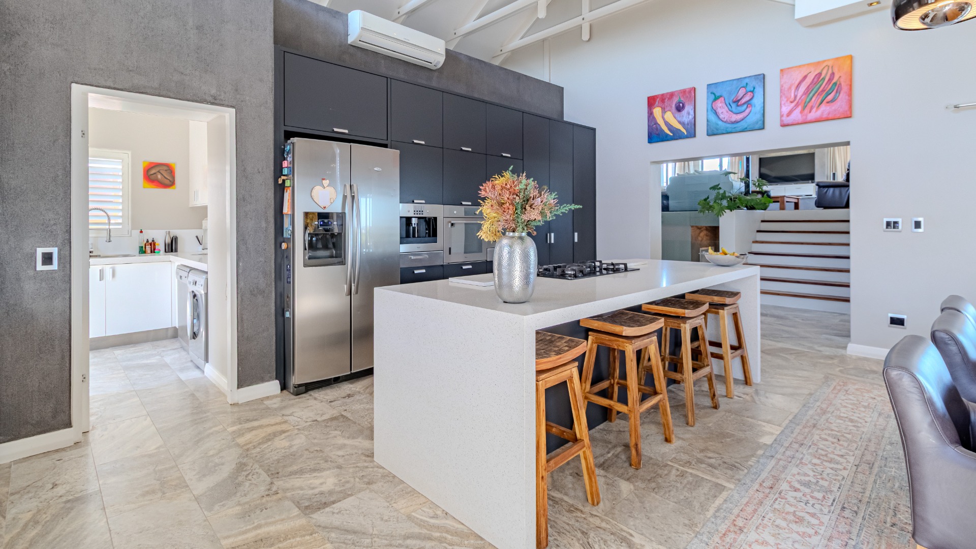 The kitchen is set in a double volume area with lot of cupboard space. This large area is ideal as the kitchen is open plan to the dining and the lounge. There is a lovely fireplace, with beautiful lighting for that cosy feel. The kitchen has fully integrated appliances (except the fridge). It has a large separate scullery.