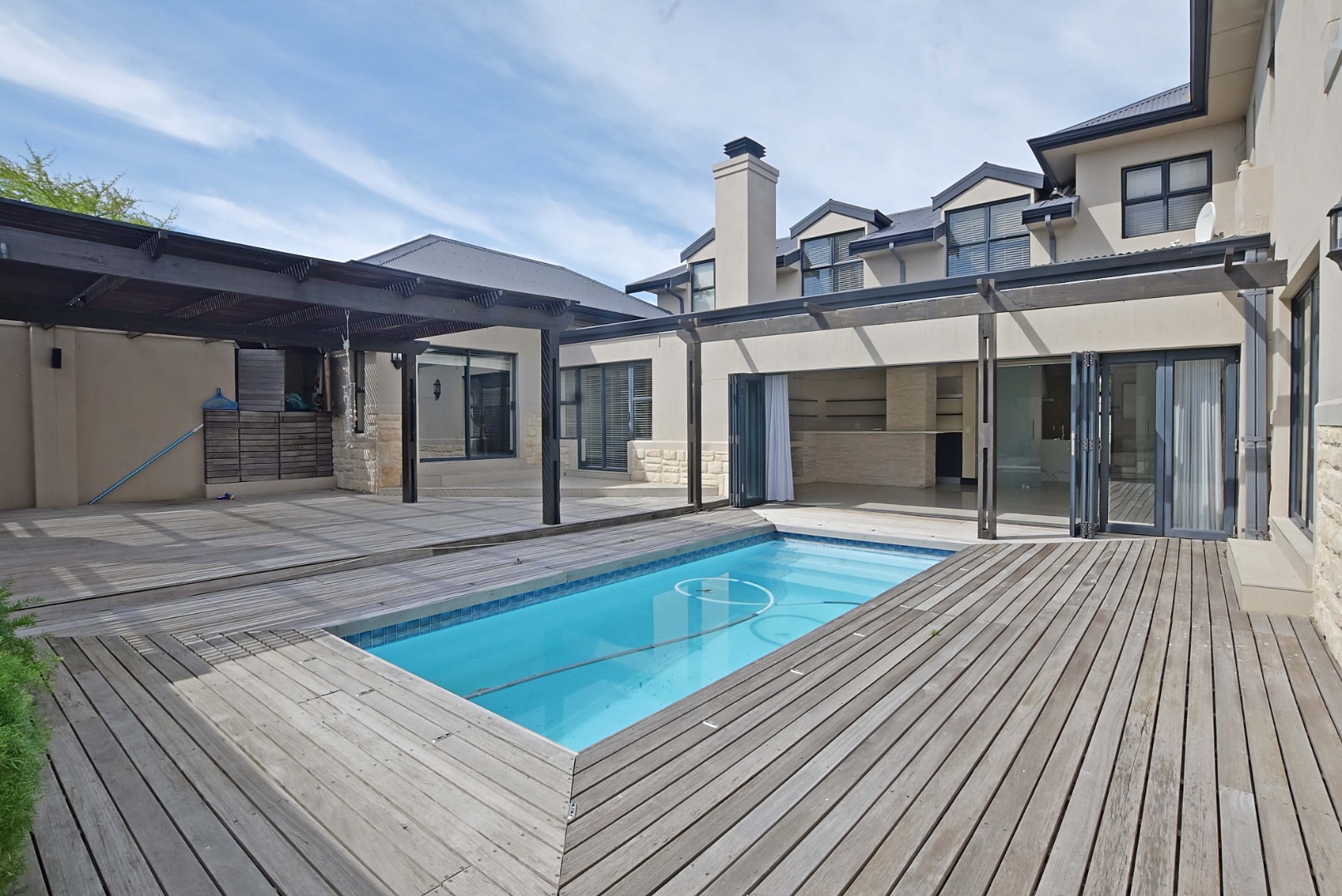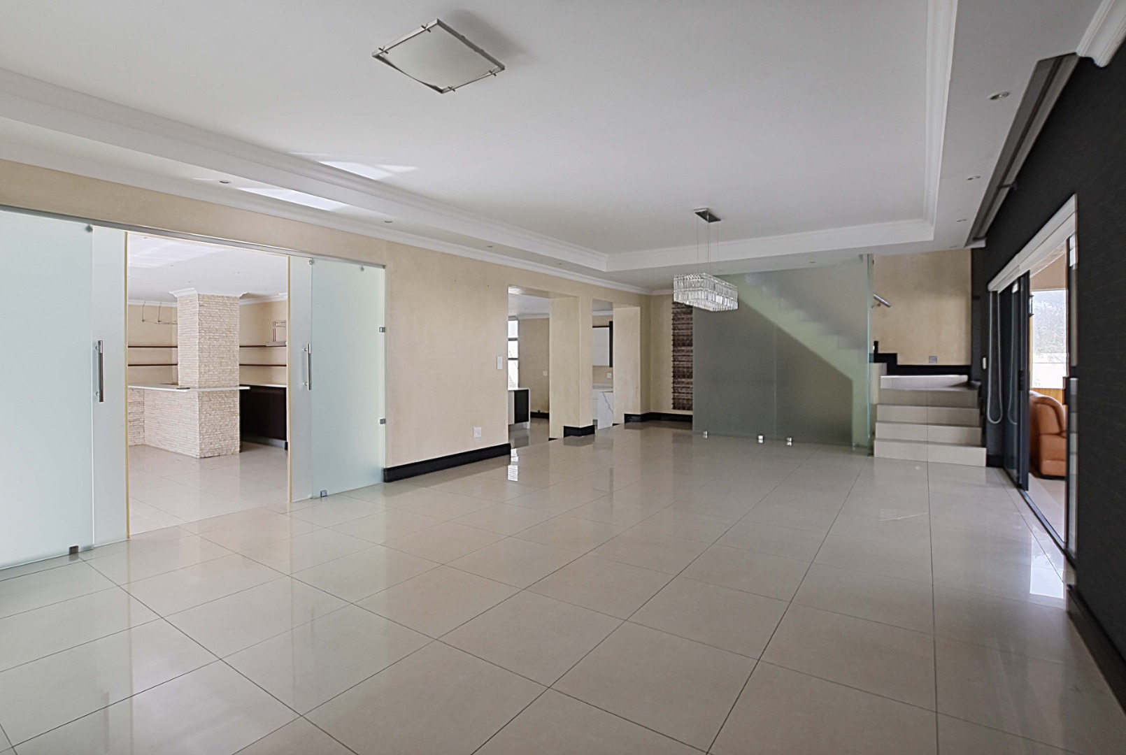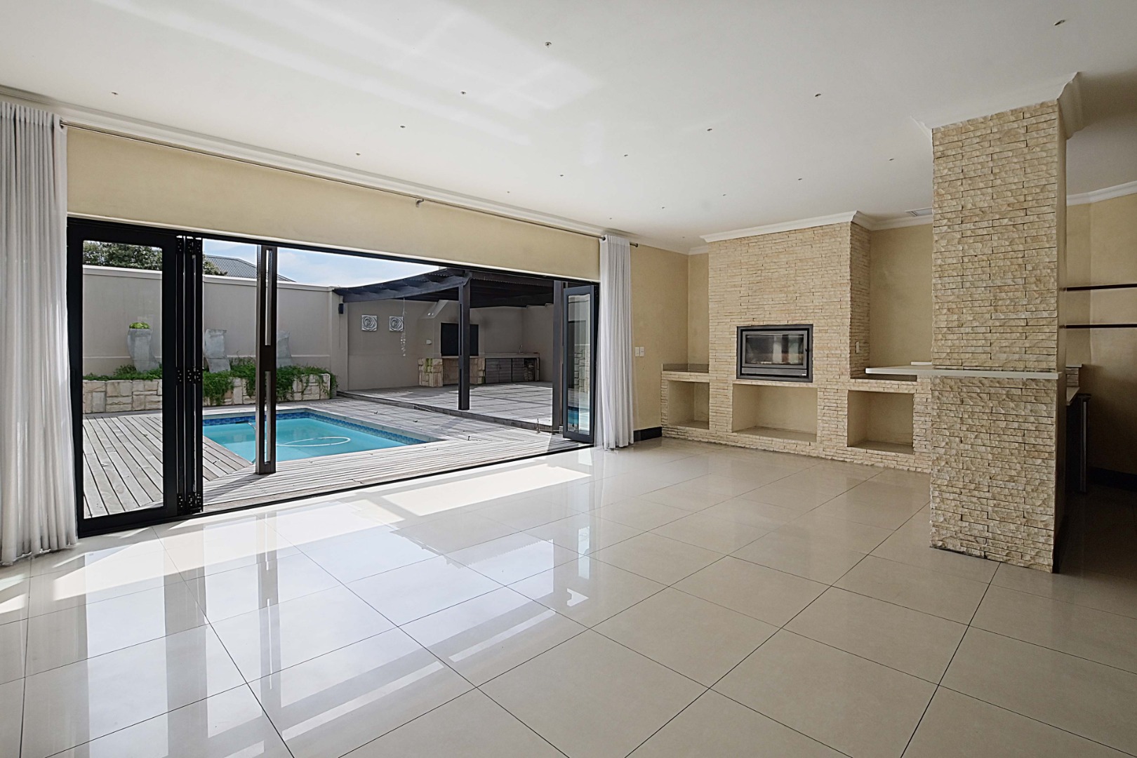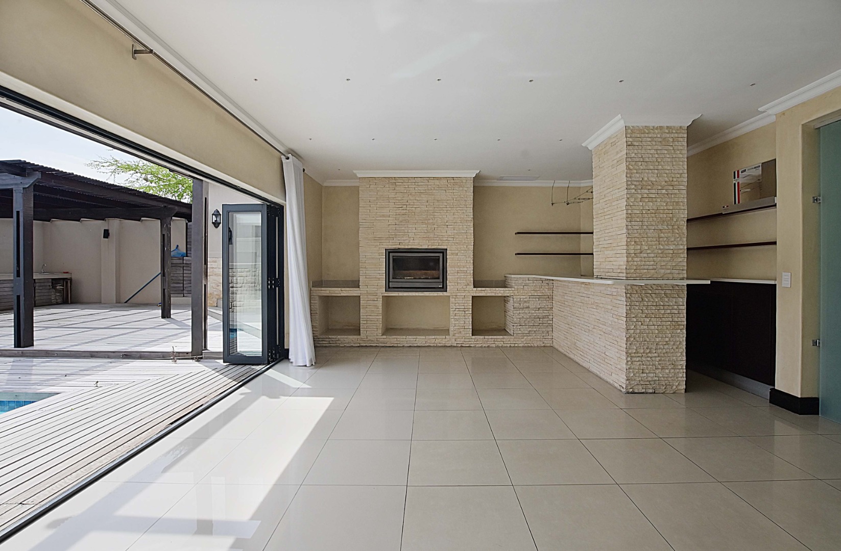 The open plan lounge and bar area, flow out to the private, North Facing pool and outdoor braai area. The Kitchen is open plan and leads out to the 2nd lounge/dining room area. It has a dual fireplace. This leads to a separate cinema room/ tv room. There is also a patio on the outside West side of the home. There too are wine racks as a feature wall, just under the stairs.