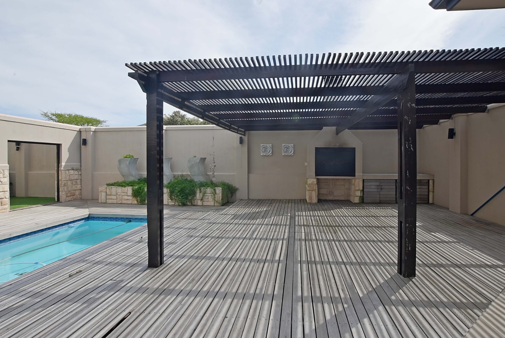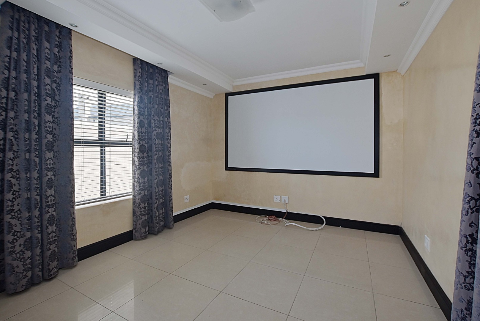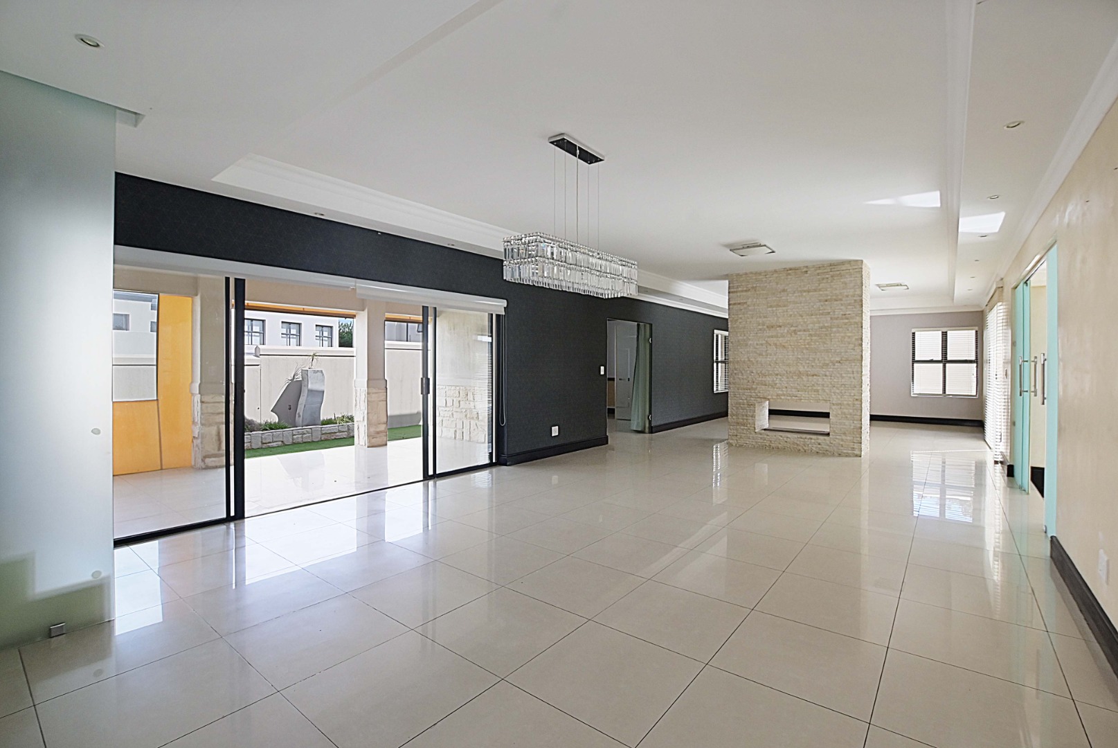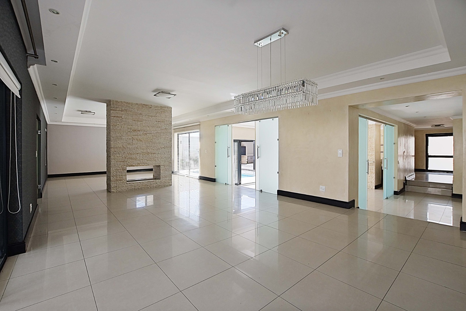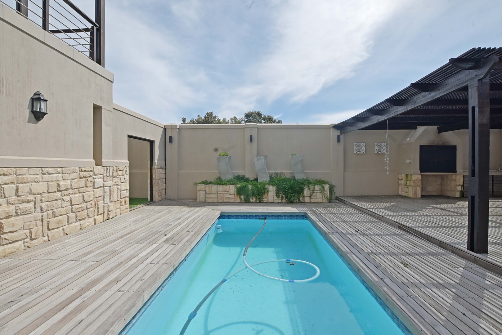 The open plan lounge and bar area, flow out to the private, North Facing pool and outdoor braai area. The Kitchen is open plan and leads out to the 2nd lounge/dining room area. It has a dual fireplace. This leads to a separate cinema room/ tv room. There is also a patio on the outside West side of the home. There too are wine racks as a feature wall, just under the stairs.