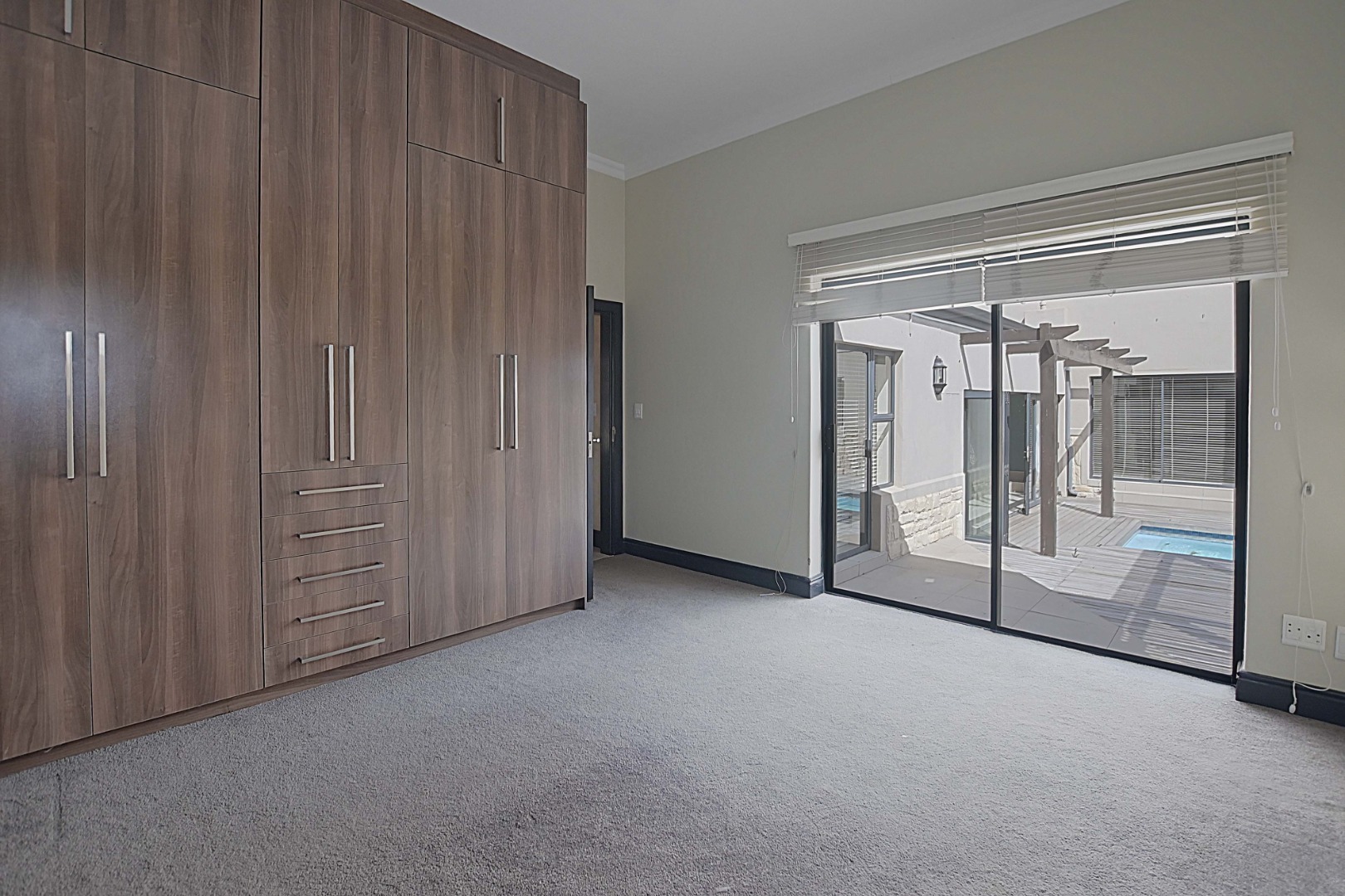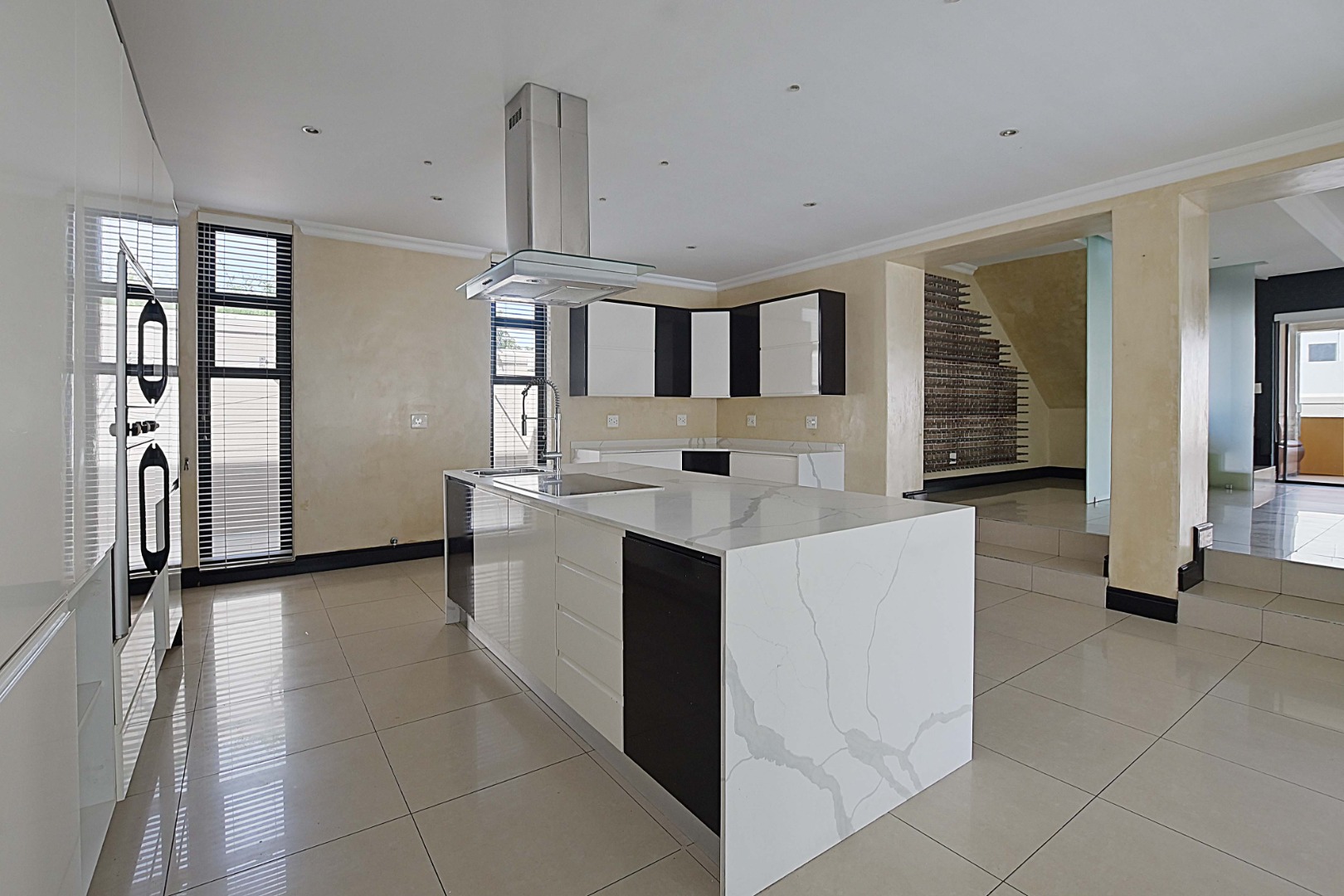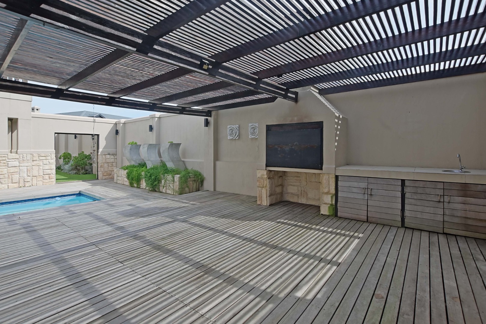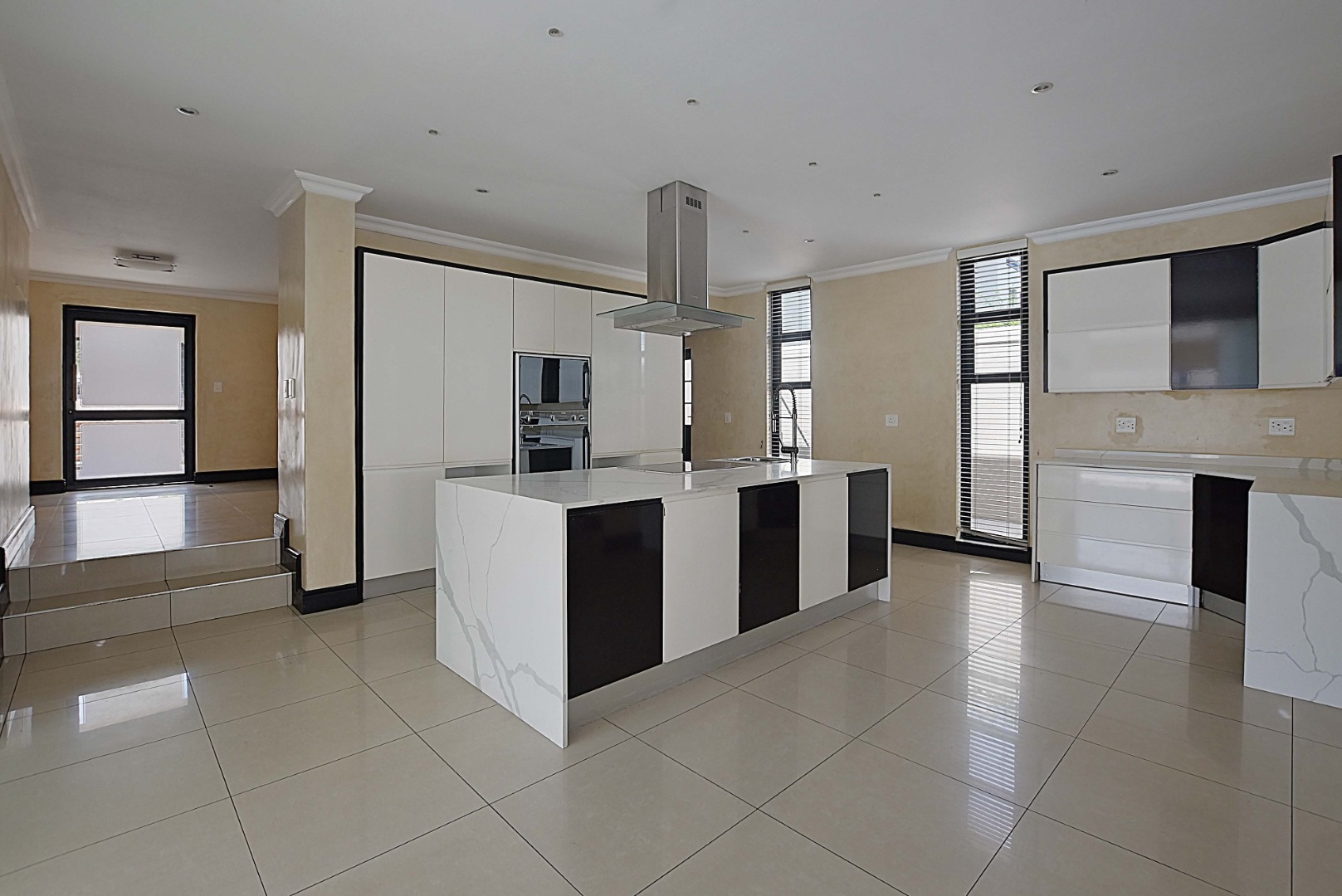 The open plan lounge and bar area, flow out to the private, North Facing pool and outdoor braai area. The Kitchen is open plan and leads out to the 2nd lounge/dining room area. It has a dual fireplace. This leads to a separate cinema room/ tv room. There is also a patio on the outside West side of the home. There too are wine racks as a feature wall, just under the stairs.
