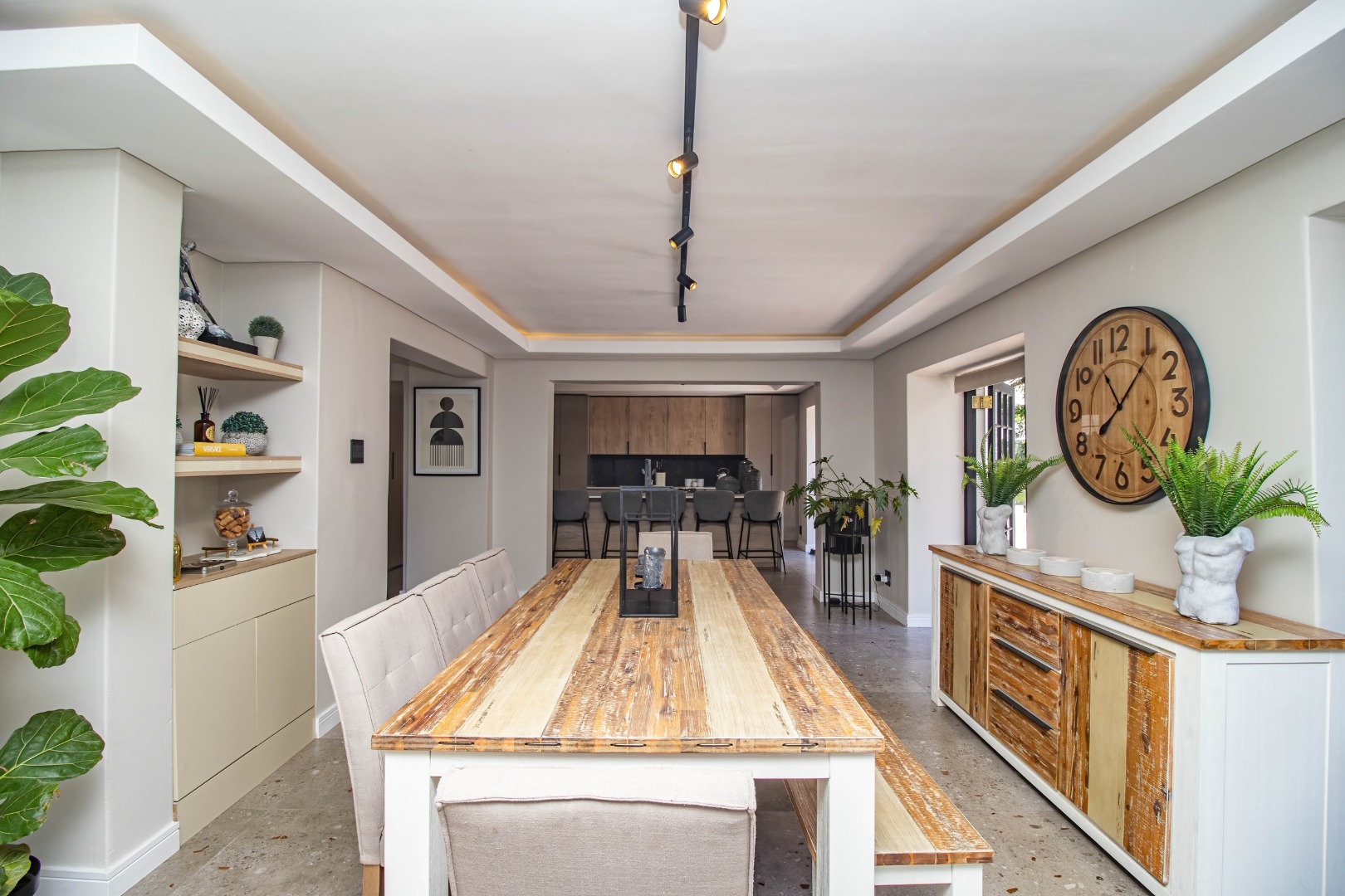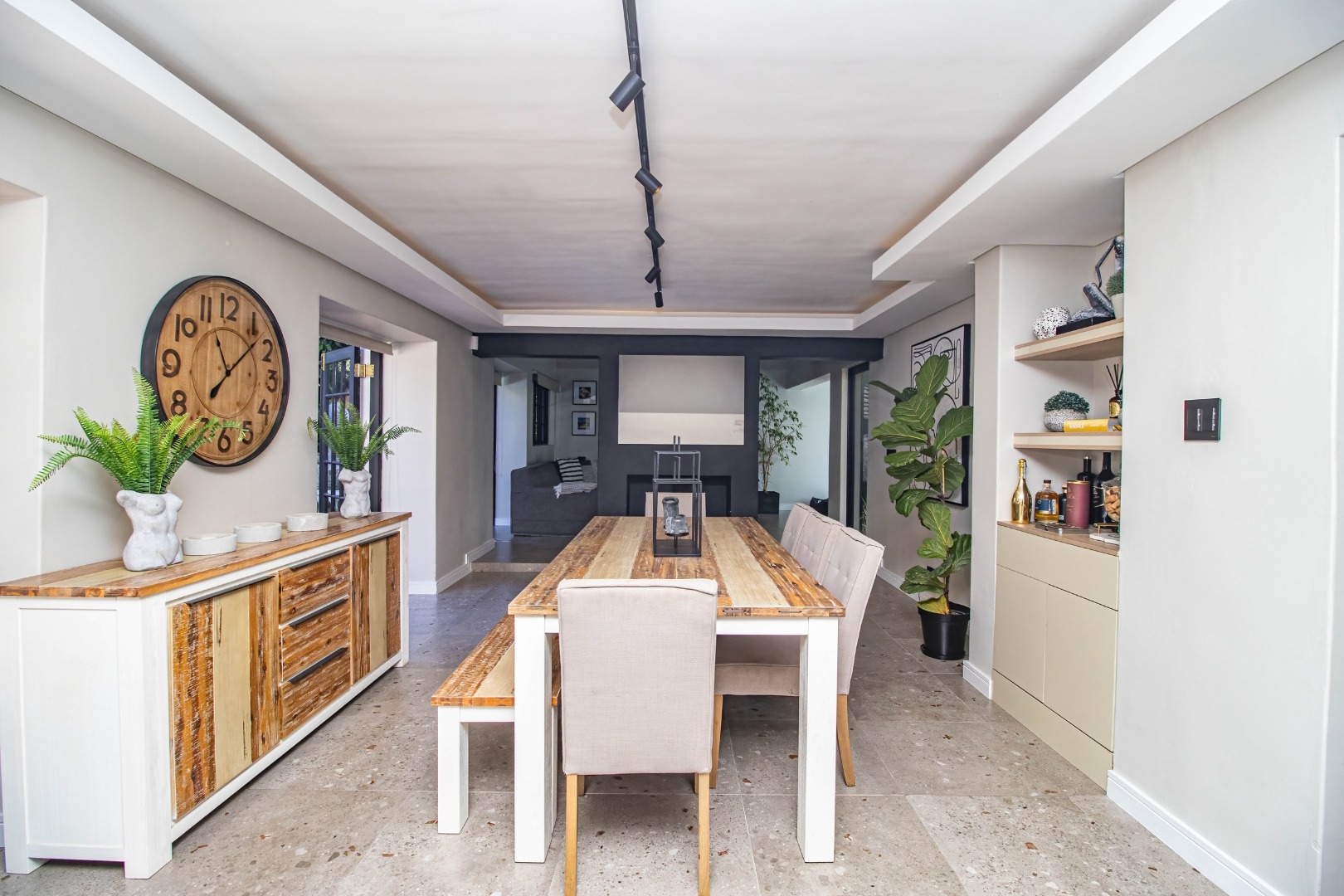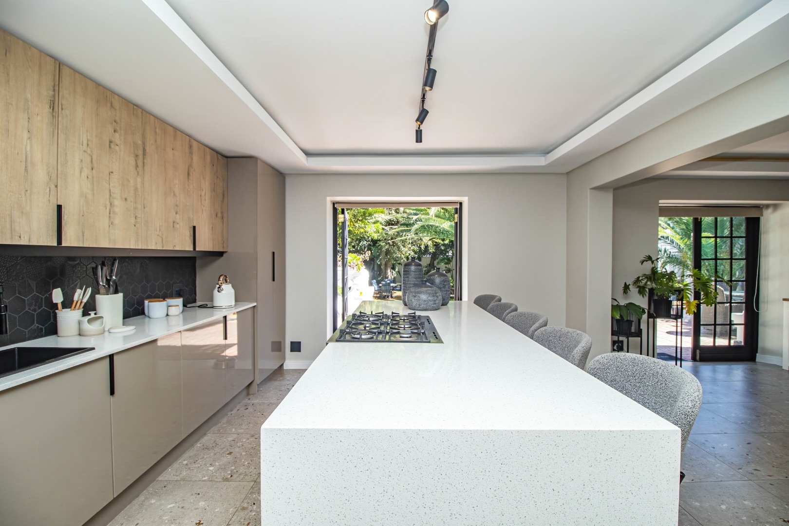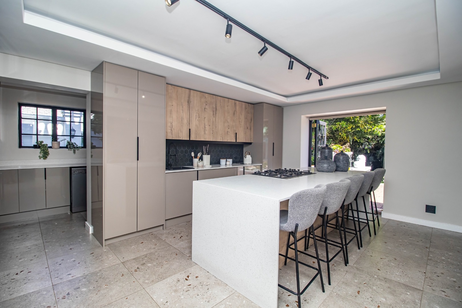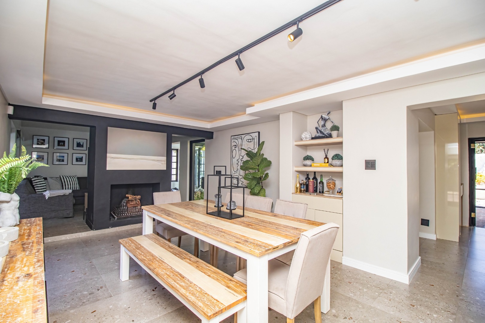 The modern open plan kitchen offers sleek finishes, soft close cupboards, and ample storage, it also has a separate scullery. The kitchen flows nicely into the dining and lounge areas. There is also a fireplace between the dining room and lounge. The large windows and doors offer lots of natural light, creating a warm and inviting atmosphere.