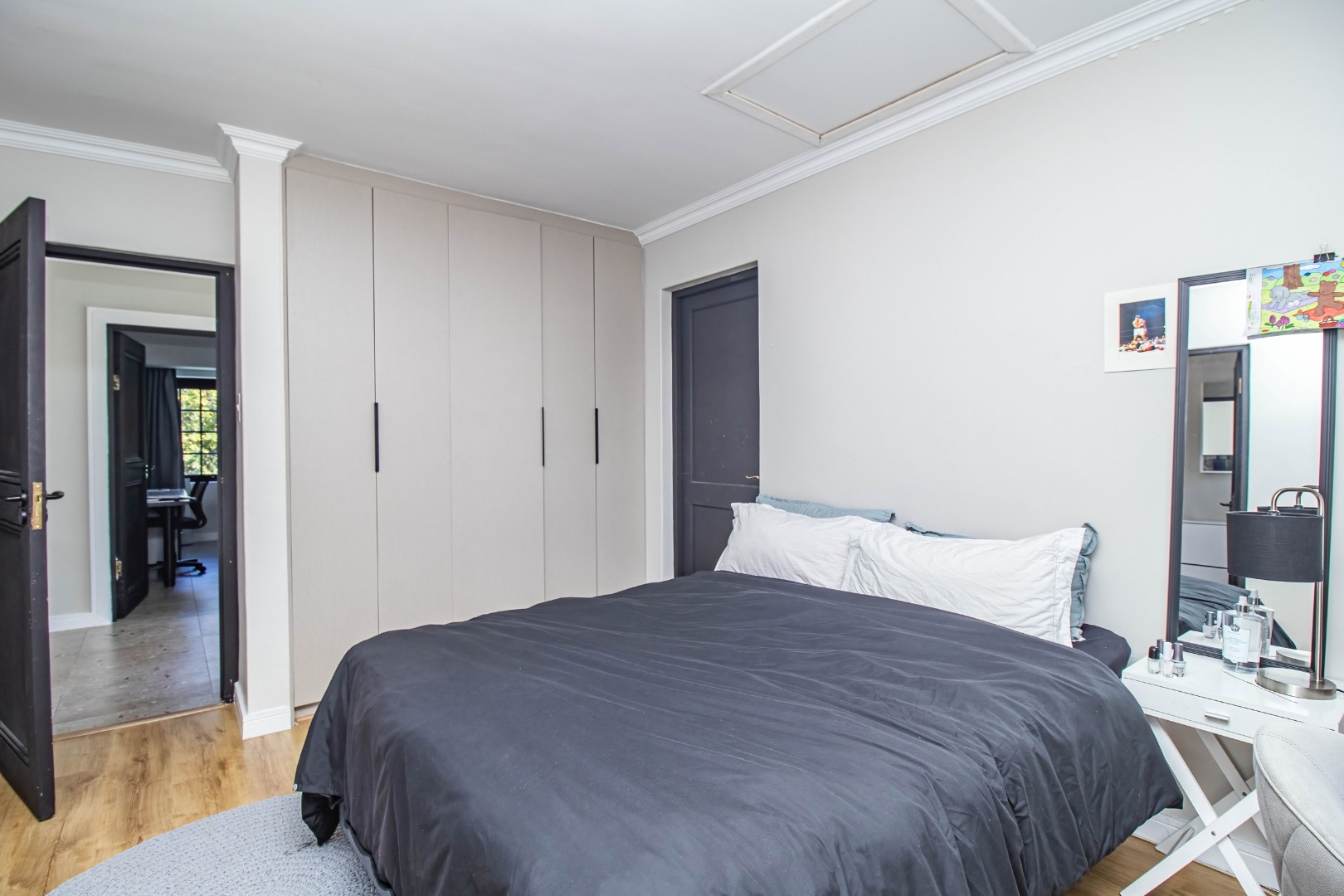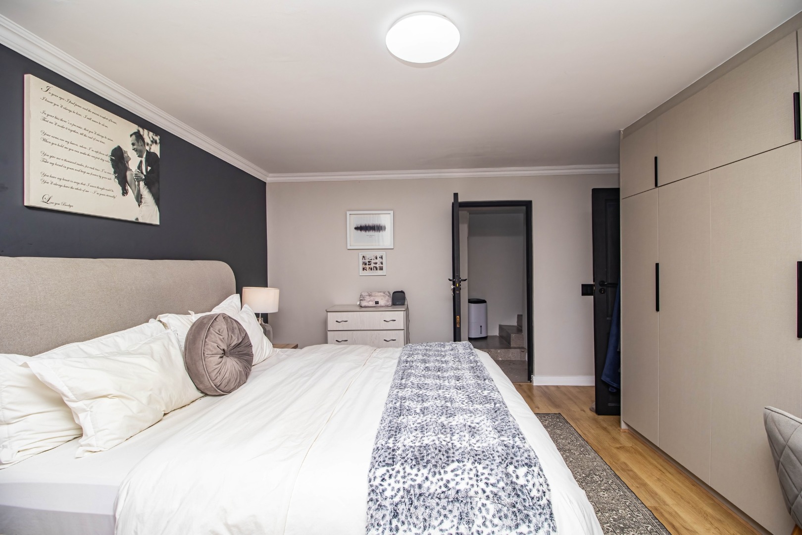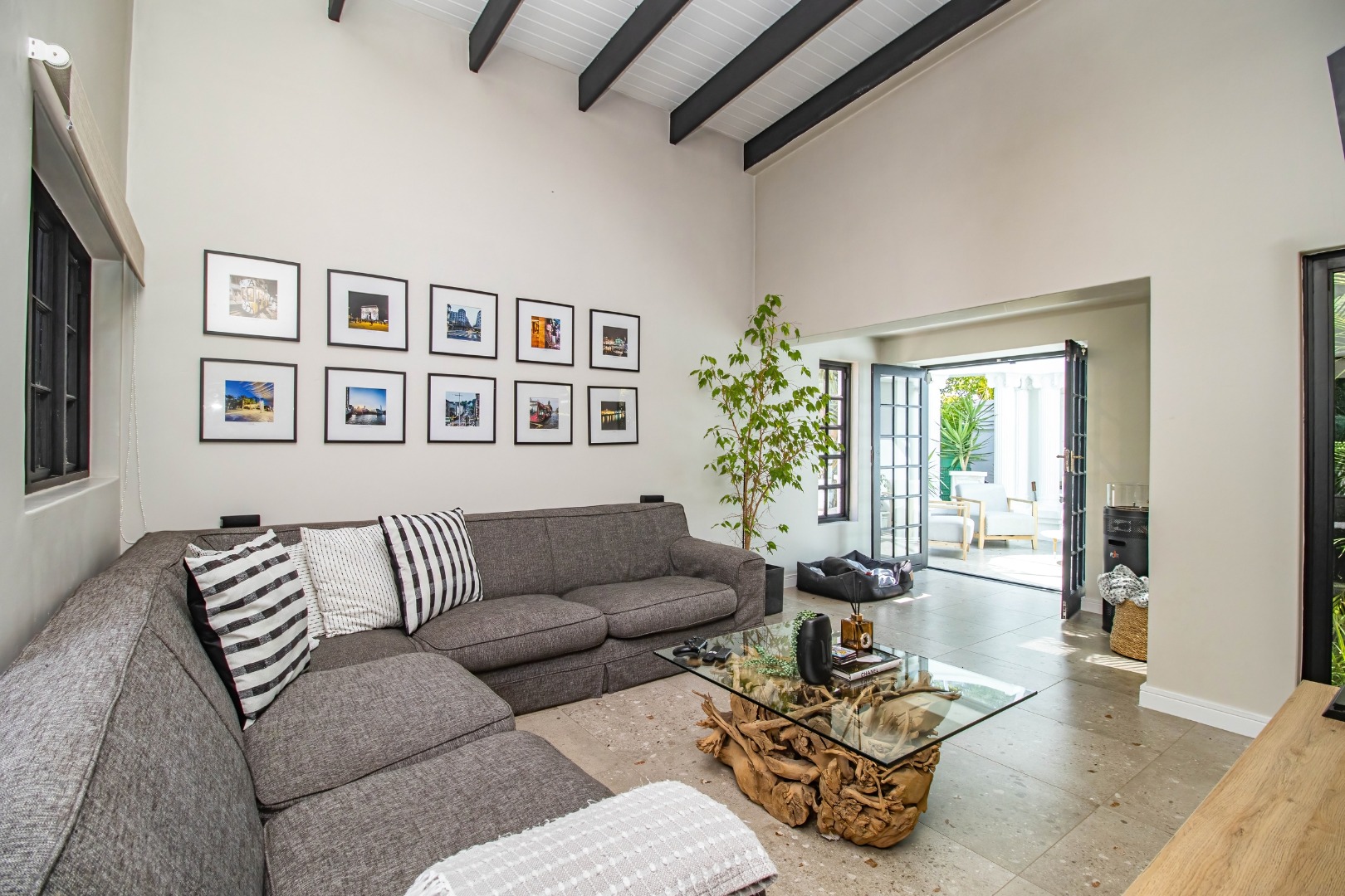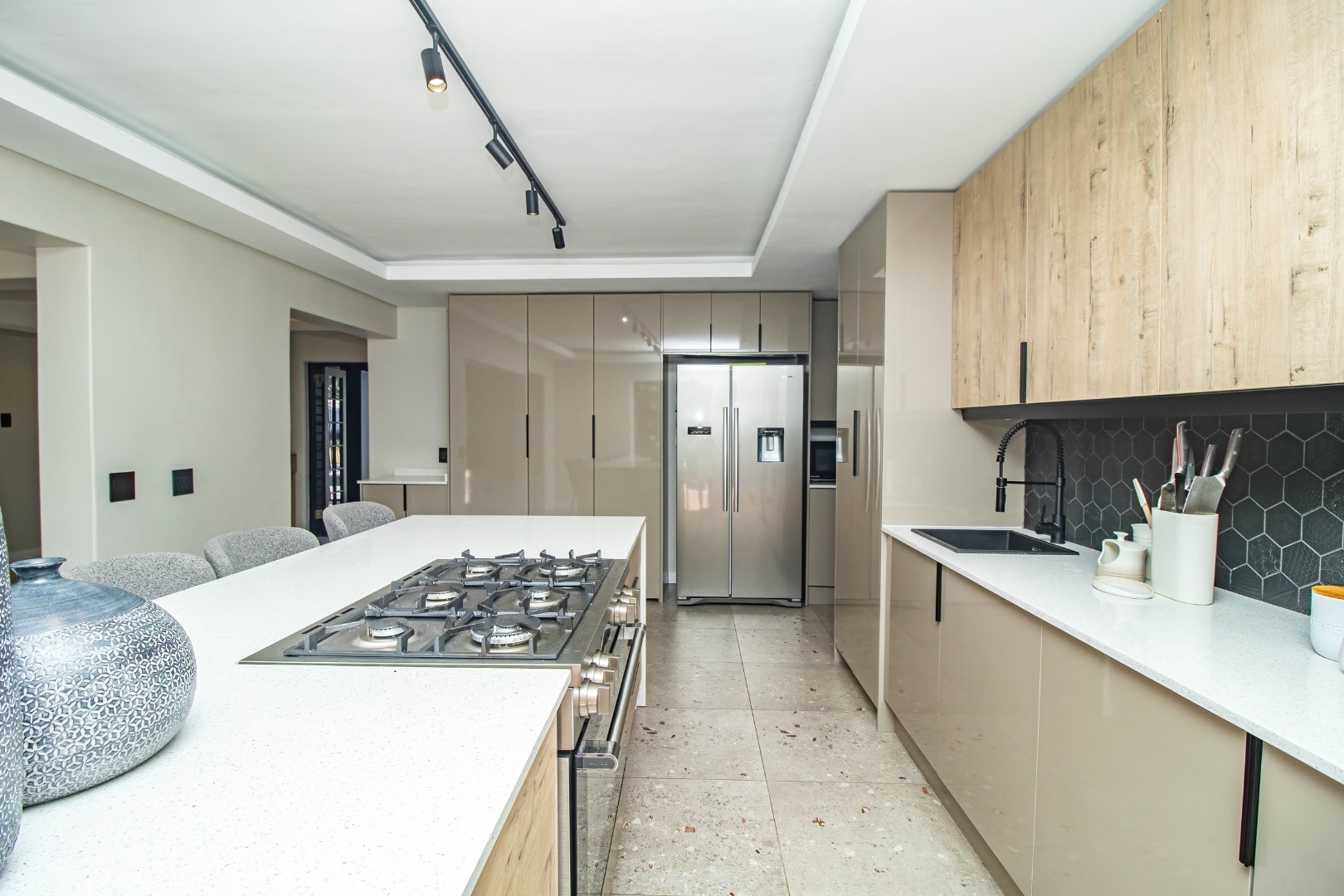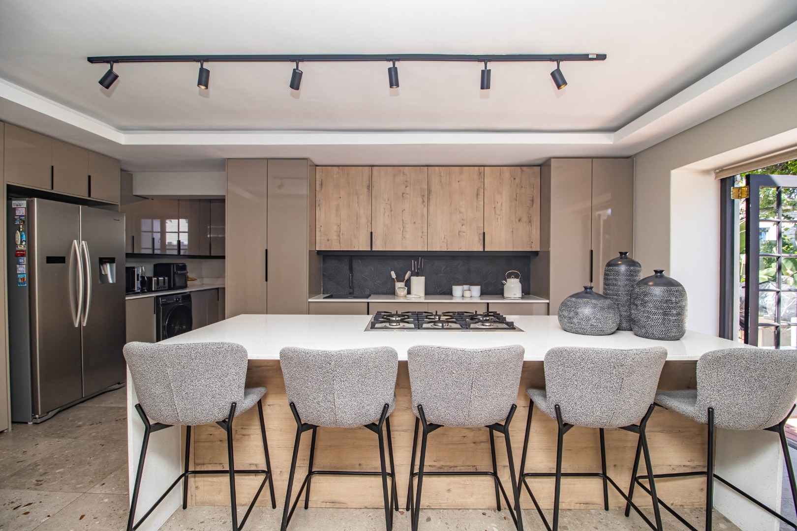 The modern open plan kitchen offers sleek finishes, soft close cupboards, and ample storage, it also has a separate scullery. The kitchen flows nicely into the dining and lounge areas. There is also a fireplace between the dining room and lounge. The large windows and doors offer lots of natural light, creating a warm and inviting atmosphere.