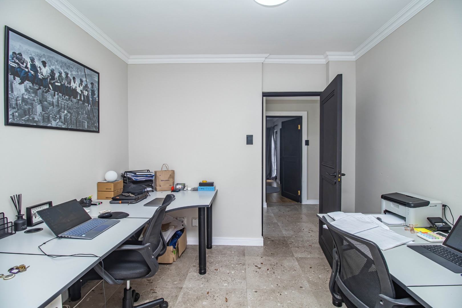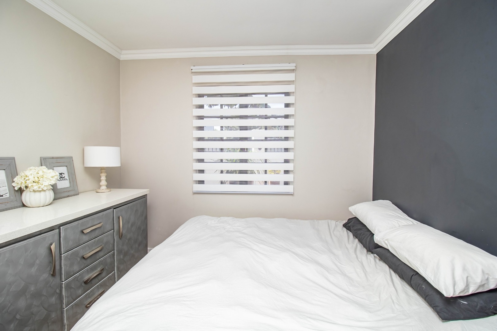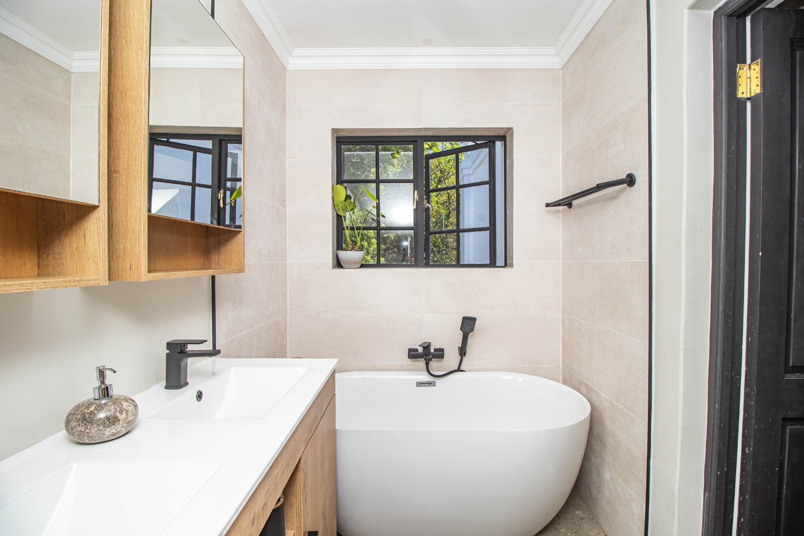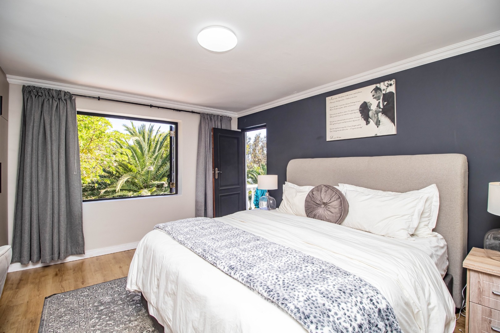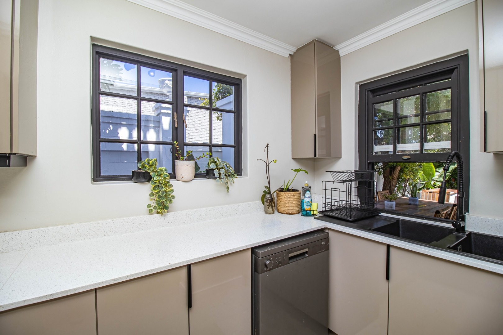 The modern open plan kitchen offers sleek finishes, soft close cupboards, and ample storage, it also has a separate scullery. The kitchen flows nicely into the dining and lounge areas. There is also a fireplace between the dining room and lounge. The large windows and doors offer lots of natural light, creating a warm and inviting atmosphere.