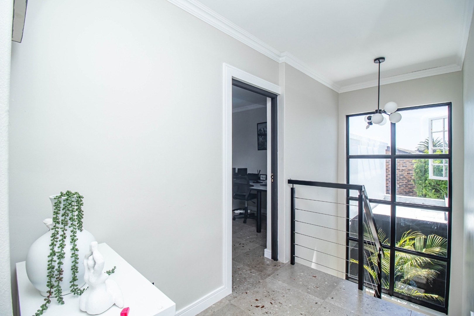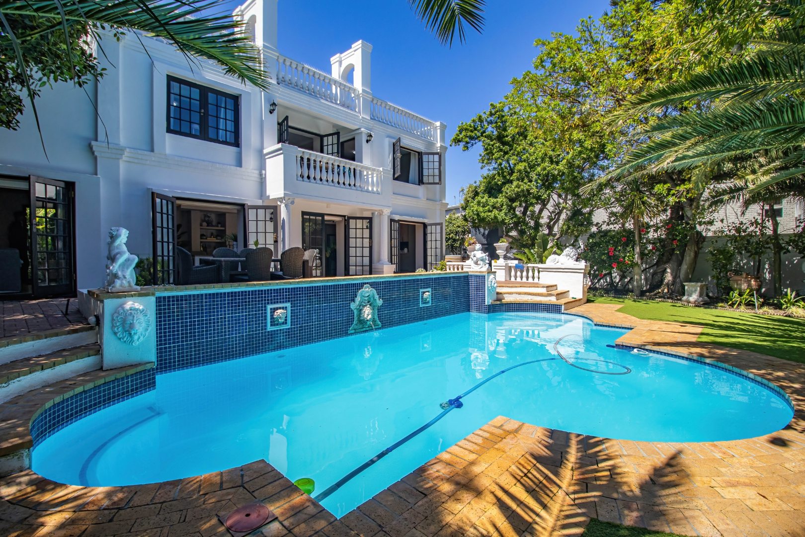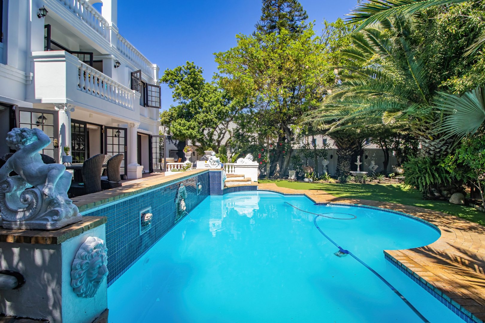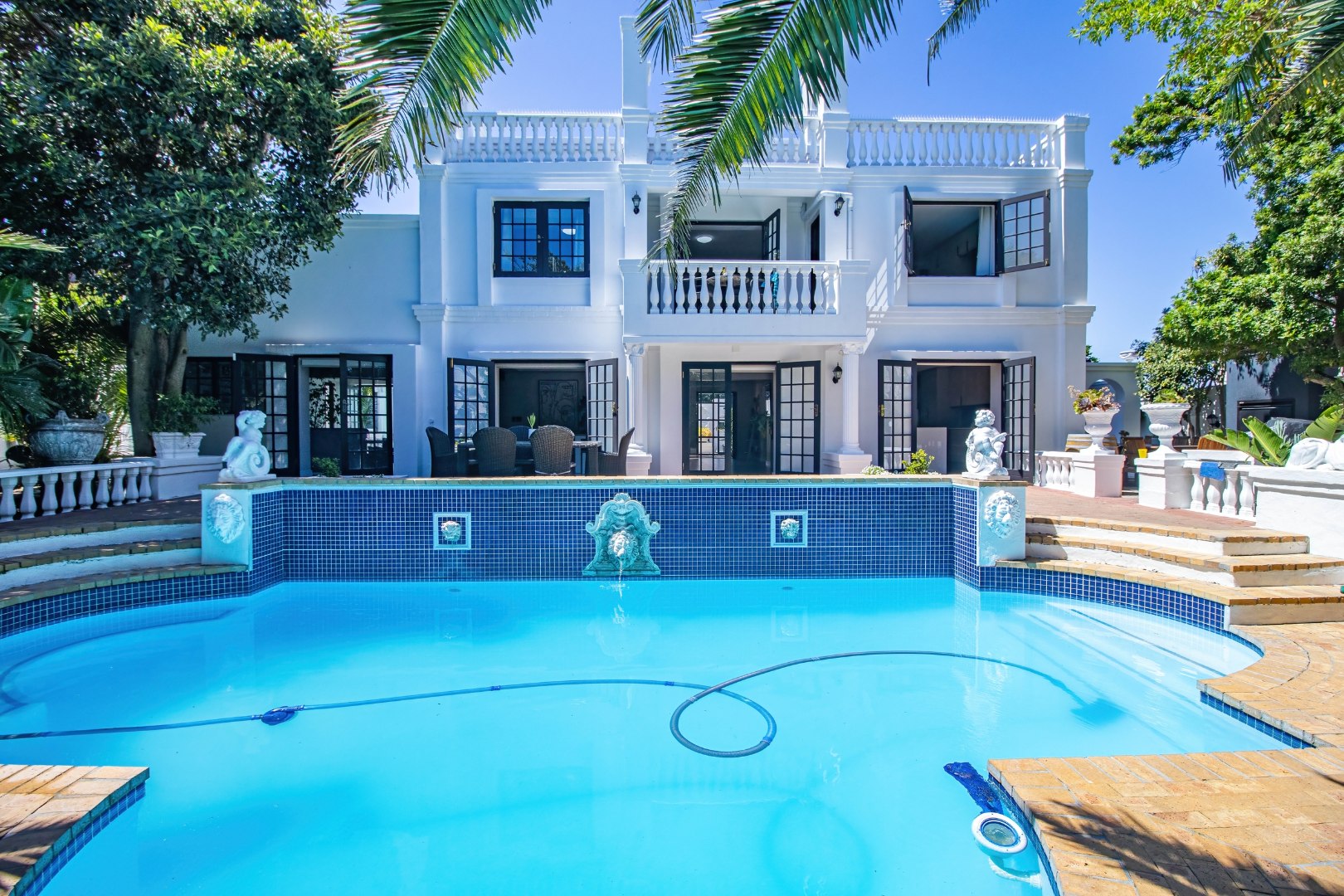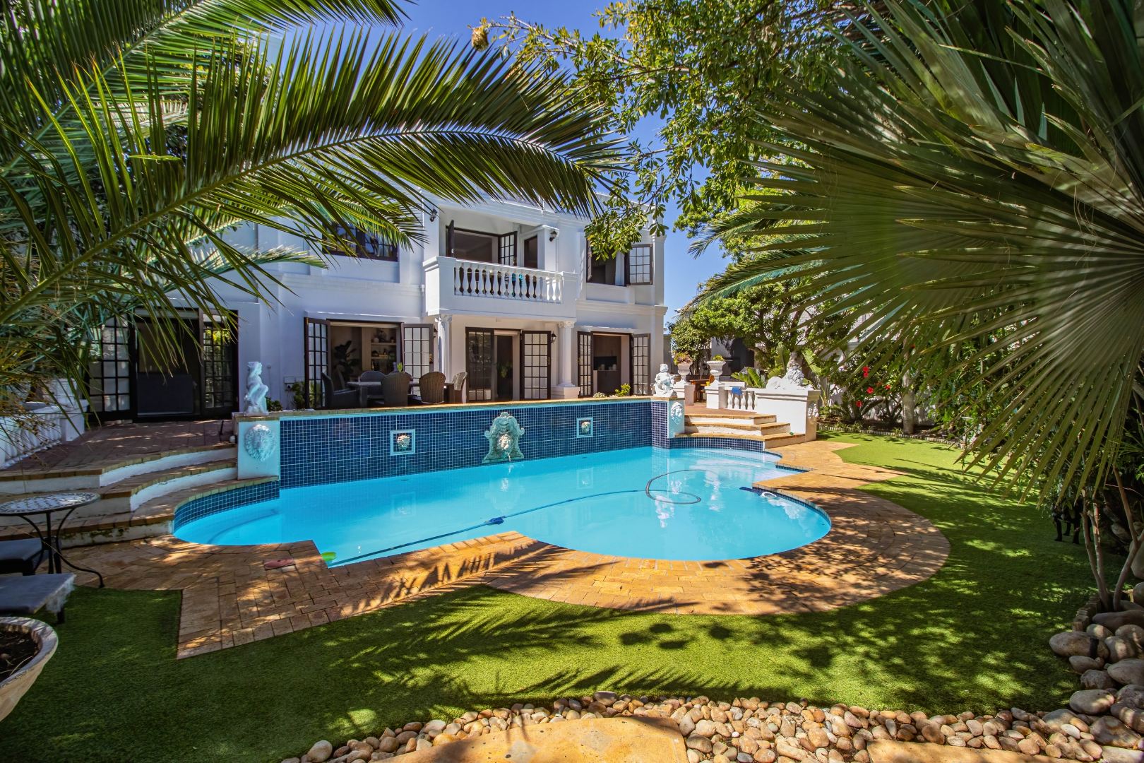 Step into this truly remarkable family home and be pleasantly surprised with what it has to offer, so much space, comfort and style. This home is bright and open with lots of natural sunlight. The home offers 5 Bedrooms, 4 bathrooms, a separate guest loo, a Pajama lounge and a office. There is one bedroom with en-suite on the ground floor and another 4 bedrooms upstairs. The main bedroom offers a full en-suite bathroom and lots of cupboard space. There are also doors that opens to a large balcony and looks out onto the garden and pool. There is another bedroom with en-suite and the 2 other rooms share a bathroom. The pajama lounge and office is also located upstairs.