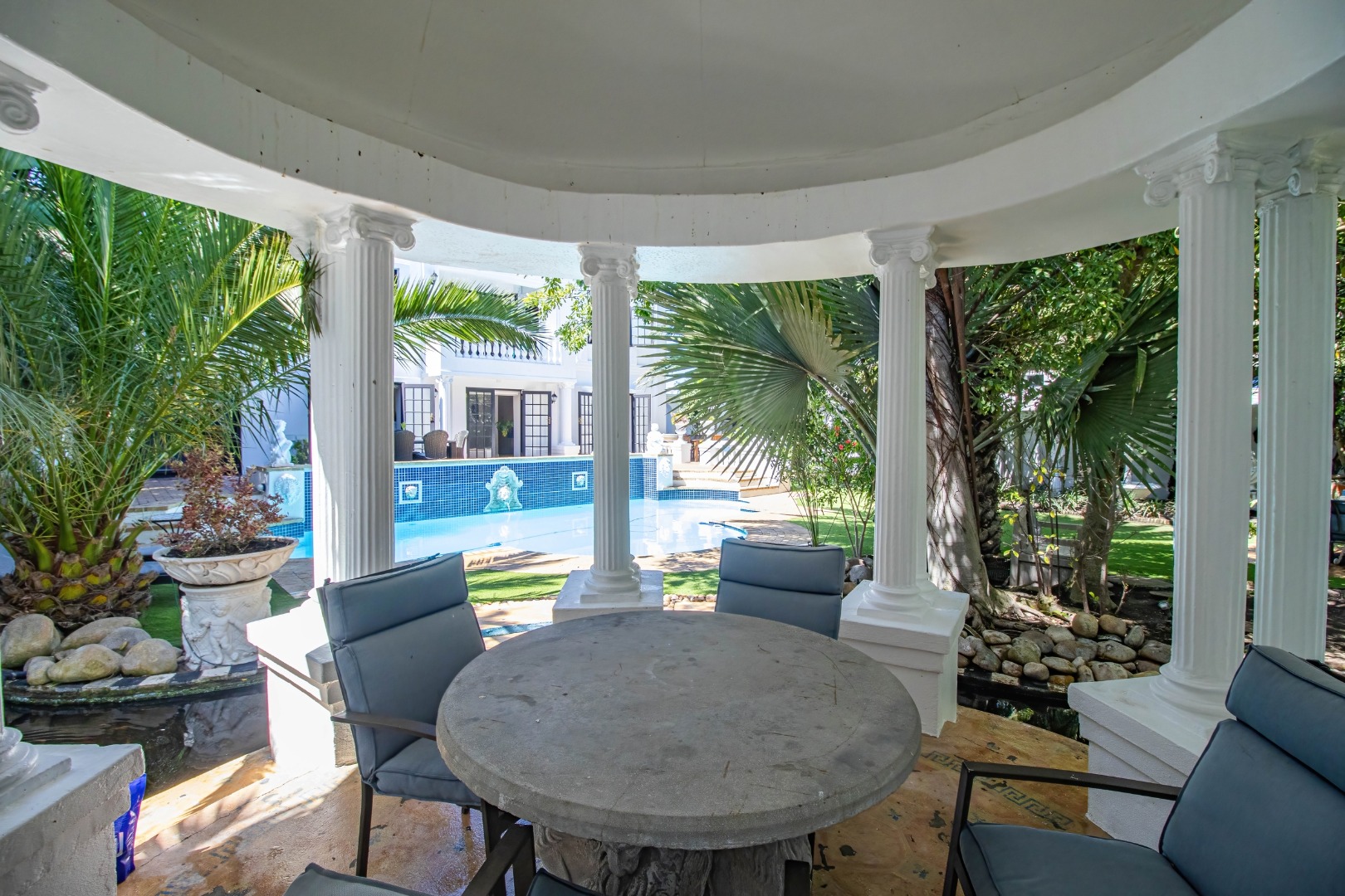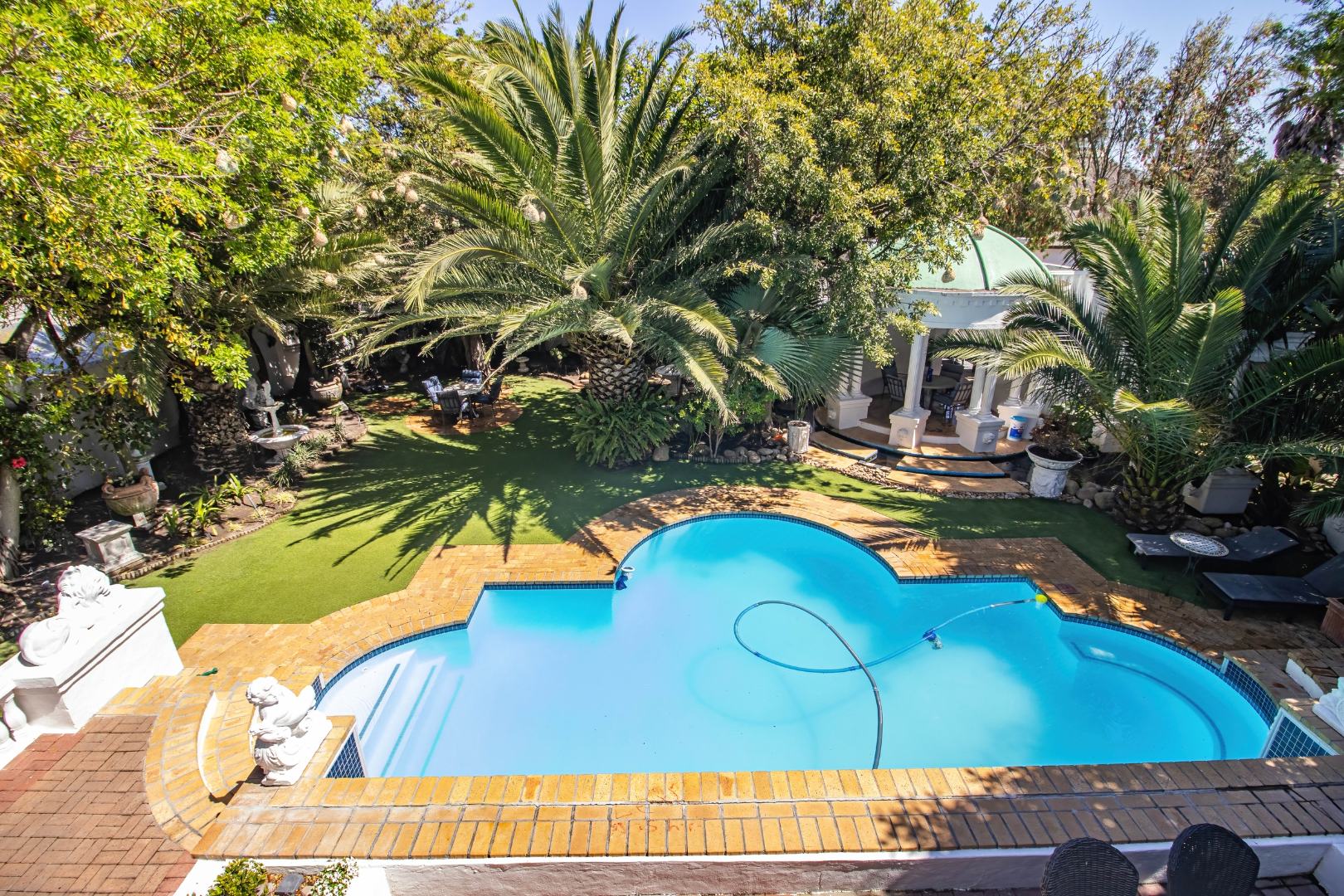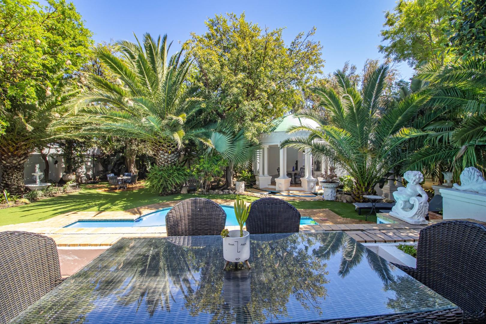 Step outside and be amazed by the beautiful entertainment areas with a built - in braai, sparkling pool, and spacious garden, ideal for outdoor living. A nice bonus is the enclosed Jacuzzi near the pool and undercover seating areas.