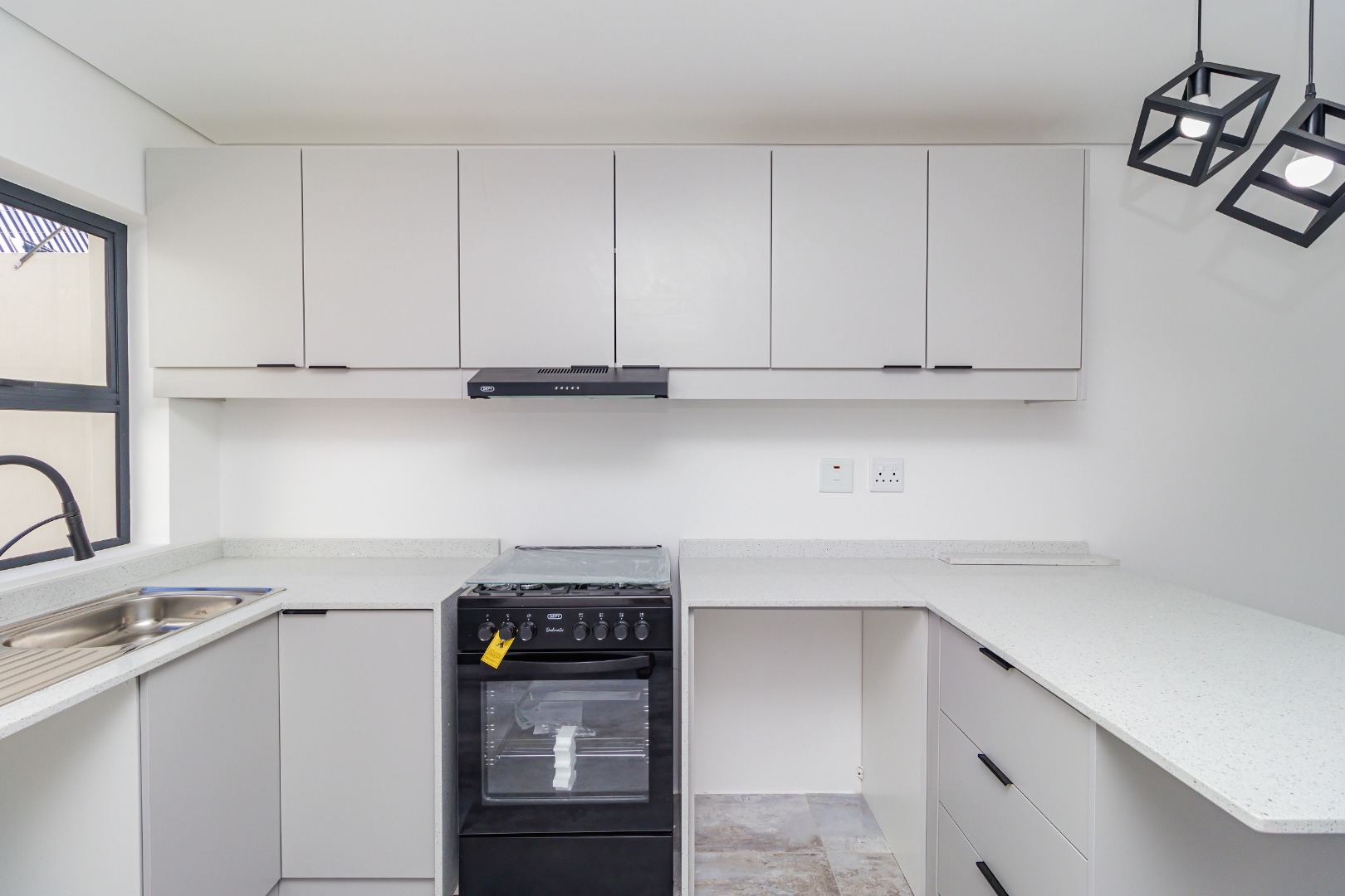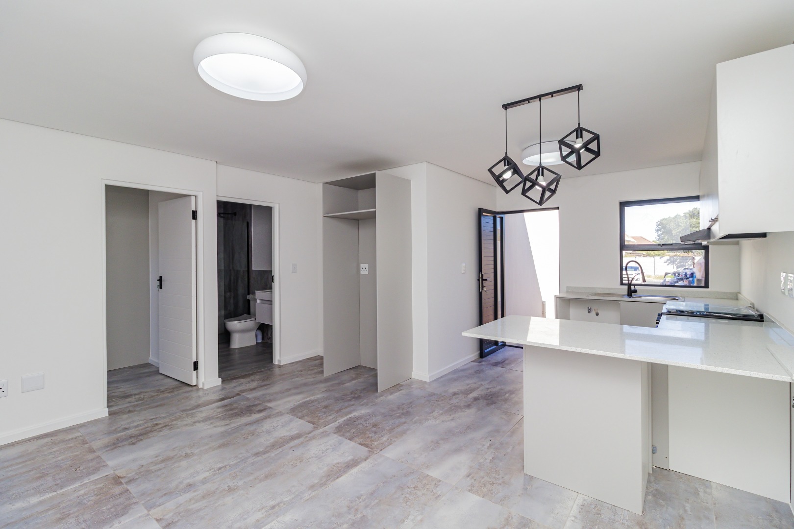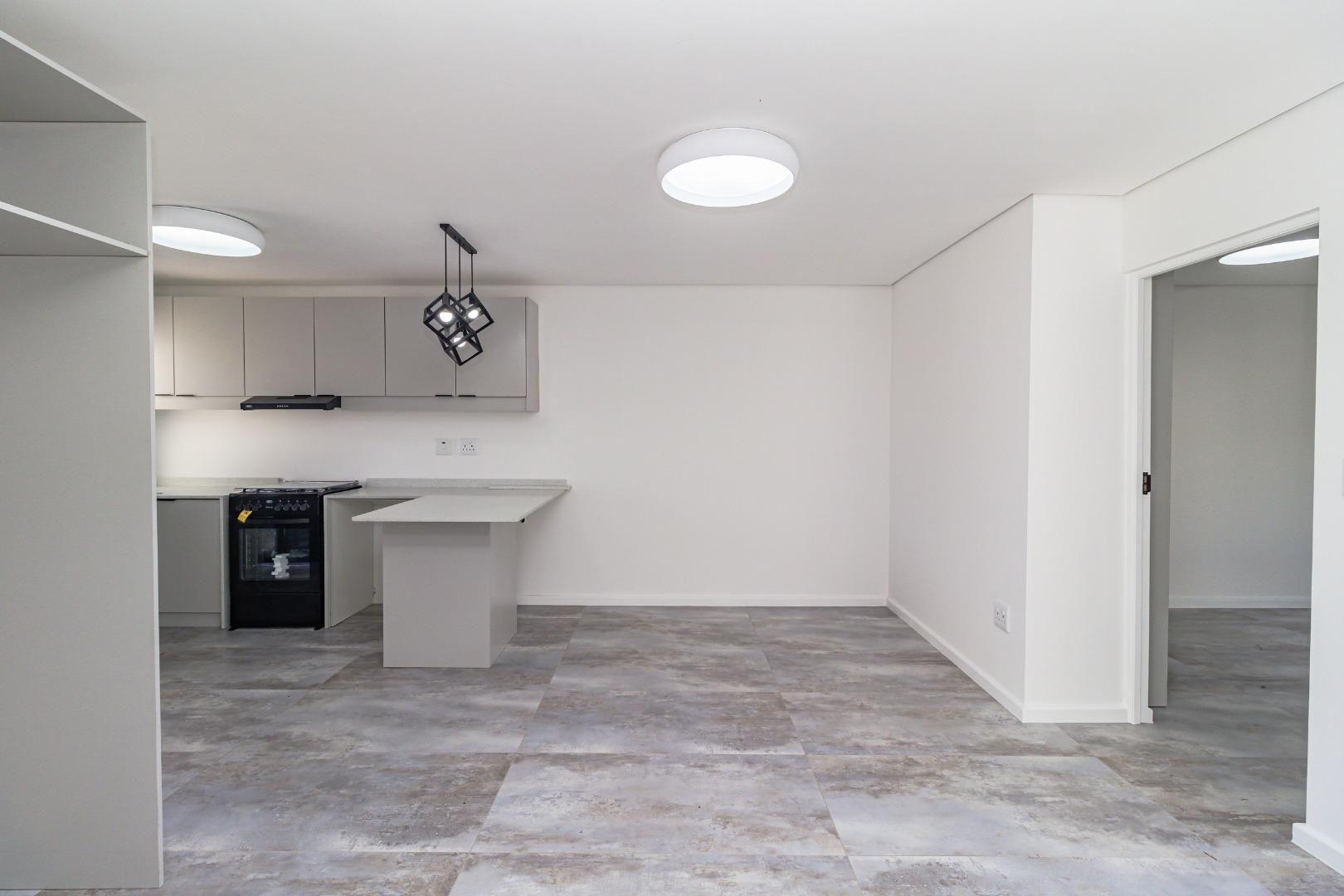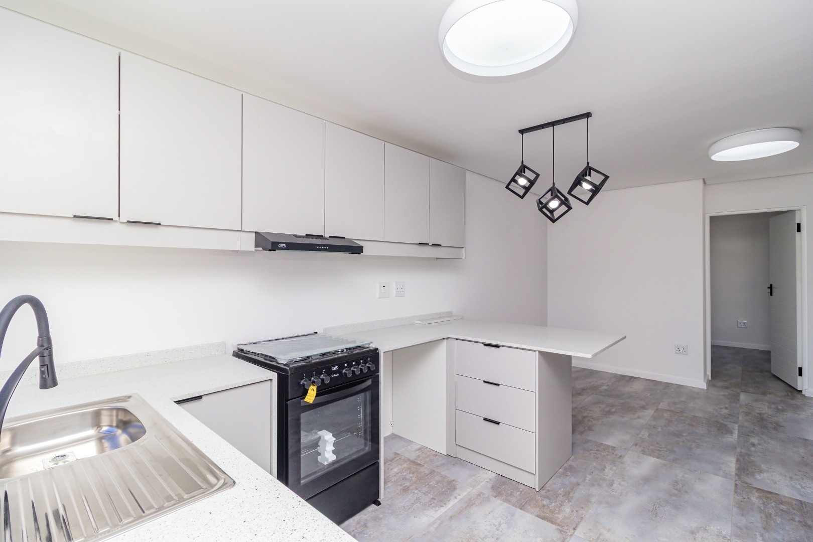The bright, open-plan living area flows into a contemporary kitchen featuring light grey cabinetry, a new black freestanding stove, and stylish geometric pendant lights. Tiled flooring and crisp white walls run throughout, leading to three comfortable bedrooms and a designer bathroom equipped with a walk-in rainfall shower.