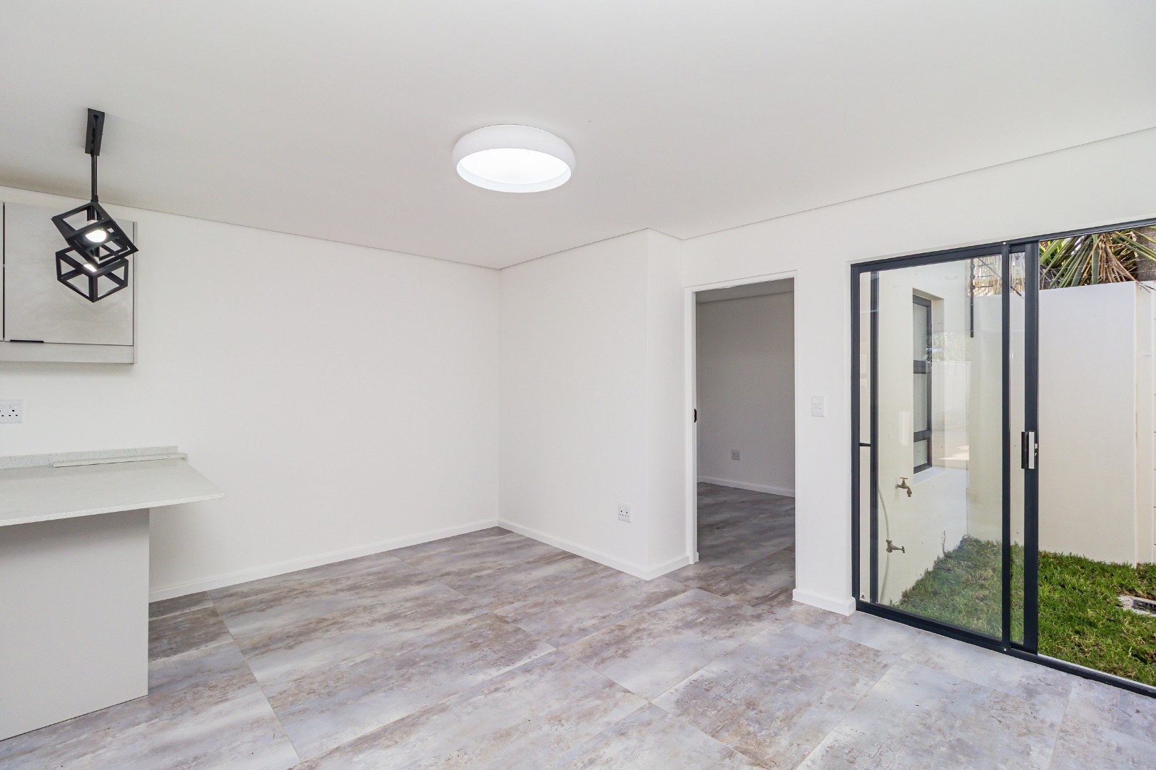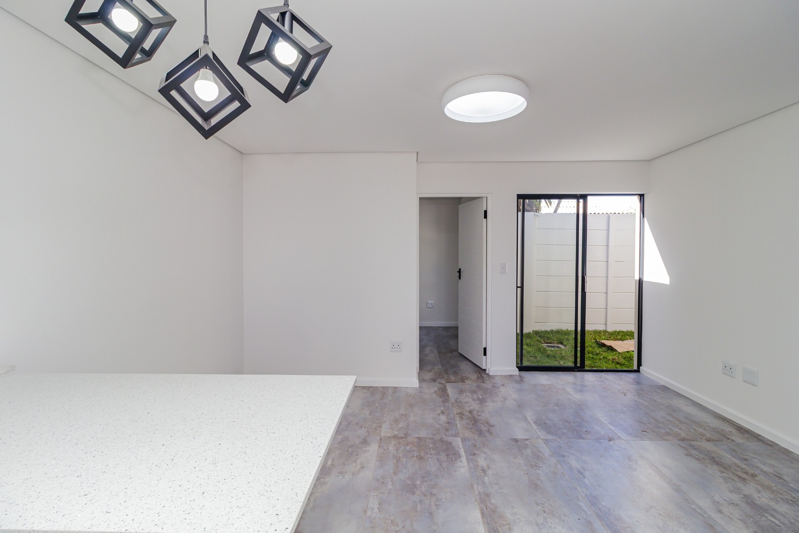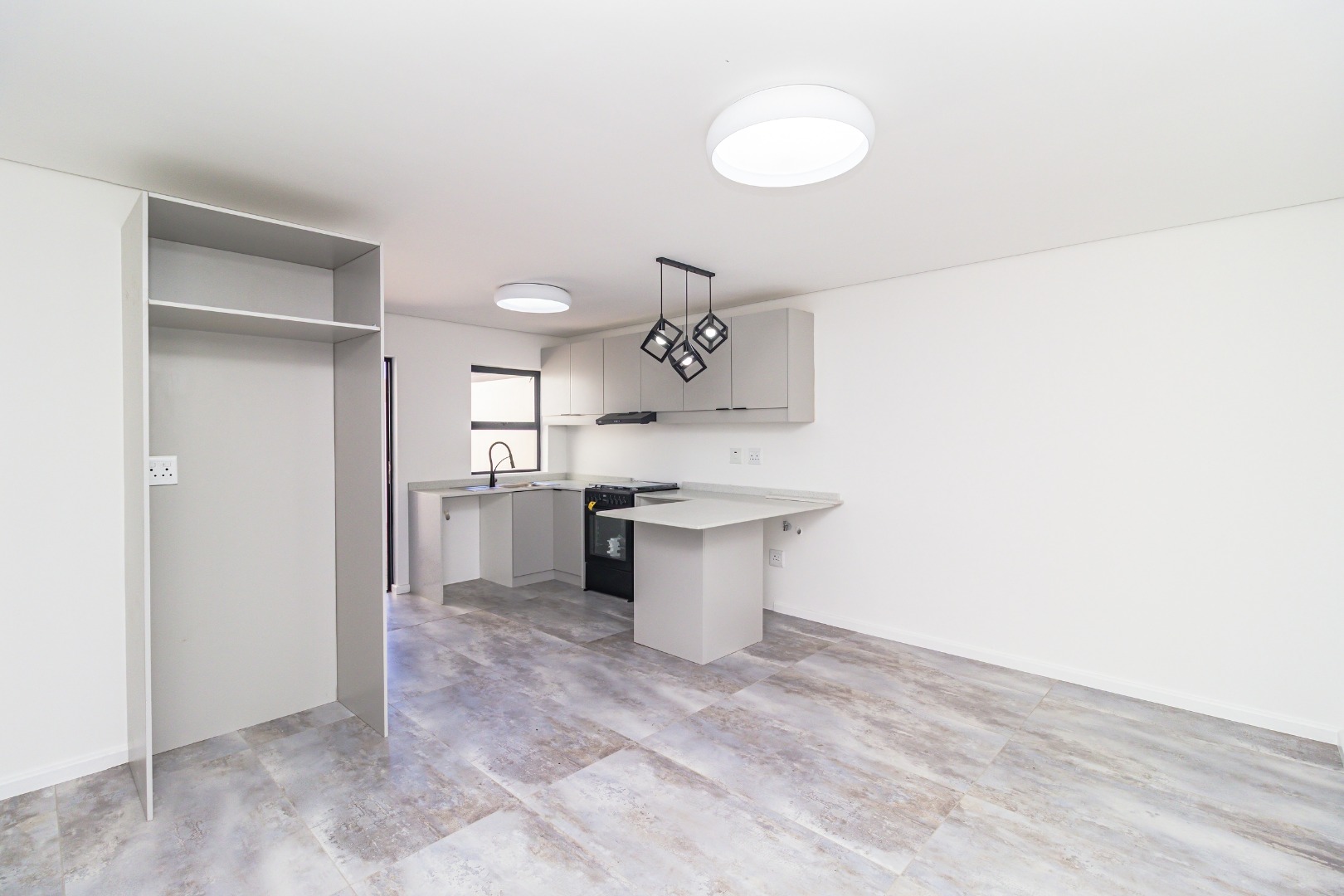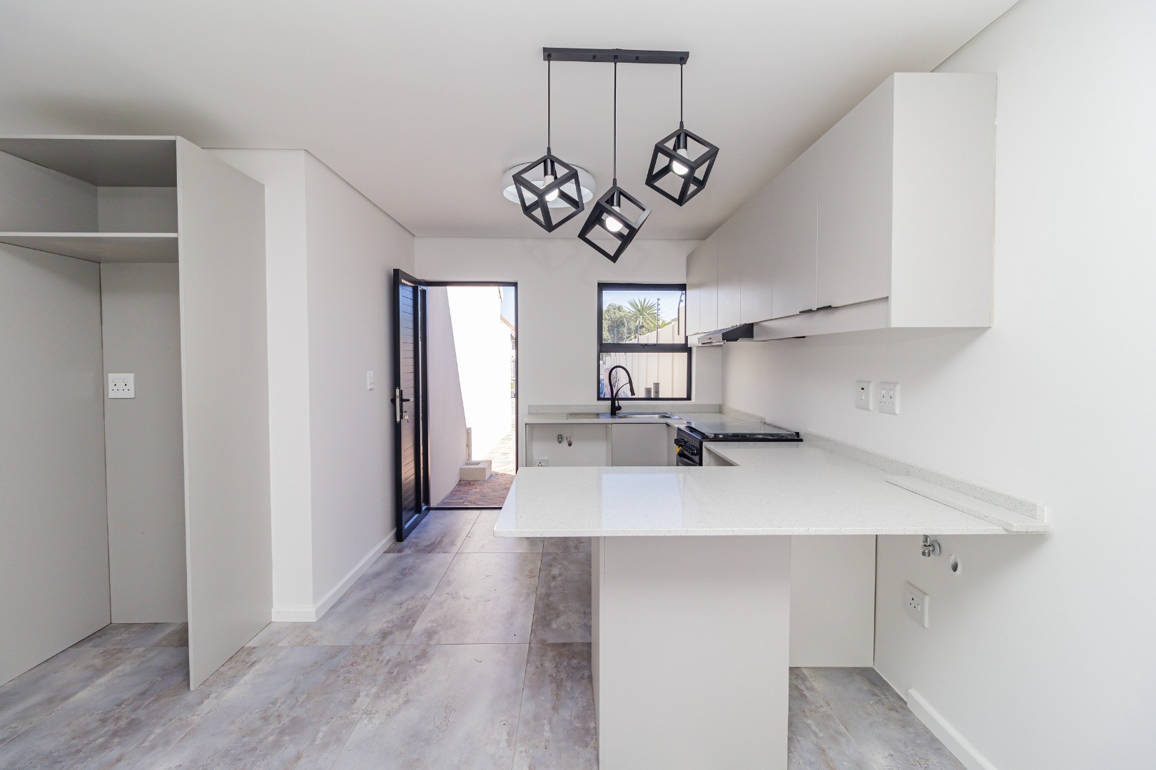 The bright, open-plan living area flows into a contemporary kitchen featuring light grey cabinetry, a new black freestanding stove, and stylish geometric pendant lights. Tiled flooring and crisp white walls run throughout, leading to three comfortable bedrooms and a designer bathroom equipped with a walk-in rainfall shower.