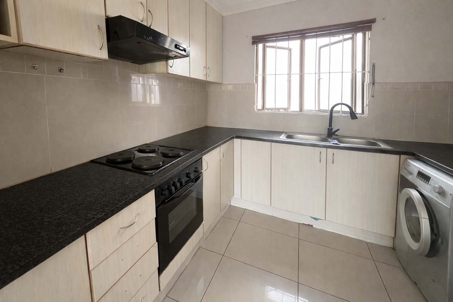 Discover this modern 2-bedroom apartment, offering a bright and airy living space with sleek tiled flooring and abundant natural light. The contemporary interior design, featuring crown molding, flows seamlessly to a private balcony, perfect for outdoor relaxation. The efficiently designed U-shaped kitchen boasts light-colored cabinets, dark speckled countertops, an integrated oven and hob, and a double sink positioned under a window, providing ample storage and space for a washing machine.