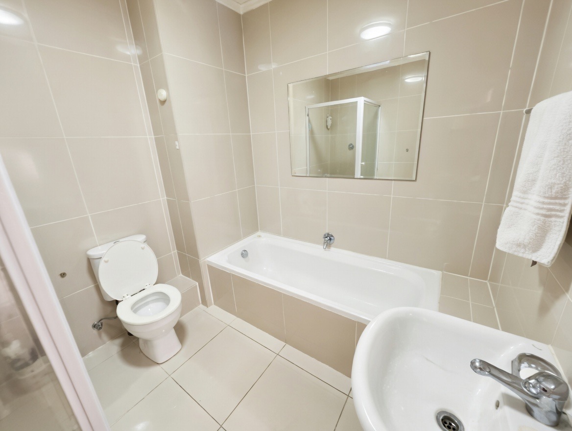 The apartment features two comfortable bedrooms, each with well-maintained wood-look flooring and generous natural light. The main bedroom is equipped with air conditioning, ensuring comfort throughout the seasons. The clean and modern bathroom is appointed with neutral wall and floor tiling, a separate shower, a bathtub, and pristine white fixtures.
