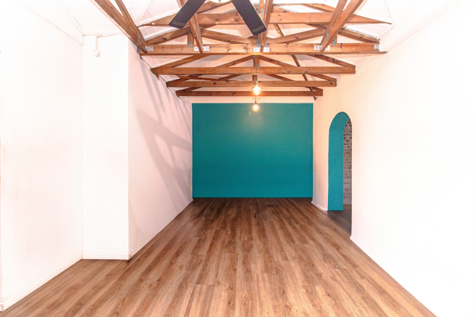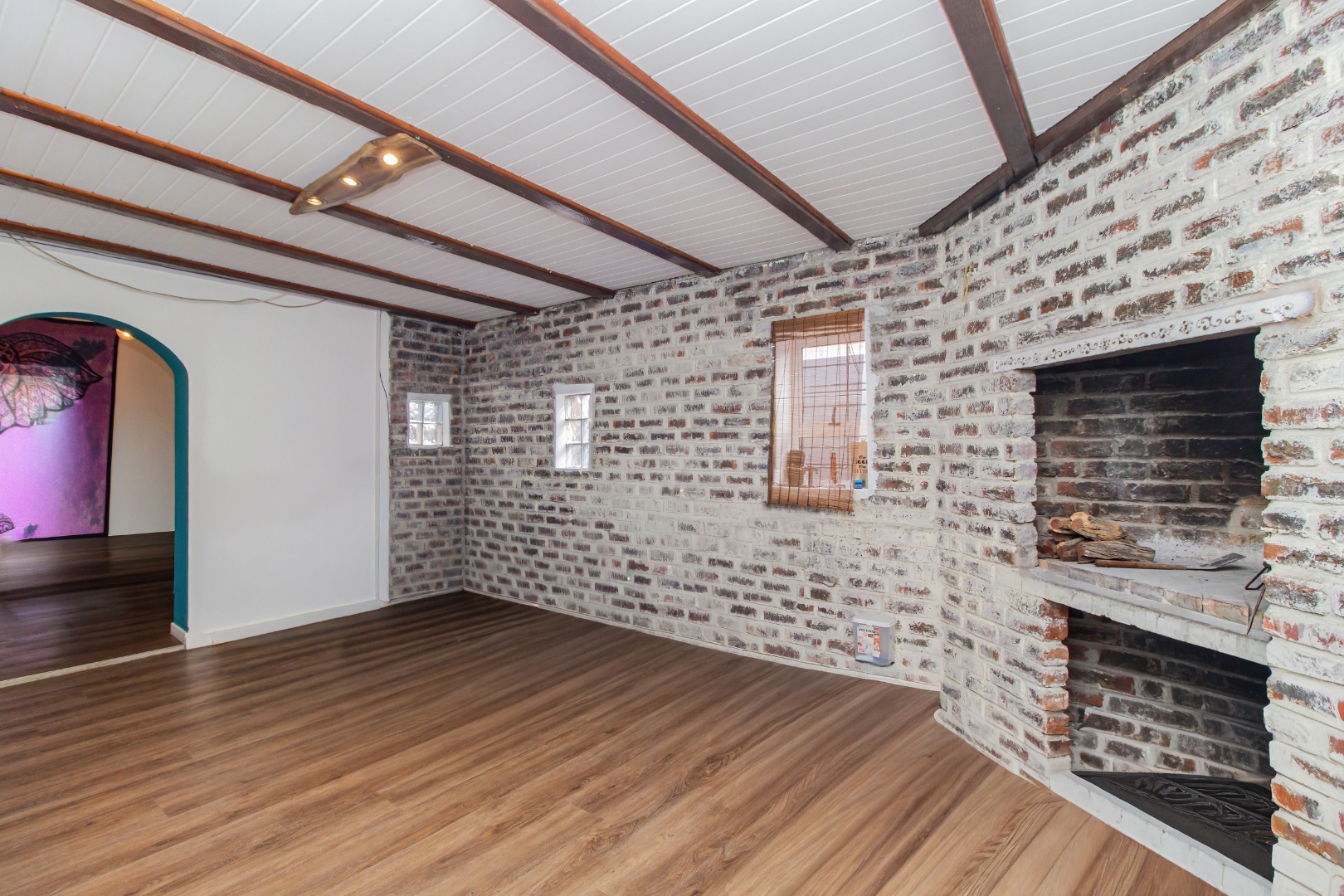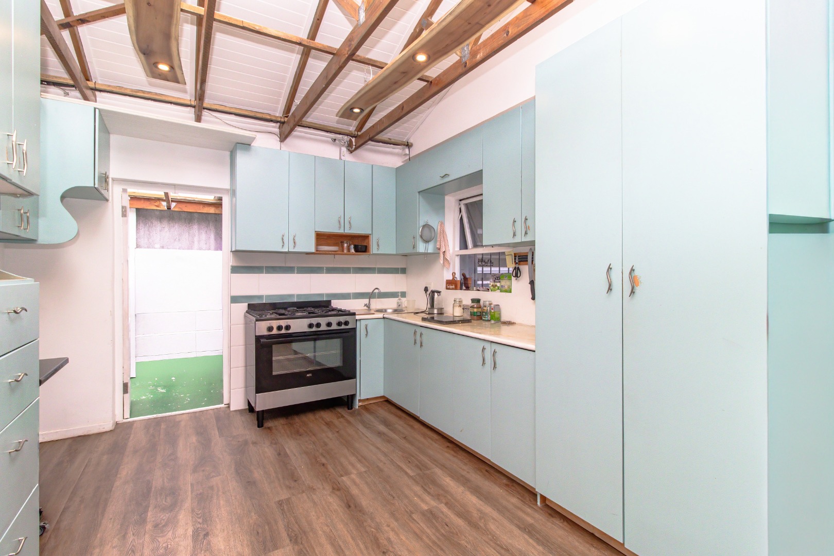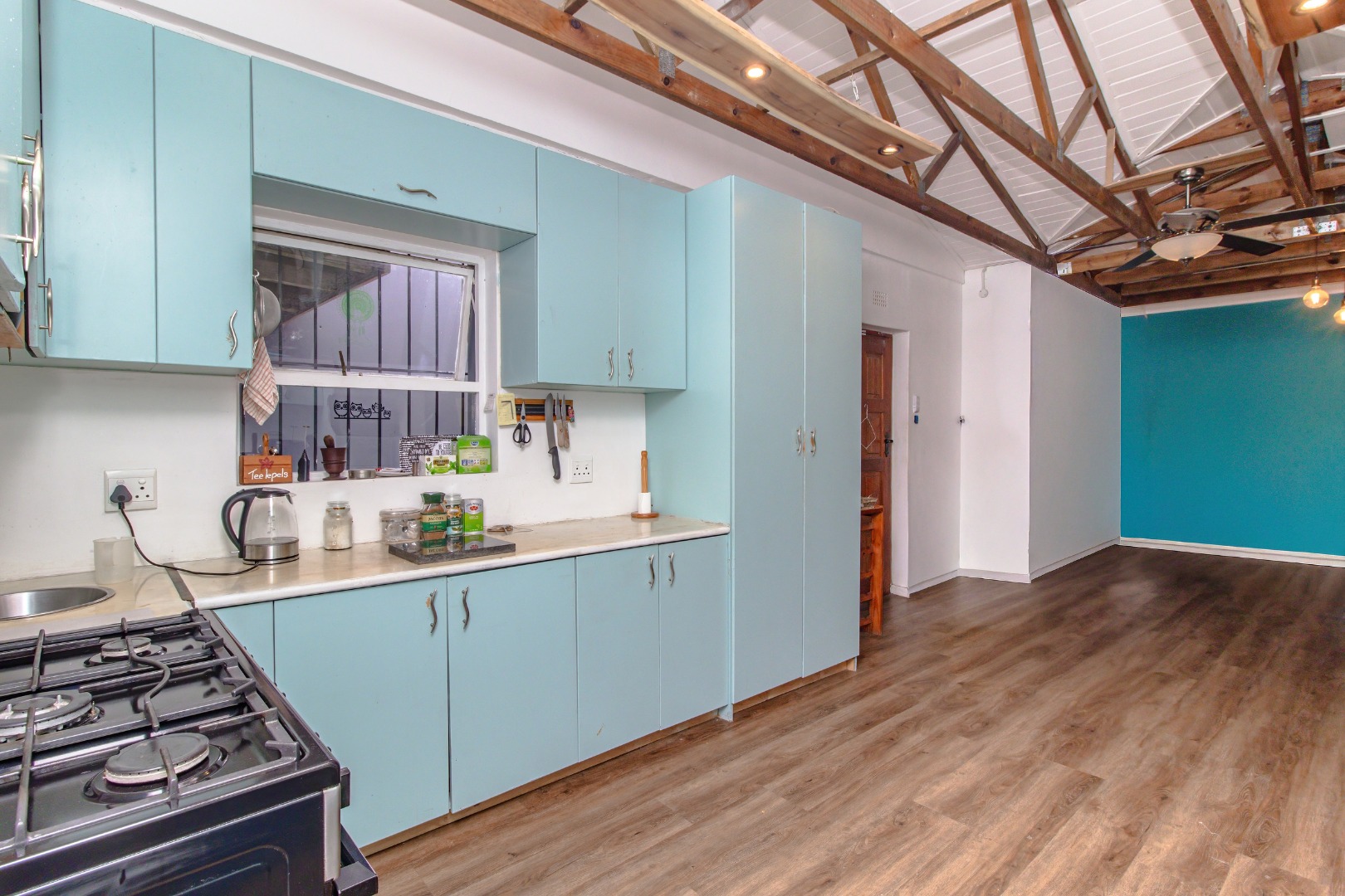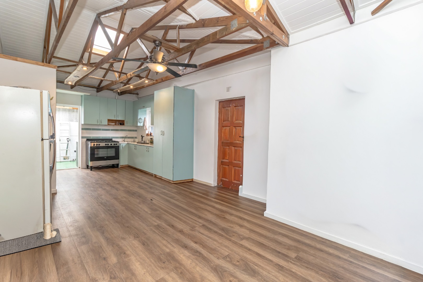 The interior showcases an inviting open-plan design, featuring striking exposed wooden beam ceilings and contemporary wood-look laminate flooring throughout. The home includes two distinct lounge areas, providing ample space for relaxation and entertainment. The main kitchen is equipped with light blue cabinetry and a distinctive exposed wooden rafter ceiling. A second kitchen further enhances the property's versatility, ideal for extended family or rental income.