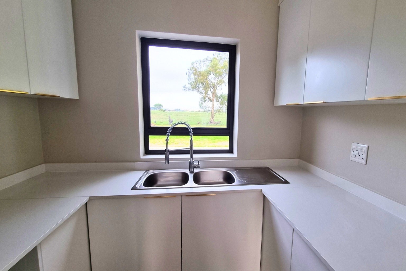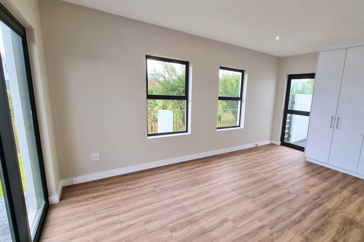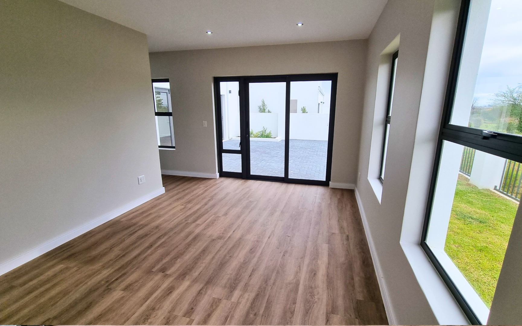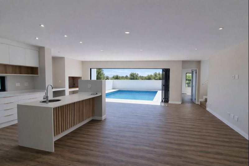 This contemporary 4-bedroom, 3-bathroom home, featuring two en-suite bathrooms, offers a modern lifestyle within a secure eco-estate. The open-plan living areas seamlessly connect to the outdoors via large bi-fold doors, leading to a private swimming pool and a built-in braai, perfect for entertaining. The sleek kitchen boasts an island and integrated sink, complemented by neutral finishes and wood-look flooring throughout.