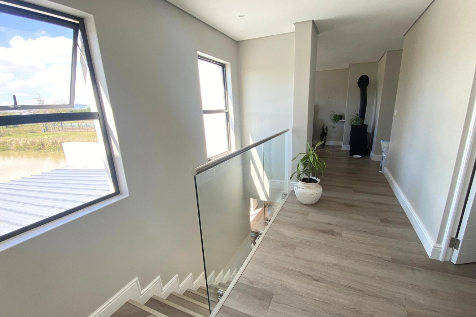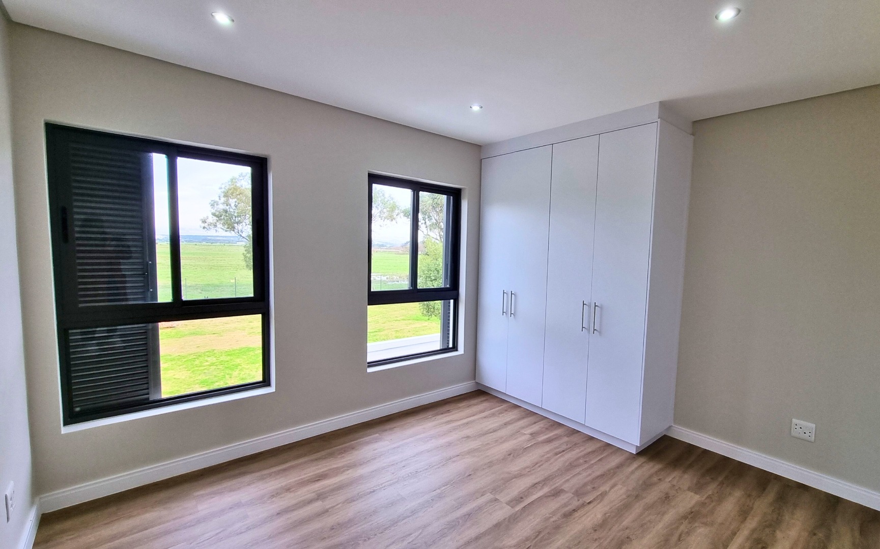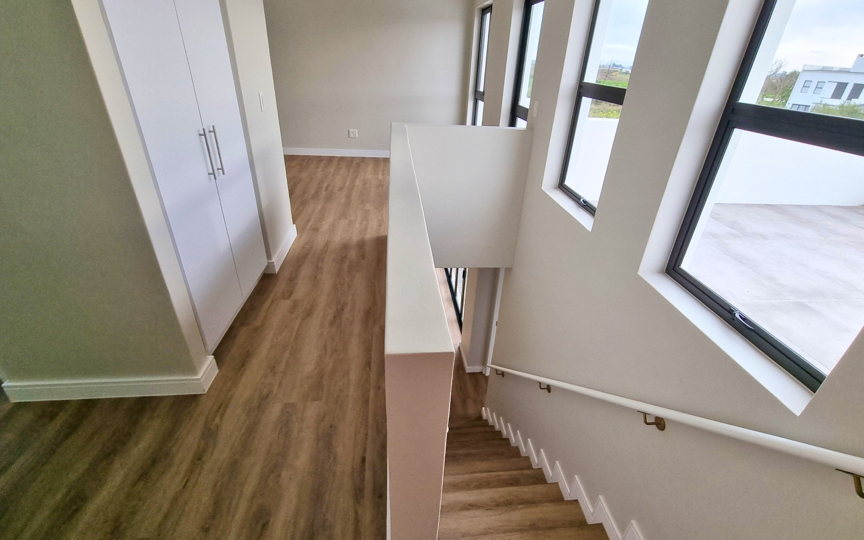 This contemporary 4-bedroom, 3-bathroom home, featuring two en-suite bathrooms, offers a modern lifestyle within a secure eco-estate. The open-plan living areas seamlessly connect to the outdoors via large bi-fold doors, leading to a private swimming pool and a built-in braai, perfect for entertaining. The sleek kitchen boasts an island and integrated sink, complemented by neutral finishes and wood-look flooring throughout.