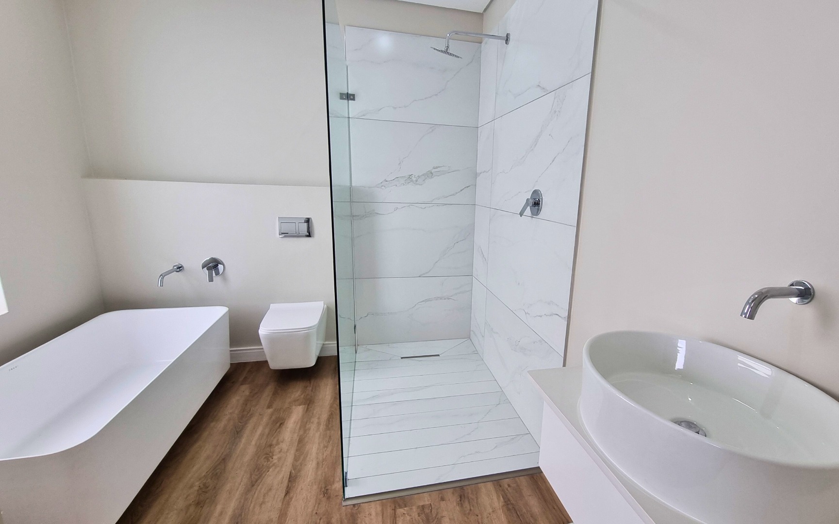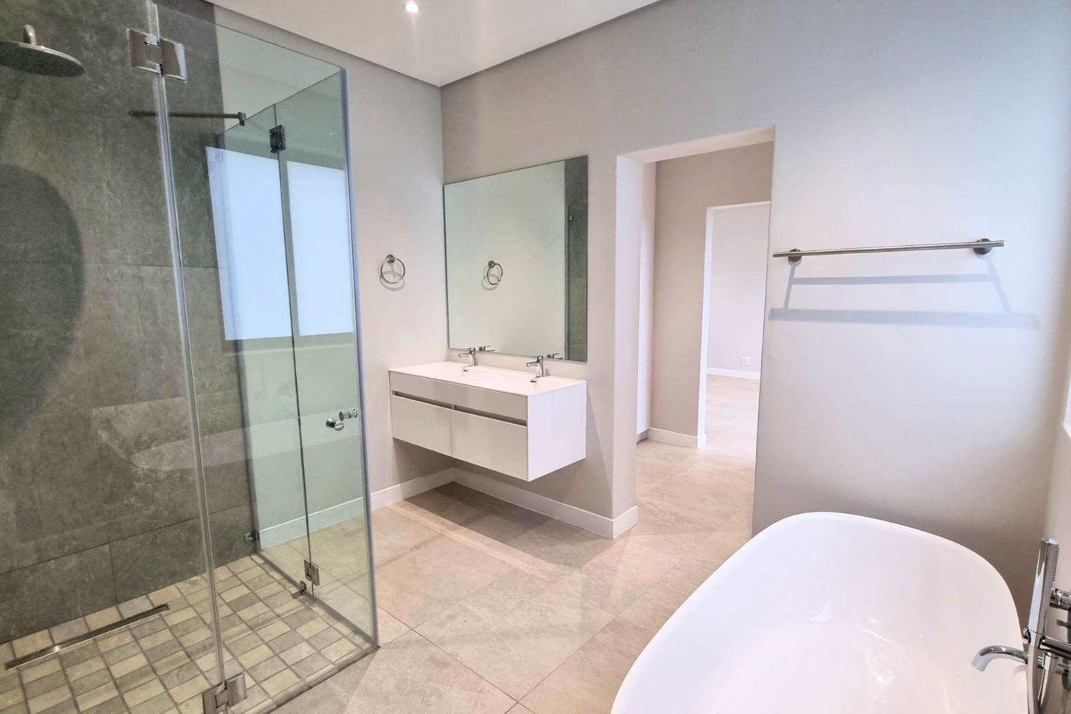 Bedrooms are bright with ample natural light and include built-in wardrobes. The modern bathrooms feature a glass-enclosed shower, freestanding tub, and dual-sink vanity, ensuring comfort and style.