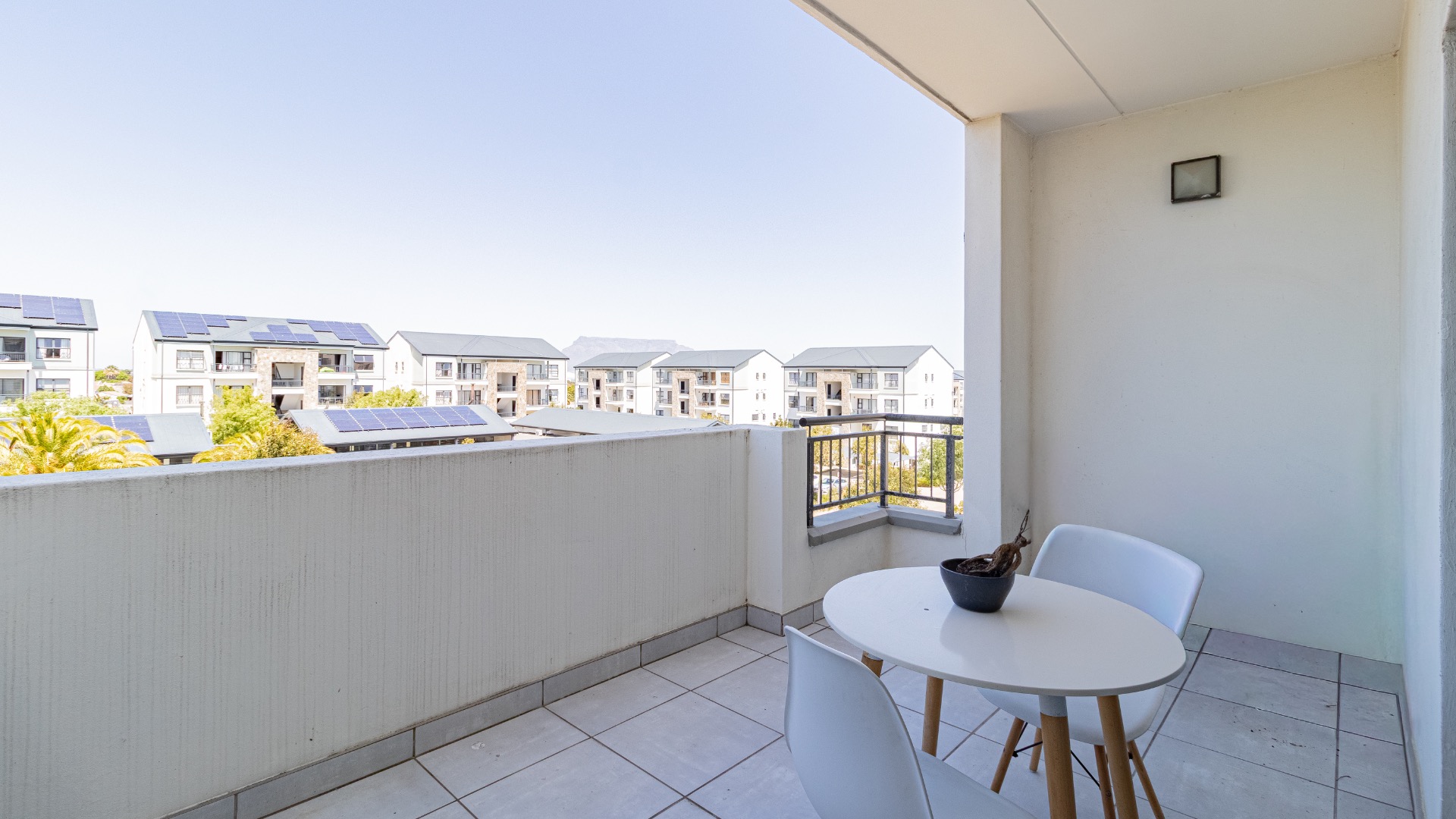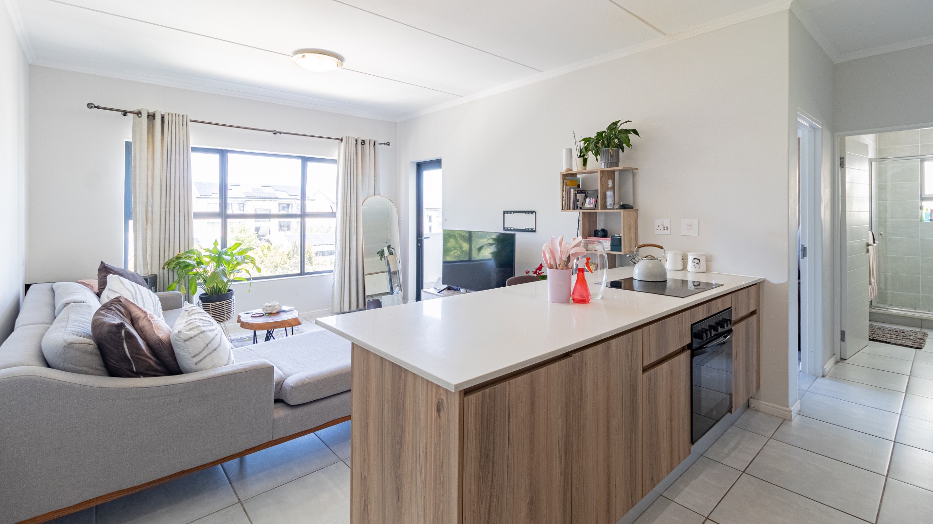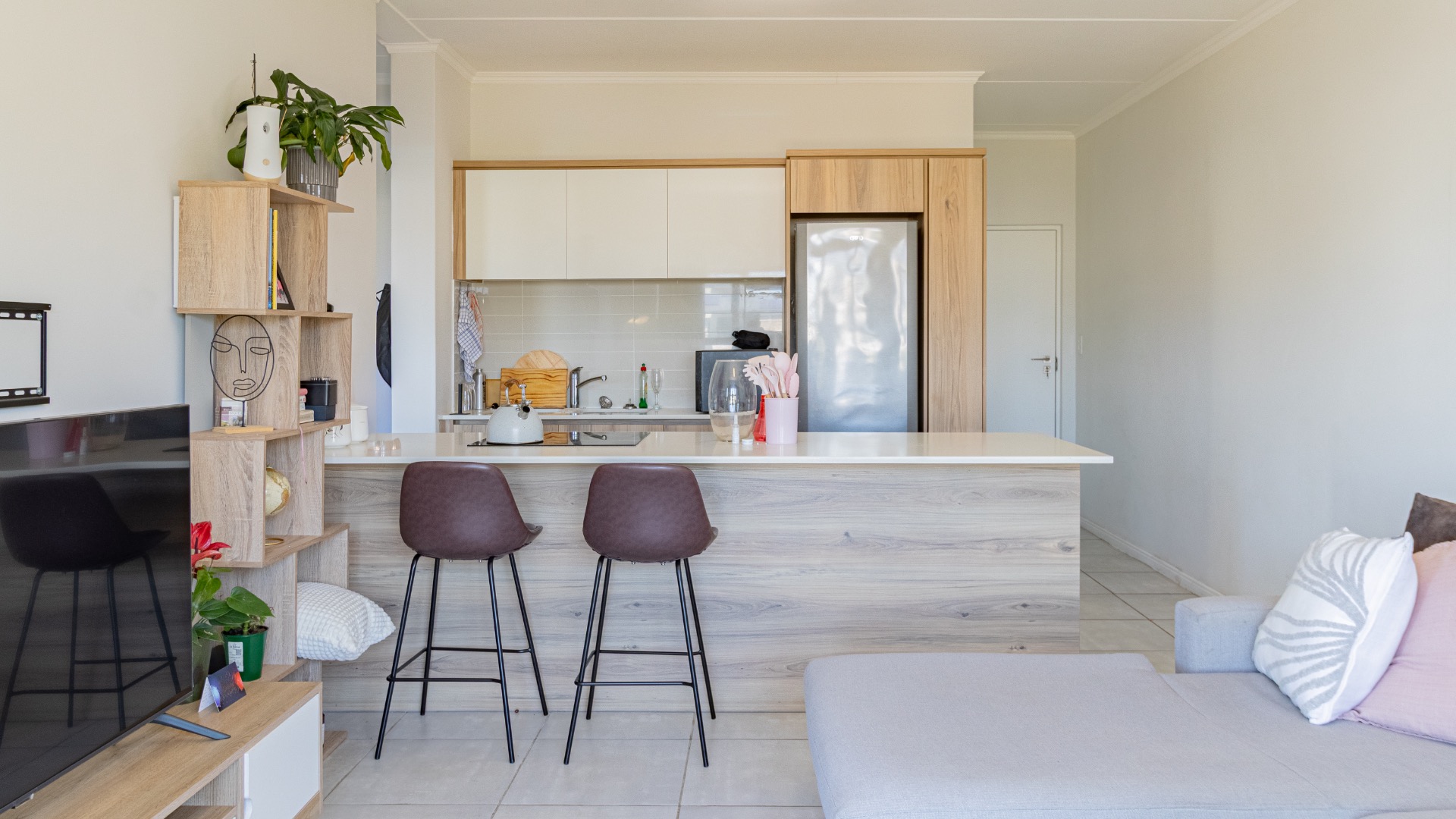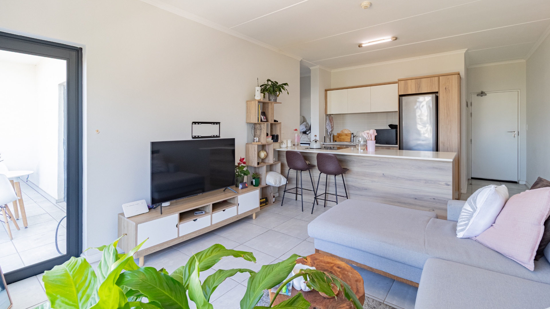This modern apartment offers an open-plan kitchen and living area that flows onto a spacious balcony with stunning views of the lifestyle centre and Table Mountain - visible from both the living area and the bedroom! The bedroom includes generous built-in cupboards and direct access to the balcony.