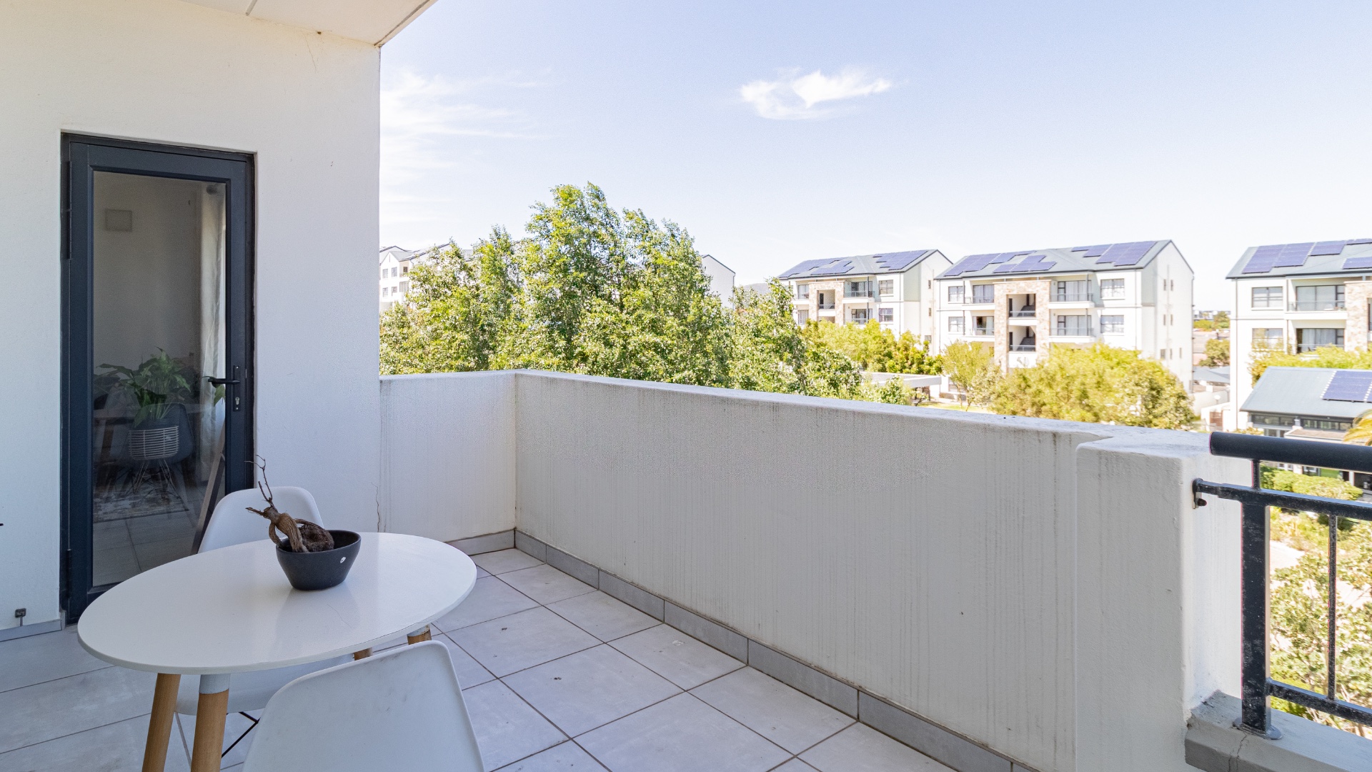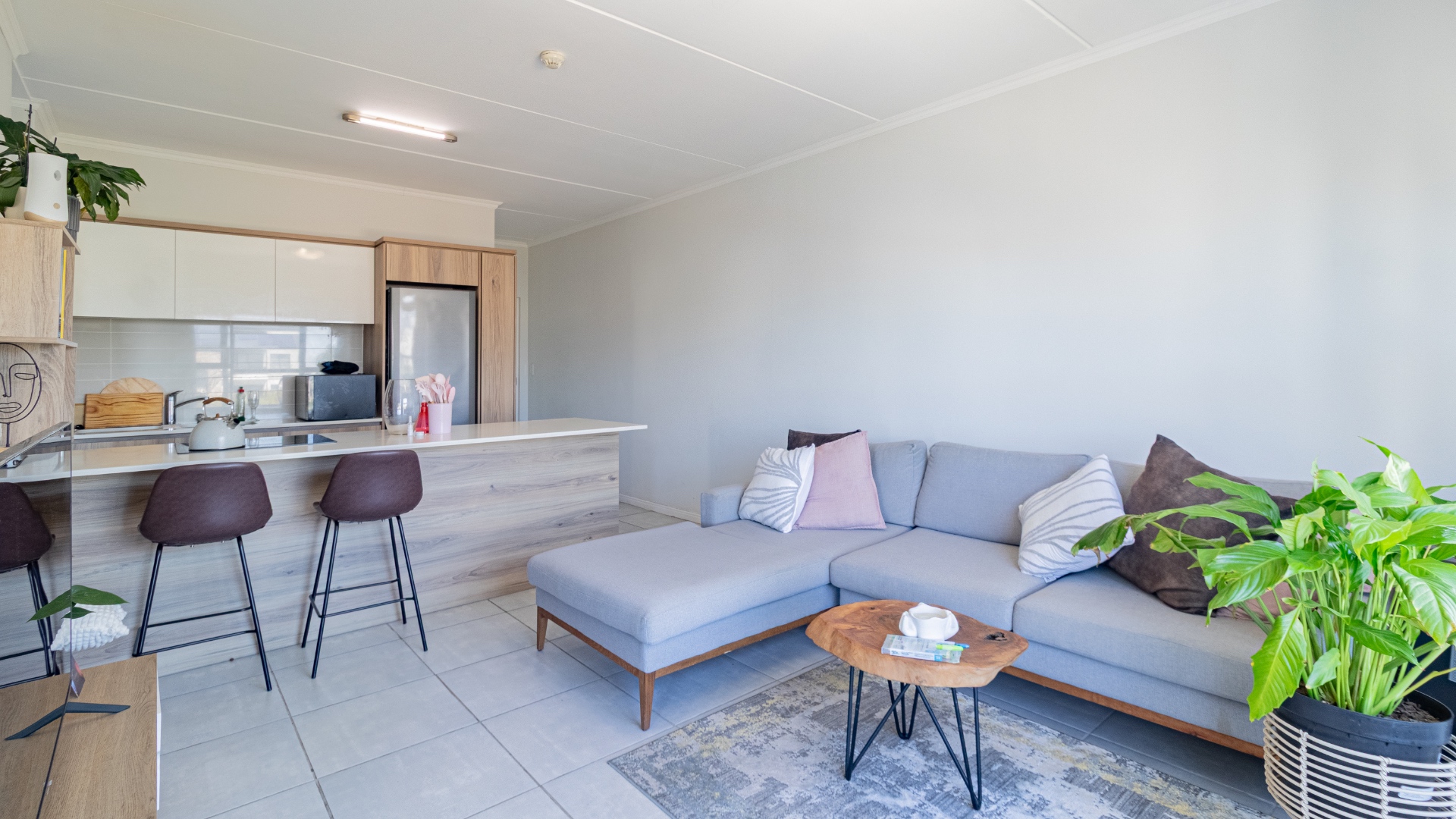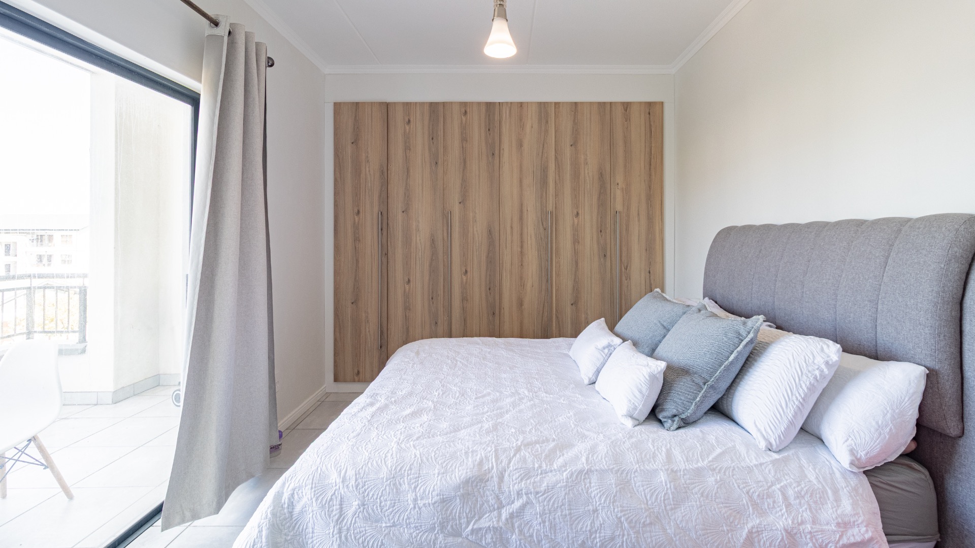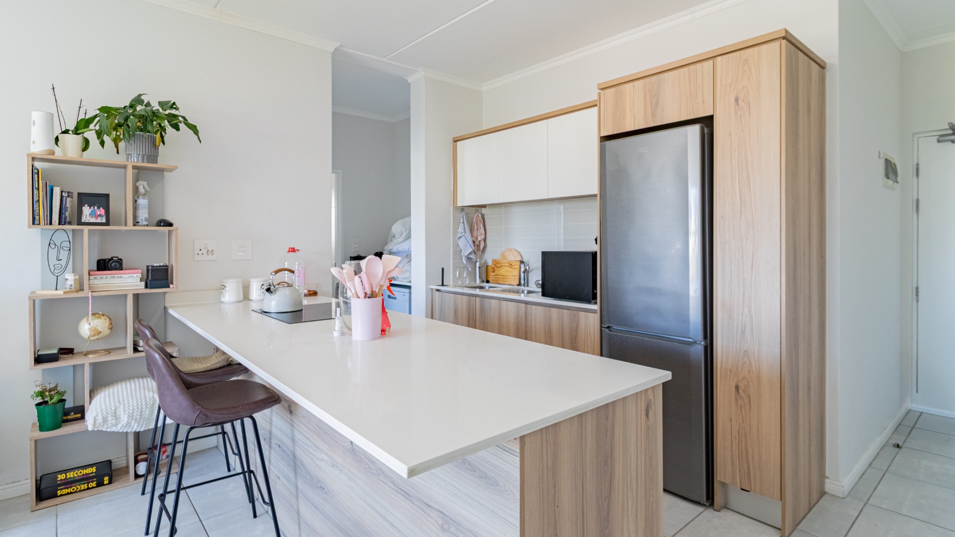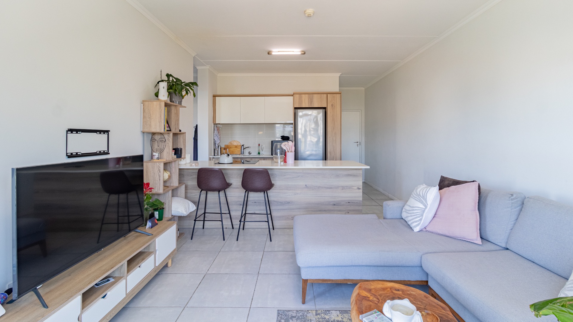 This modern apartment offers an open-plan kitchen and living area that flows onto a spacious balcony with stunning views of the lifestyle centre and Table Mountain - visible from both the living area and the bedroom! The bedroom includes generous built-in cupboards and direct access to the balcony.