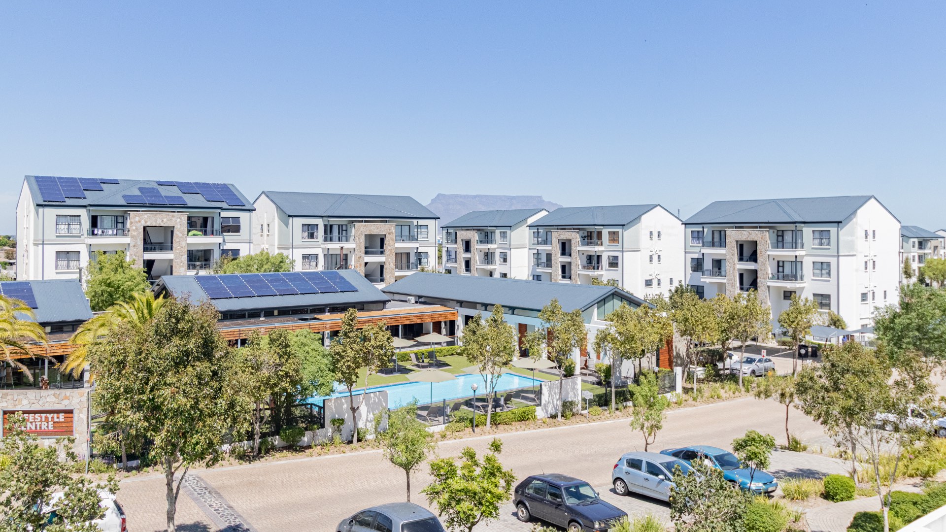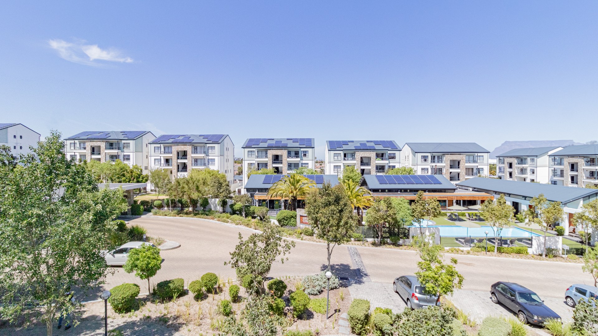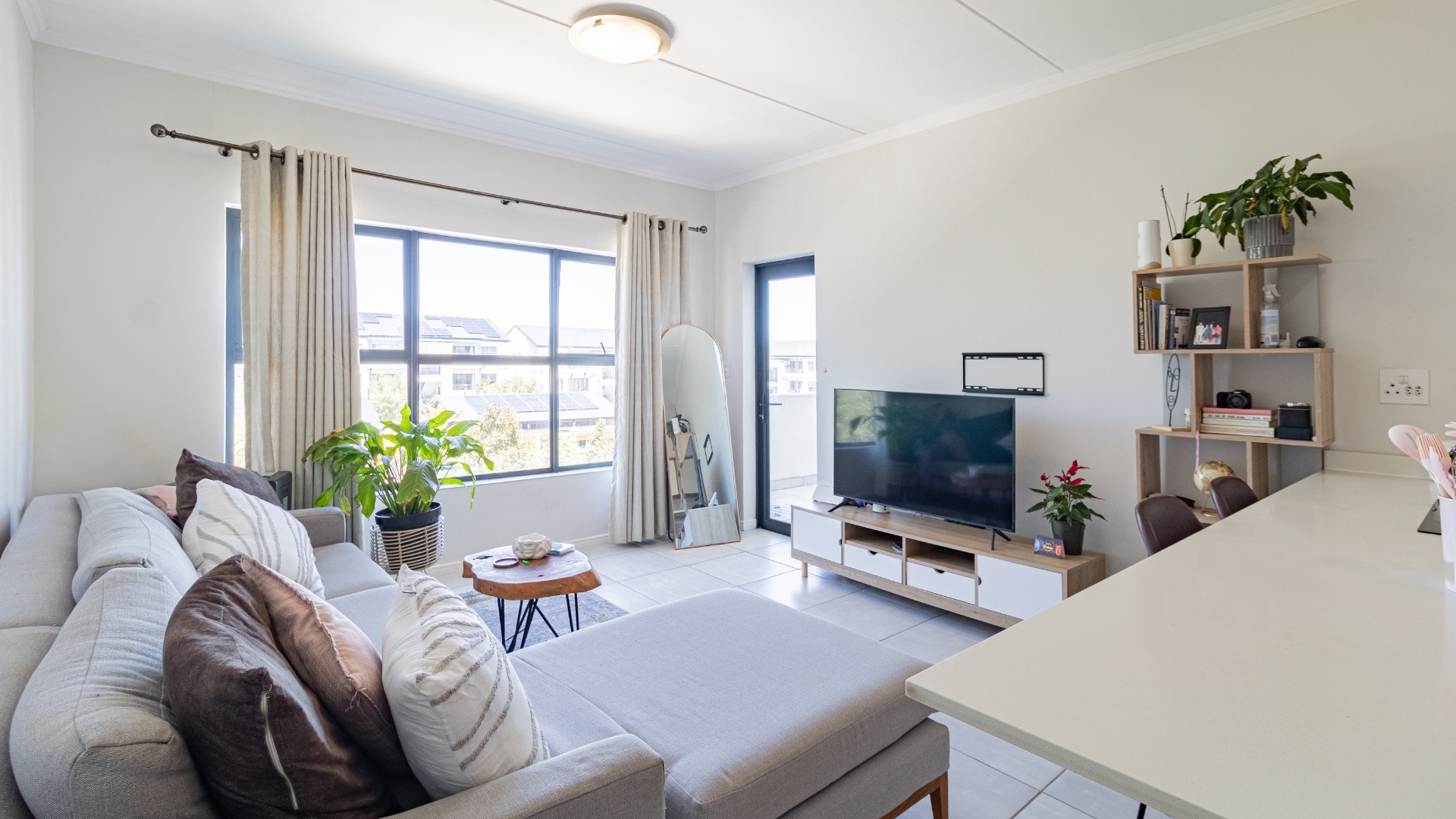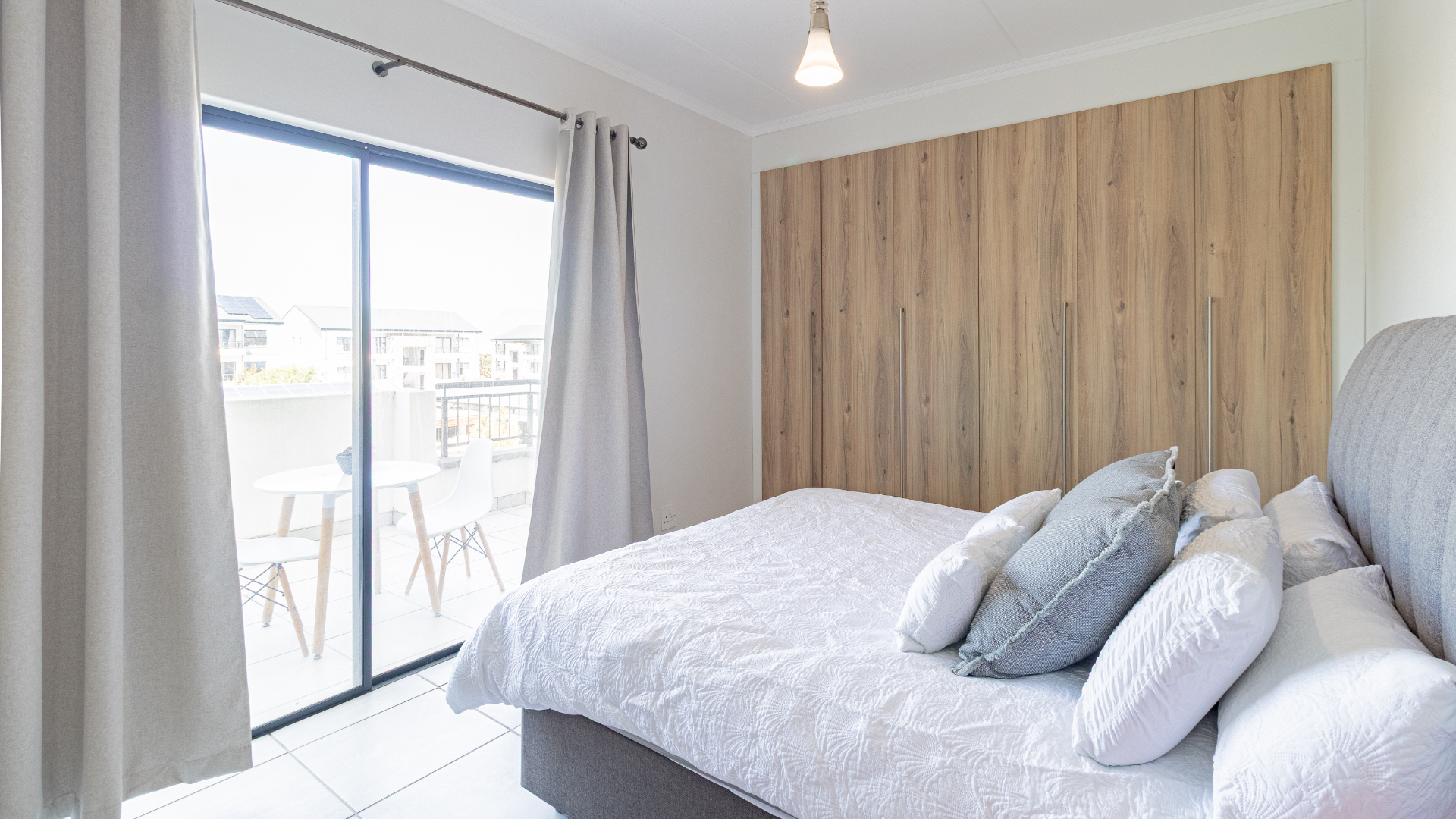 This modern apartment offers an open-plan kitchen and living area that flows onto a spacious balcony with stunning views of the lifestyle centre and Table Mountain - visible from both the living area and the bedroom! The bedroom includes generous built-in cupboards and direct access to the balcony.