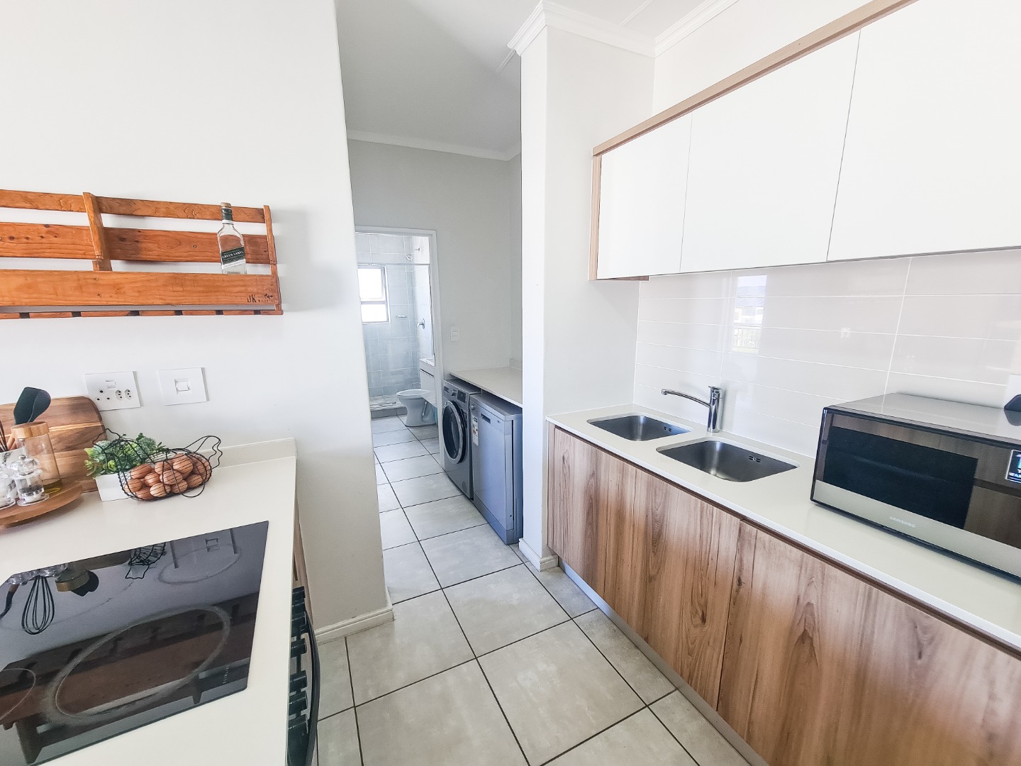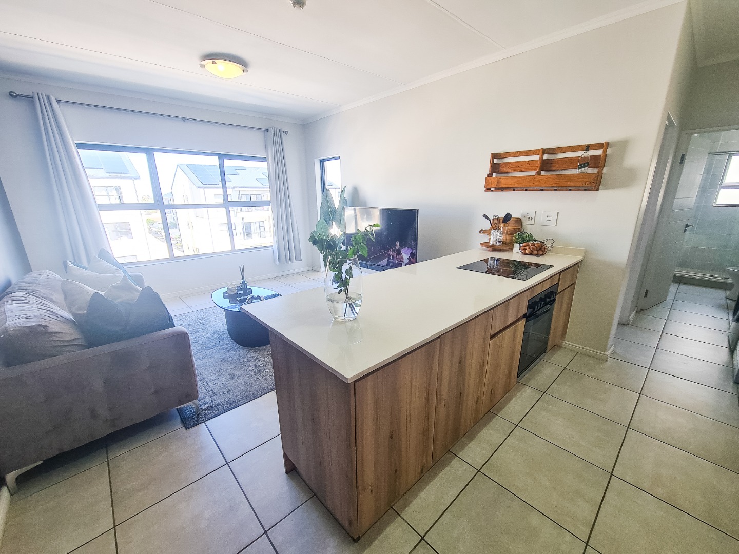 This spacious and light apartment offers a big open-plan living area, Scandinavian styled kitchen complete with island, spacious bedroom, one bathroom, a patio with drop-down canvas covers and an abundance of cupboard space.