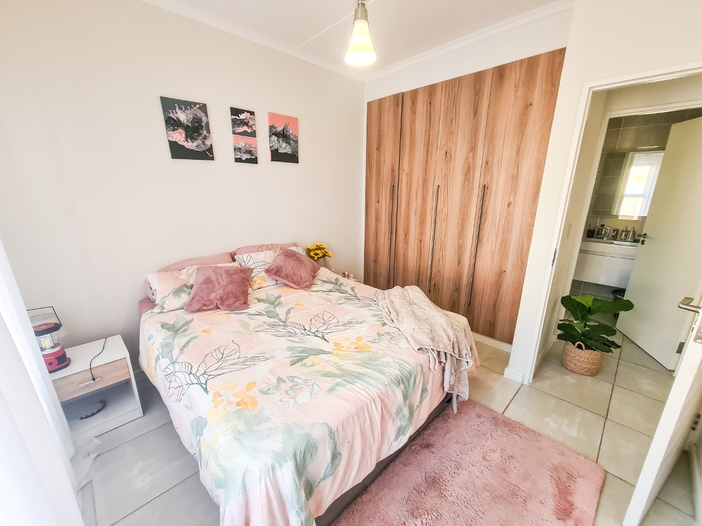The bedroom includes built-in cupboards and direct access to the modern bathroom, fitted with neutral grey tiles and a glass-enclosed shower.
