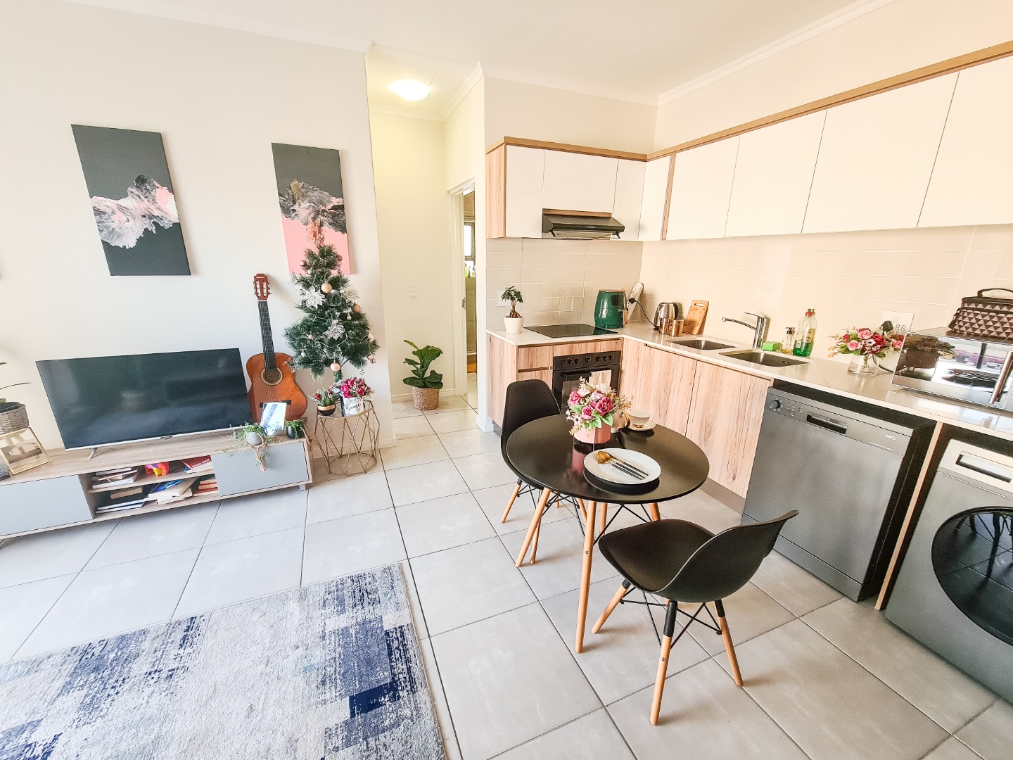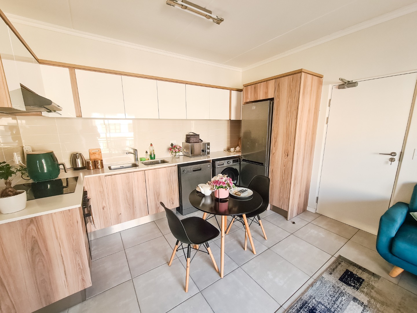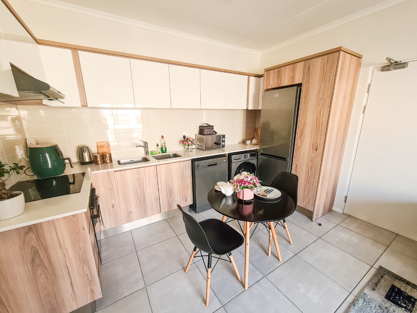 This modern apartment in De Zicht Estate offers comfortable and convenient living in a secure lifestyle estate. The open-plan lounge flows seamlessly into a well-appointed kitchen with contemporary finishes and integrated appliances, including a washing machine, washer-dryer and fridge. Tiled flooring throughout makes for easy maintenance, while large sliding doors open onto a balcony.