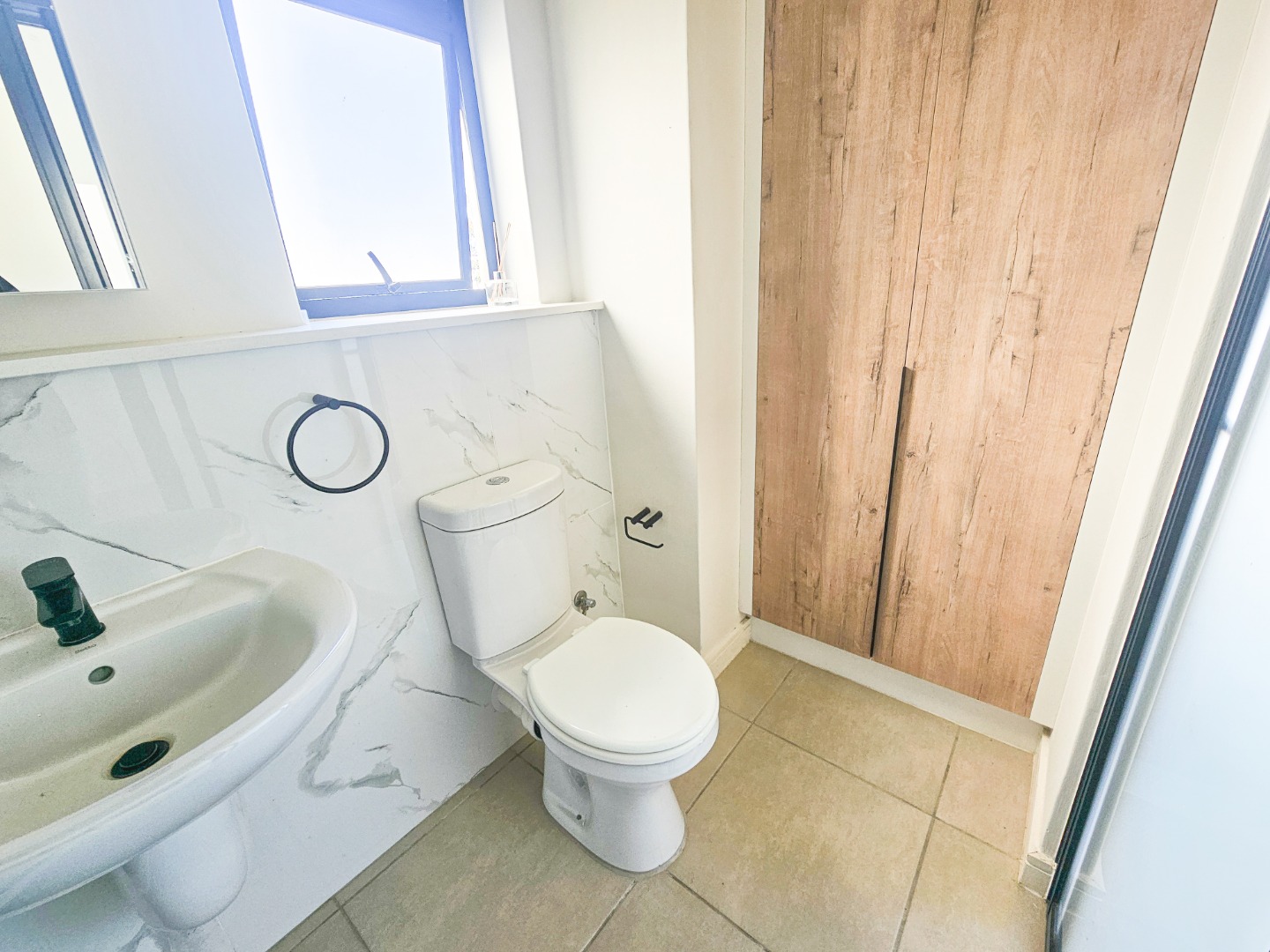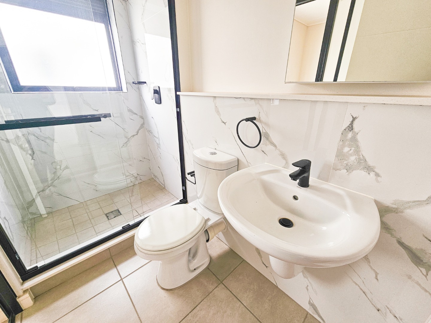 This light-filled unit features a spacious open-plan living area flowing onto a large private patio, ideal for relaxing or entertaining. The stylish kitchen is fitted with Quartz countertops and comes equipped with eco-friendly appliances, including a fridge, dishwasher, and washer/dryer combo.