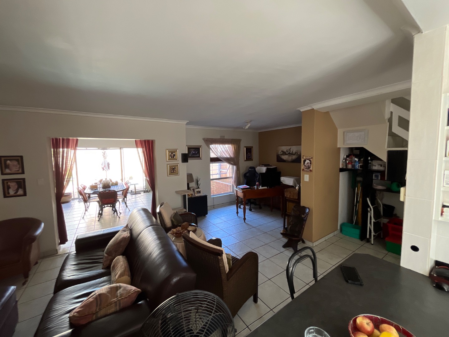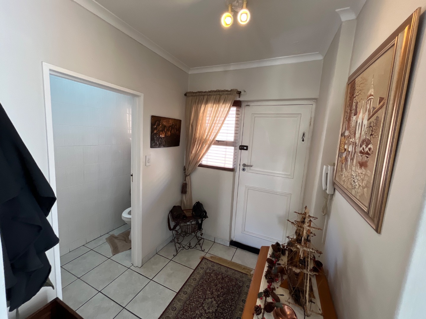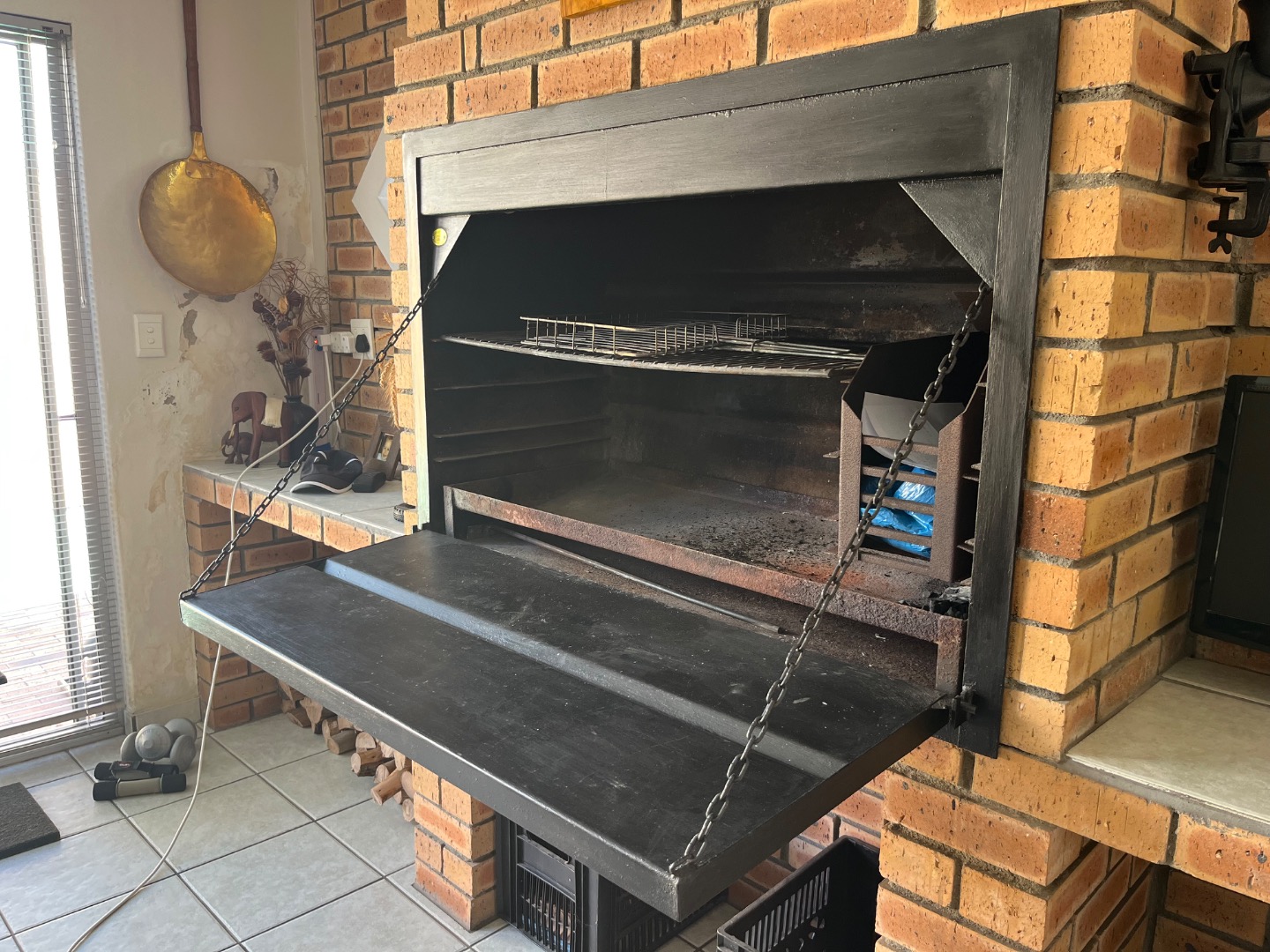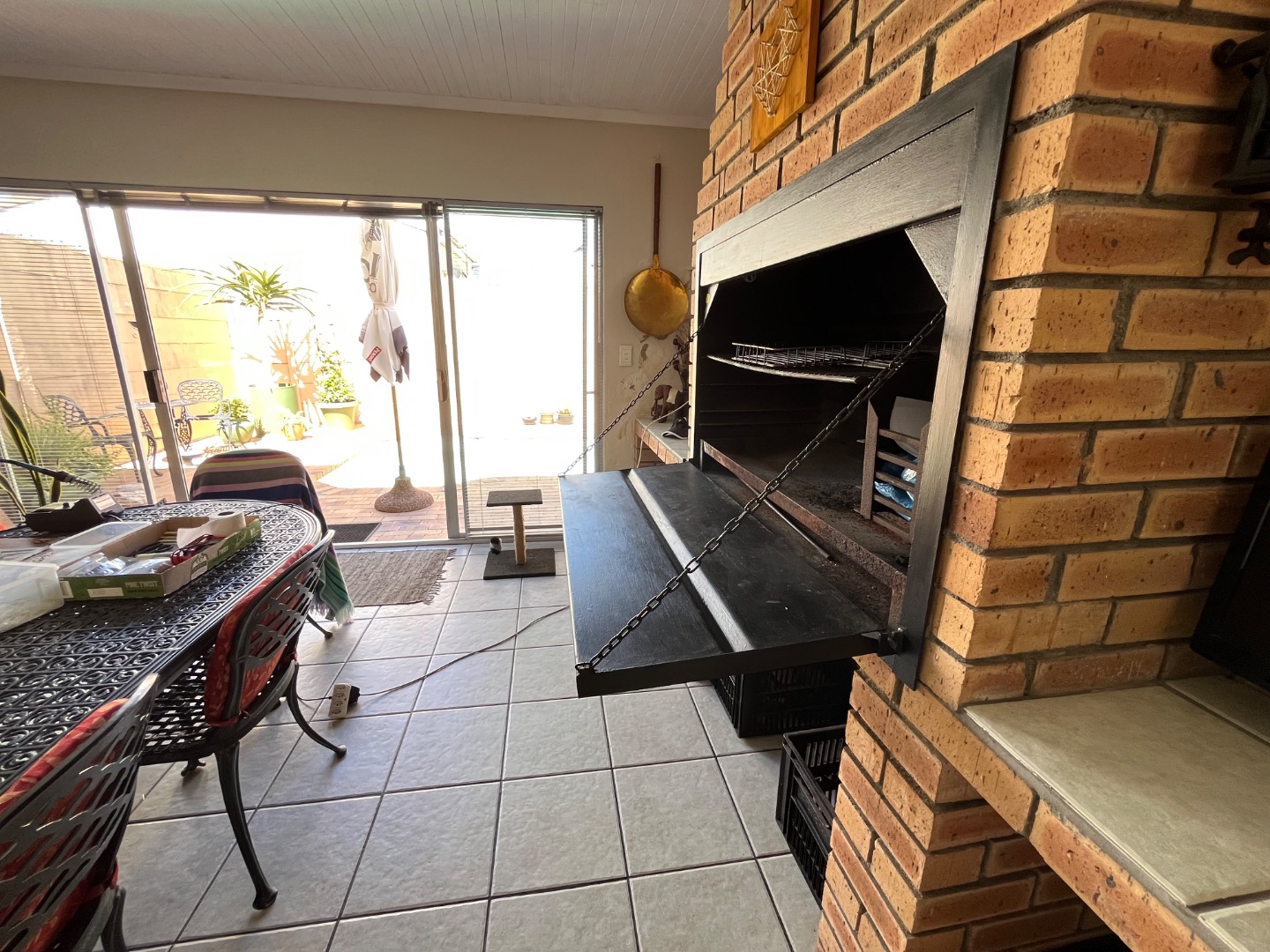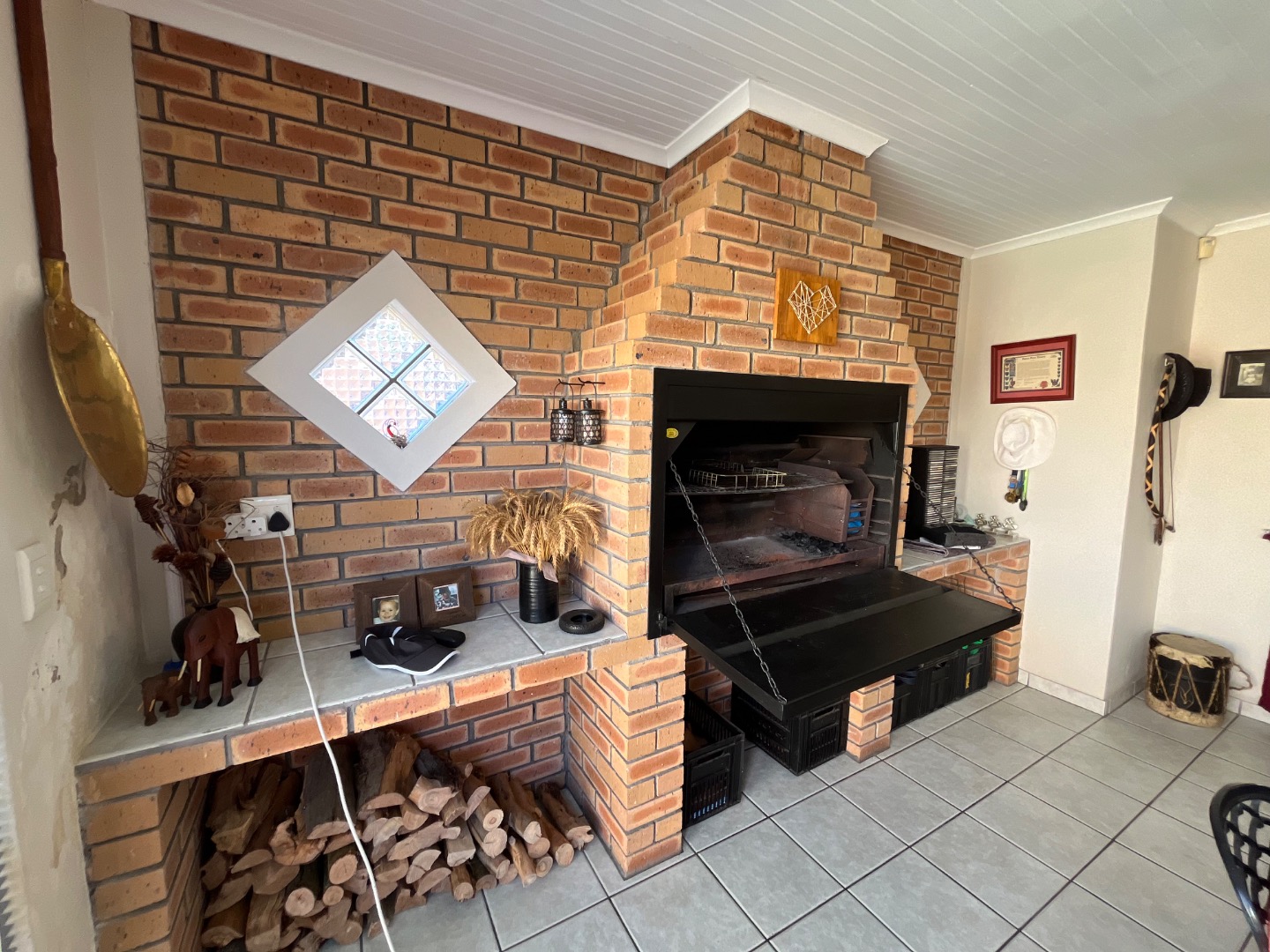 Outside, the property features a private garden, a refreshing swimming pool, and a built-in braai area. The paved driveway leads to a single garage, providing secure parking, with additional under cover parking available for 2 cars. Pets are welcome, and the property is totally walled, offering a secure environment. Enjoy scenic views from various points around the home.