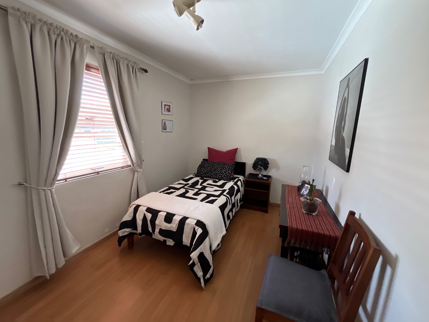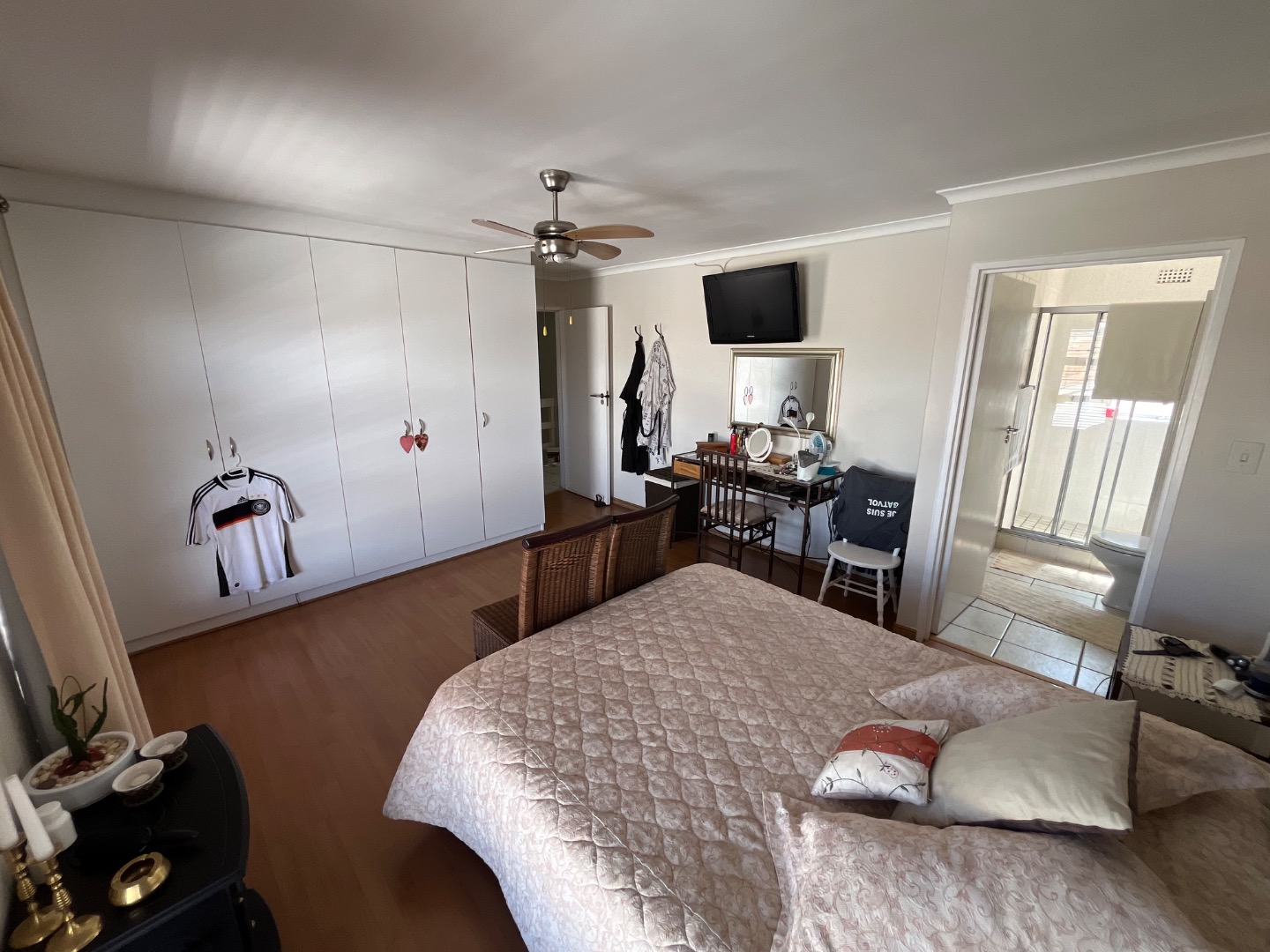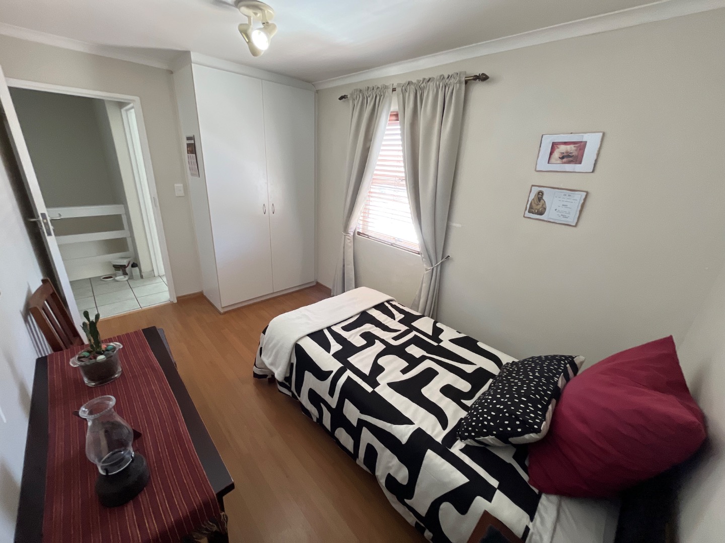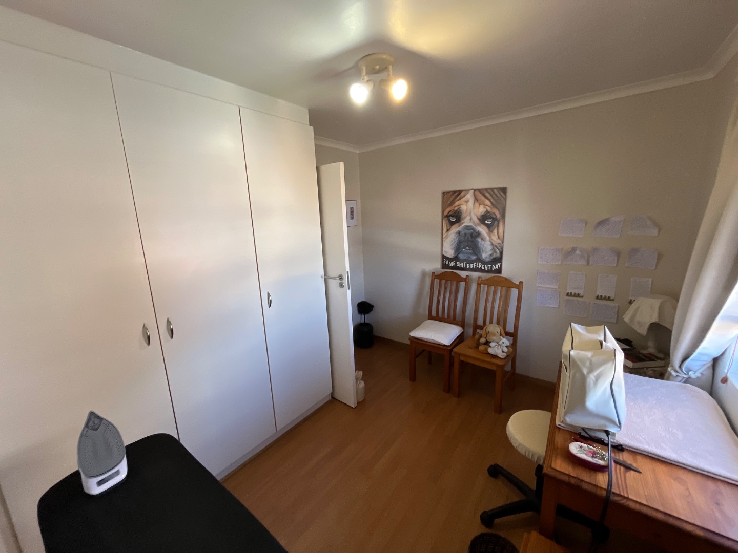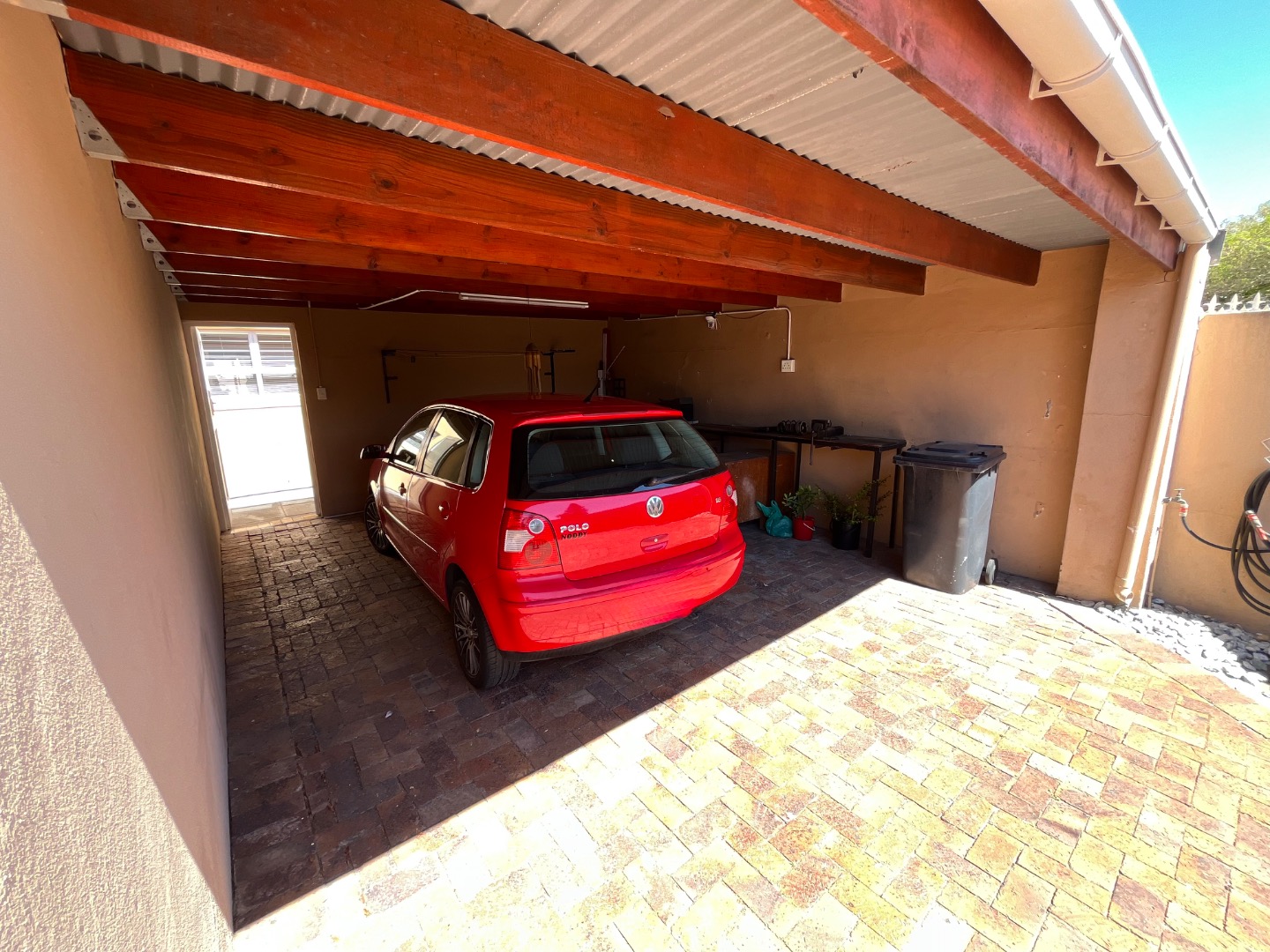 Outside, the property features a private garden, a refreshing swimming pool, and a built-in braai area. The paved driveway leads to a single garage, providing secure parking, with additional under cover parking available for 2 cars. Pets are welcome, and the property is totally walled, offering a secure environment. Enjoy scenic views from various points around the home.