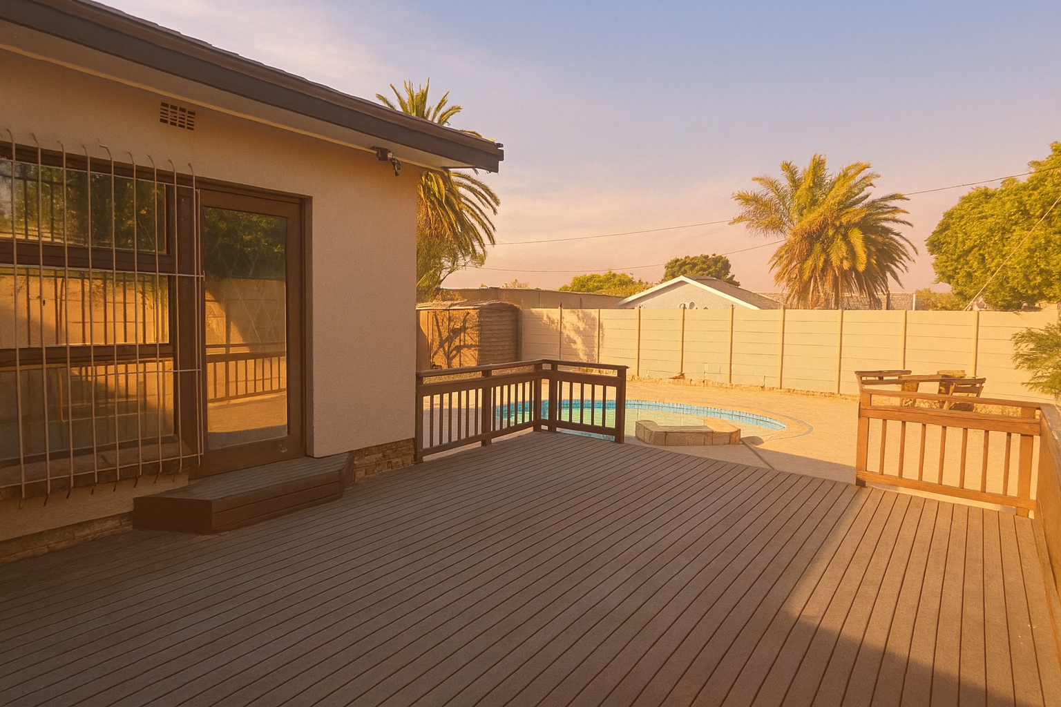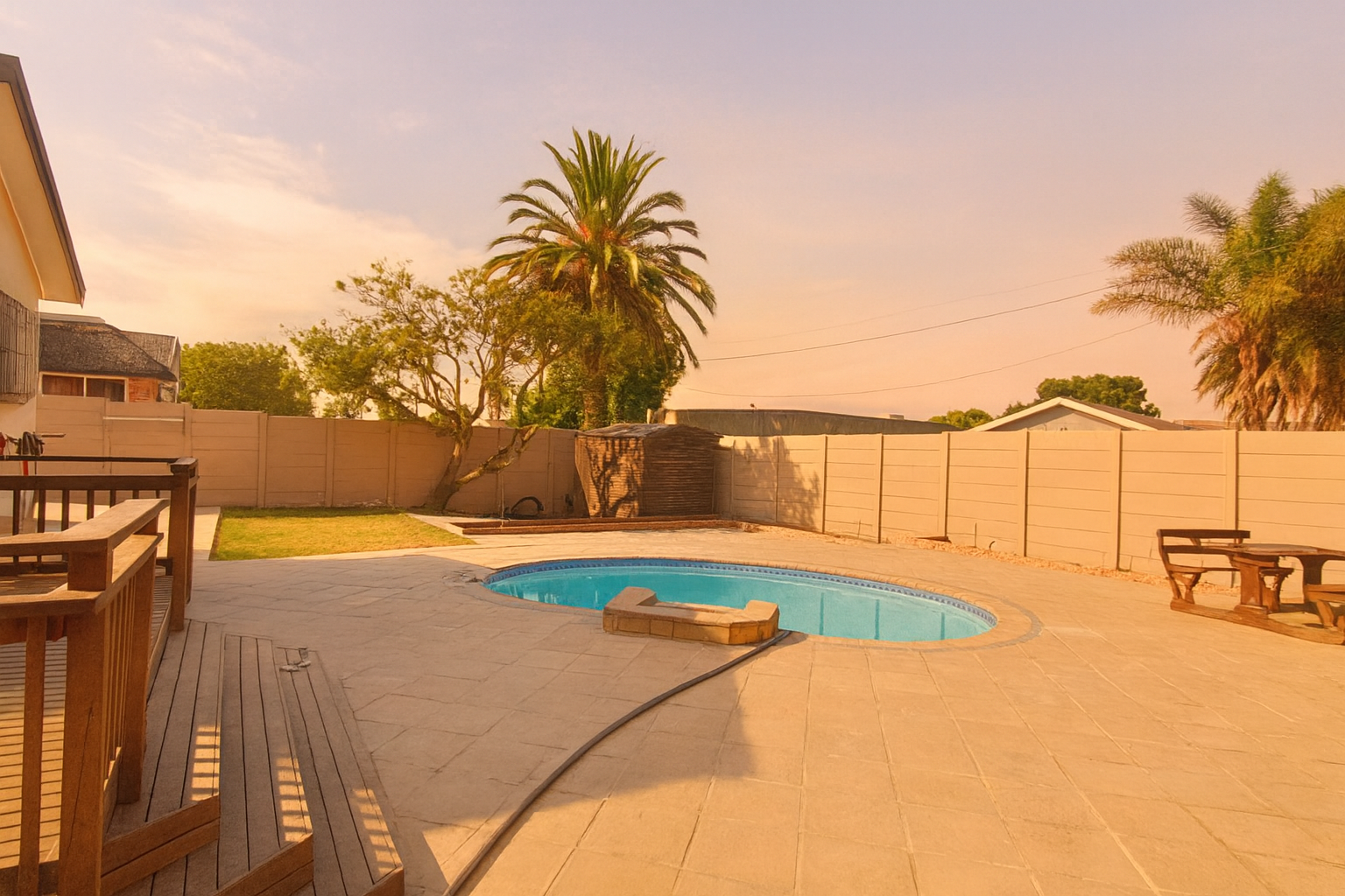 A functional kitchen with an integrated oven and pass-through window serves the home. Step outside to a private oasis boasting a sparkling swimming pool, wooden deck, and extensive paved patio, ideal for entertaining. The property includes a double garage, well-maintained garden, and a borehole.