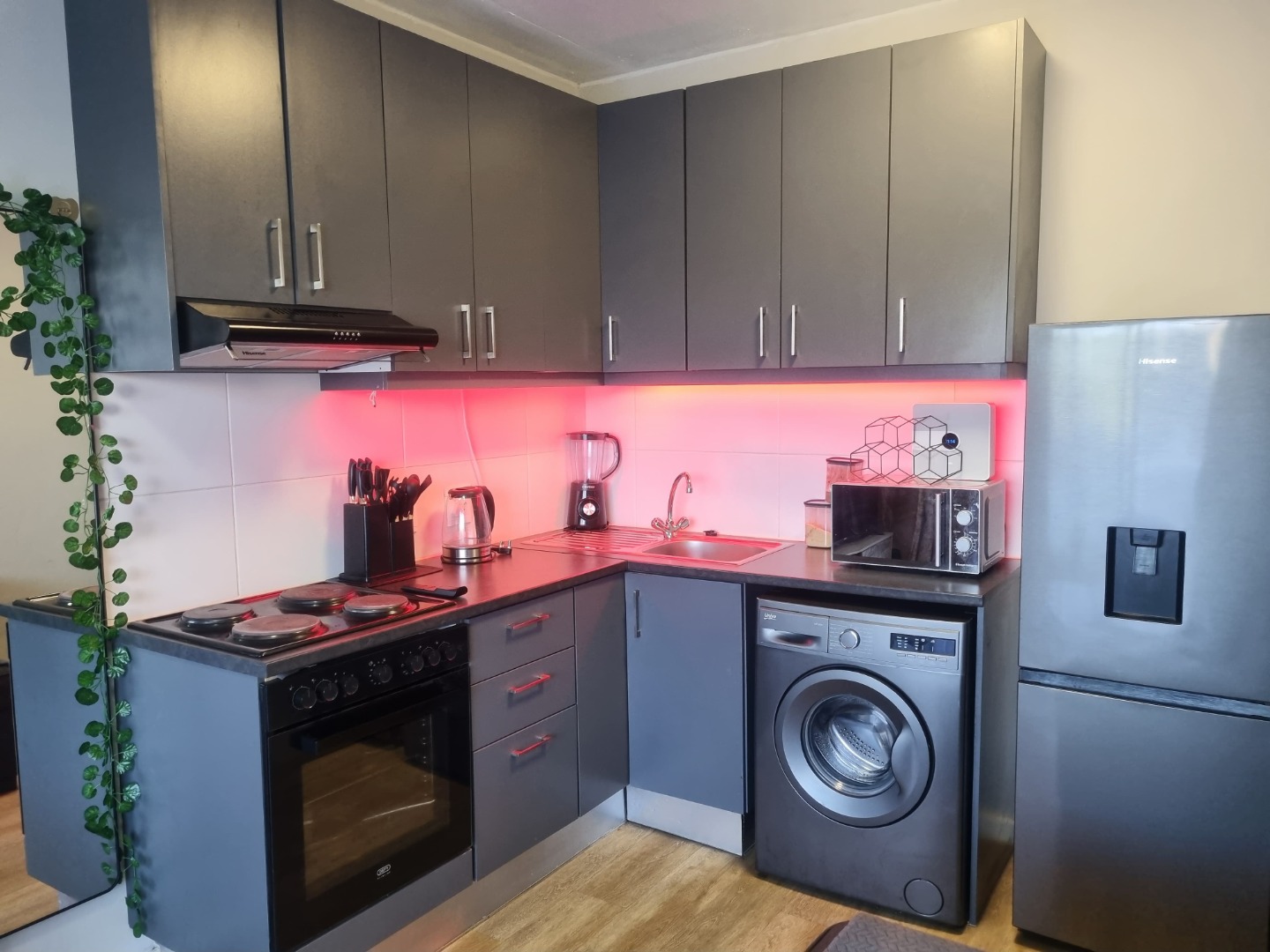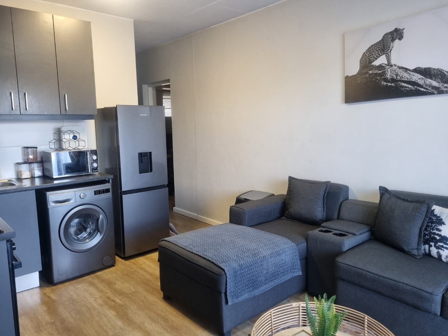 Discover modern living in this stylish 1-bedroom, 1-bathroom apartment located in the sought-after metropolitan area of Pinelands, Cape Town. Spanning a comfortable 39 square metres, this residence offers a thoughtfully designed open-plan living space that seamlessly integrates a compact, contemporary kitchen with the lounge area. The kitchen boasts sleek grey cabinetry, wood-look laminate flooring, and a suite of integrated appliances including an oven, hob, extractor fan, microwave, washing machine, and a fridge with a water dispenser, ensuring both functionality and aesthetic appeal. Natural light floods the living area through large sliding doors, creating a bright and inviting atmosphere.