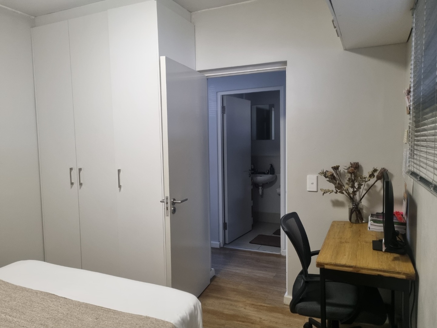 The well-appointed bedroom features built-in white wardrobes, providing ample storage, alongside a dedicated desk area perfect for a home office setup. The neutral decor and wood-look flooring extend throughout, creating a cohesive and tranquil environment. The modern bathroom is equipped with a walk-in shower, a small wall-mounted basin, and a toilet, maintaining a clean and functional aesthetic.