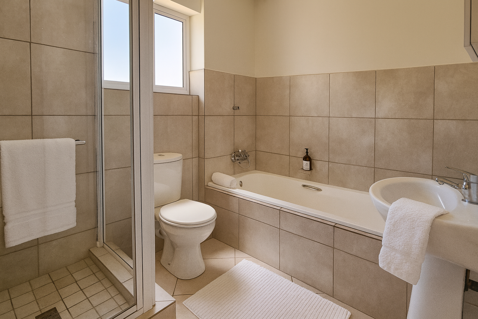 The apartment comprises two bedrooms, each with built-in cupboards, and is serviced by a well-appointed bathroom featuring both a shower and a bathtub.