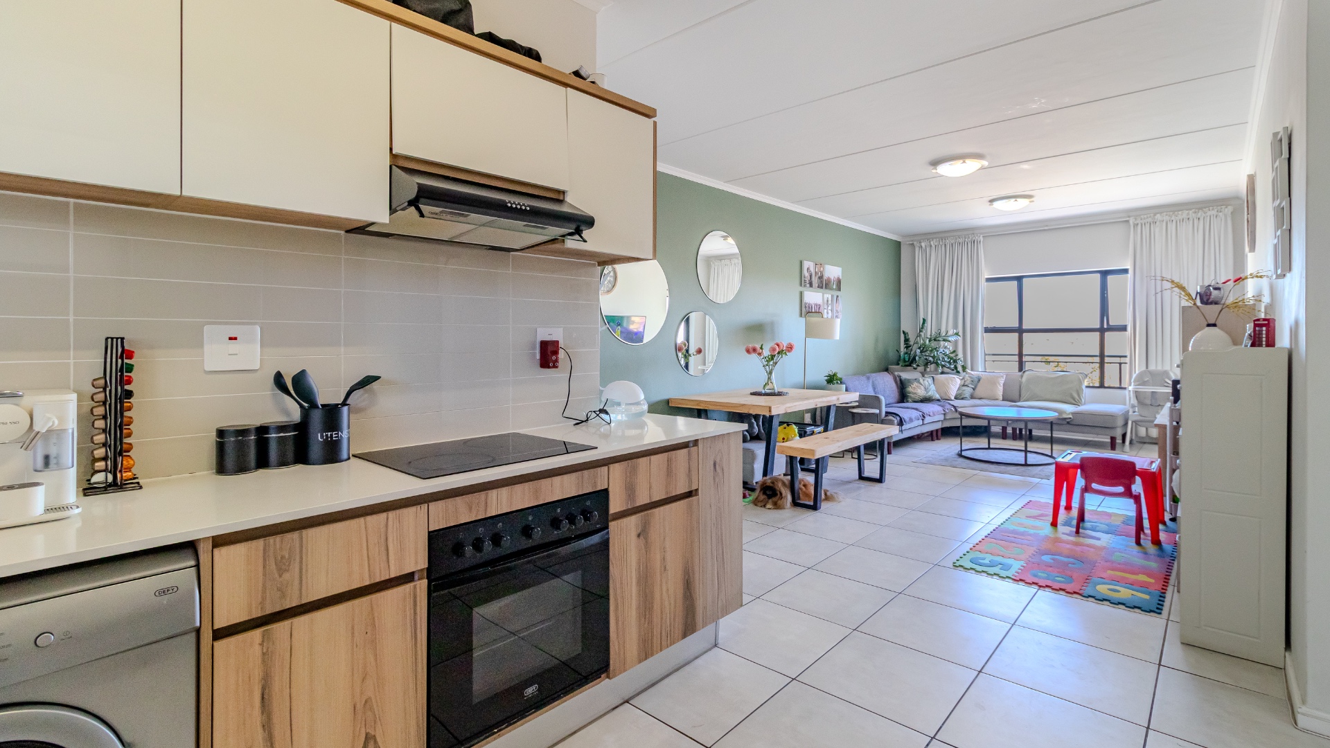 The living area is open plan, with the kitchen flowing into the dining and lounge space to create a practical and easy layout. The kitchen offers ample cupboard space and storage, along with a built-in electric oven and stove.