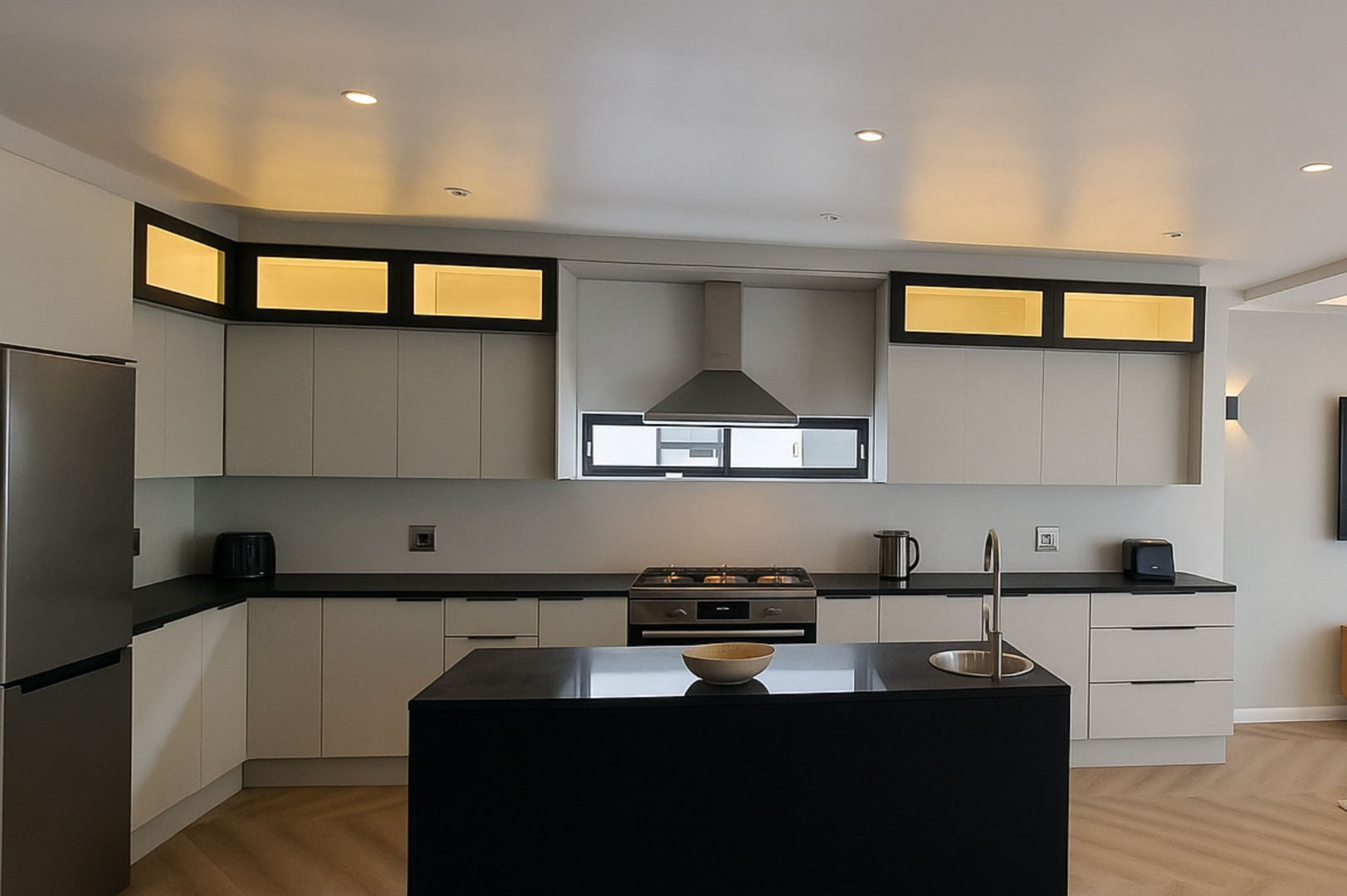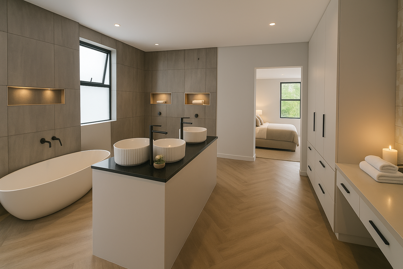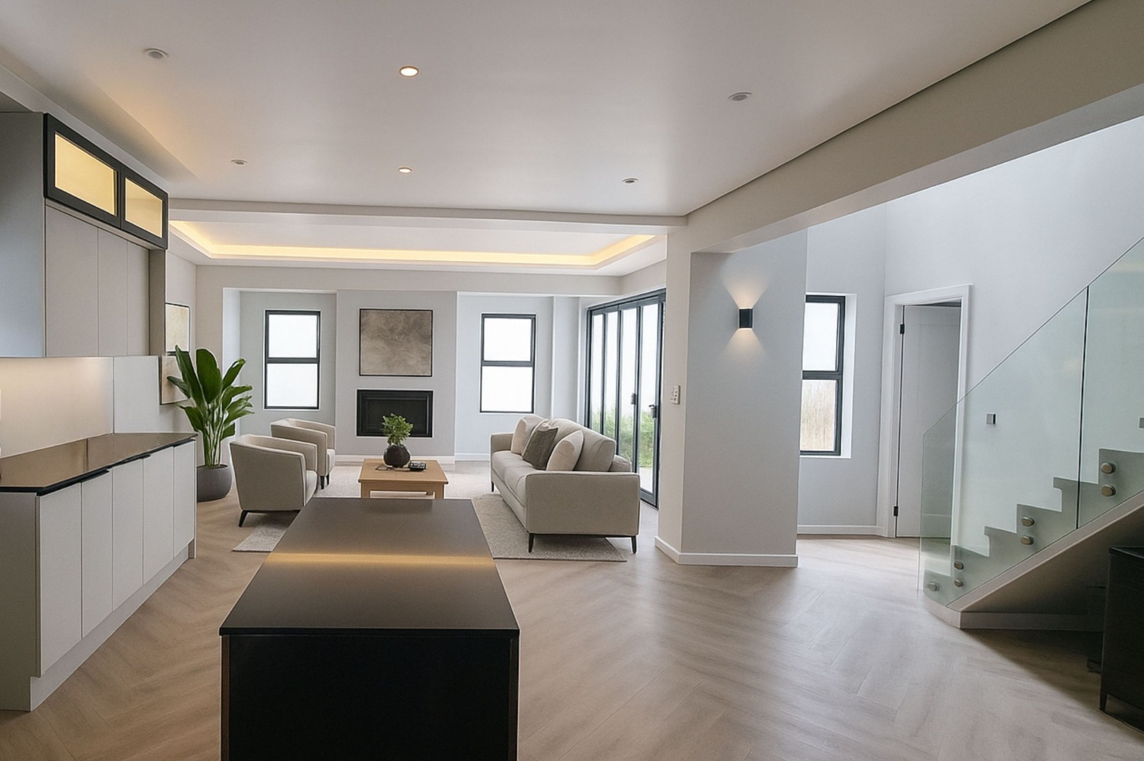 The open-plan living spaces, adorned with luxurious herringbone flooring and high ceilings, seamlessly integrate a state-of-the-art kitchen featuring sleek cabinetry and a central island.