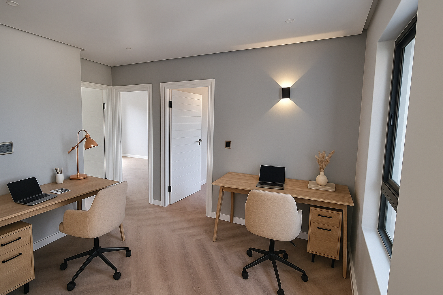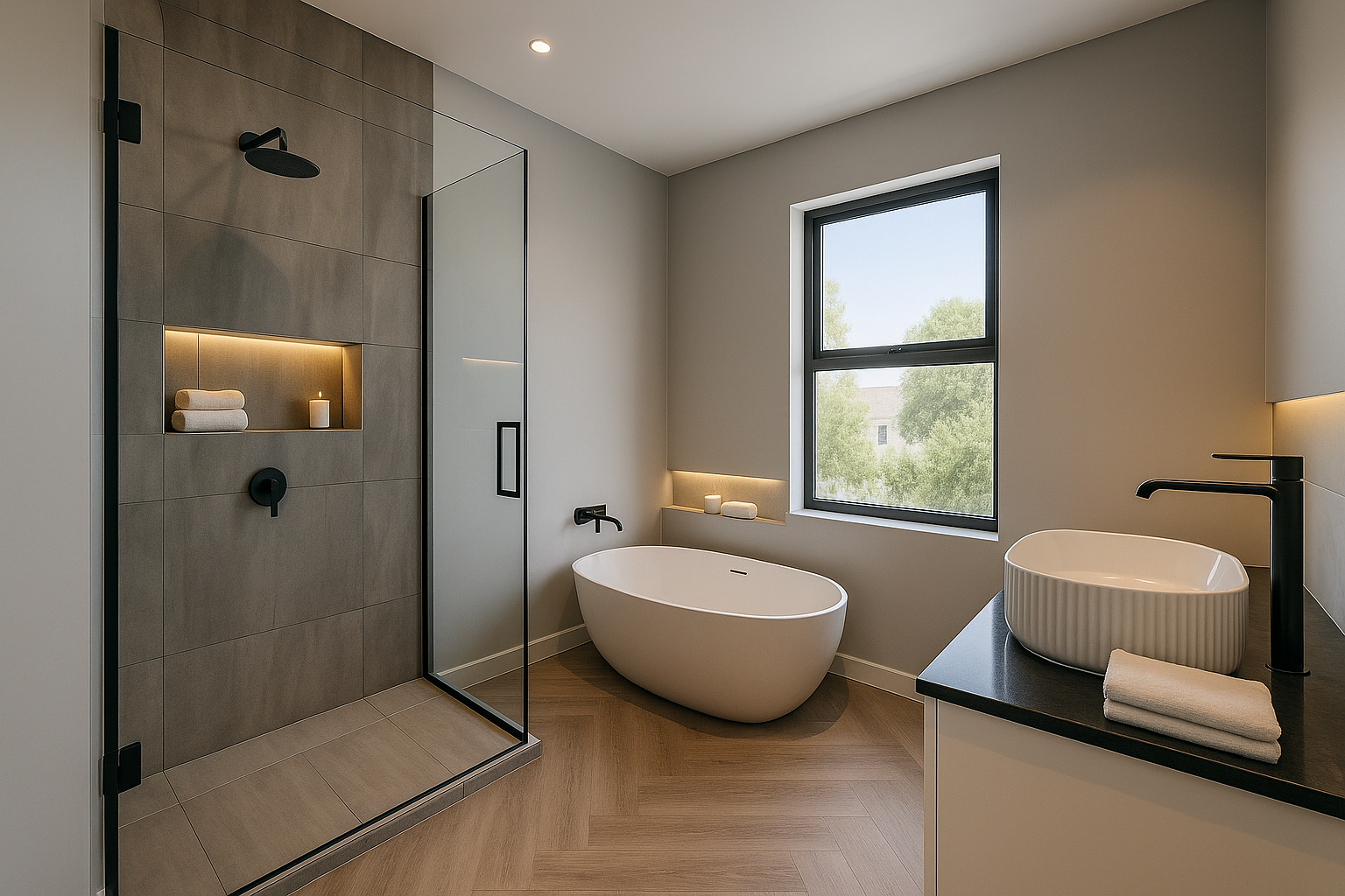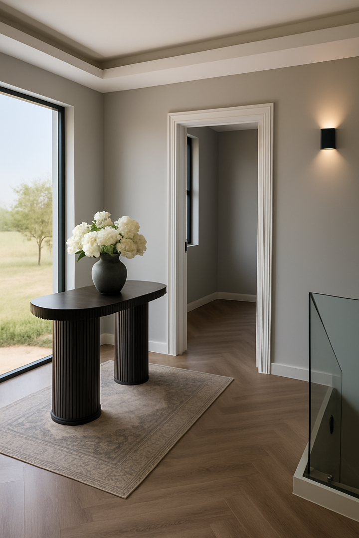 The open-plan living spaces, adorned with luxurious herringbone flooring and high ceilings, seamlessly integrate a state-of-the-art kitchen featuring sleek cabinetry and a central island.