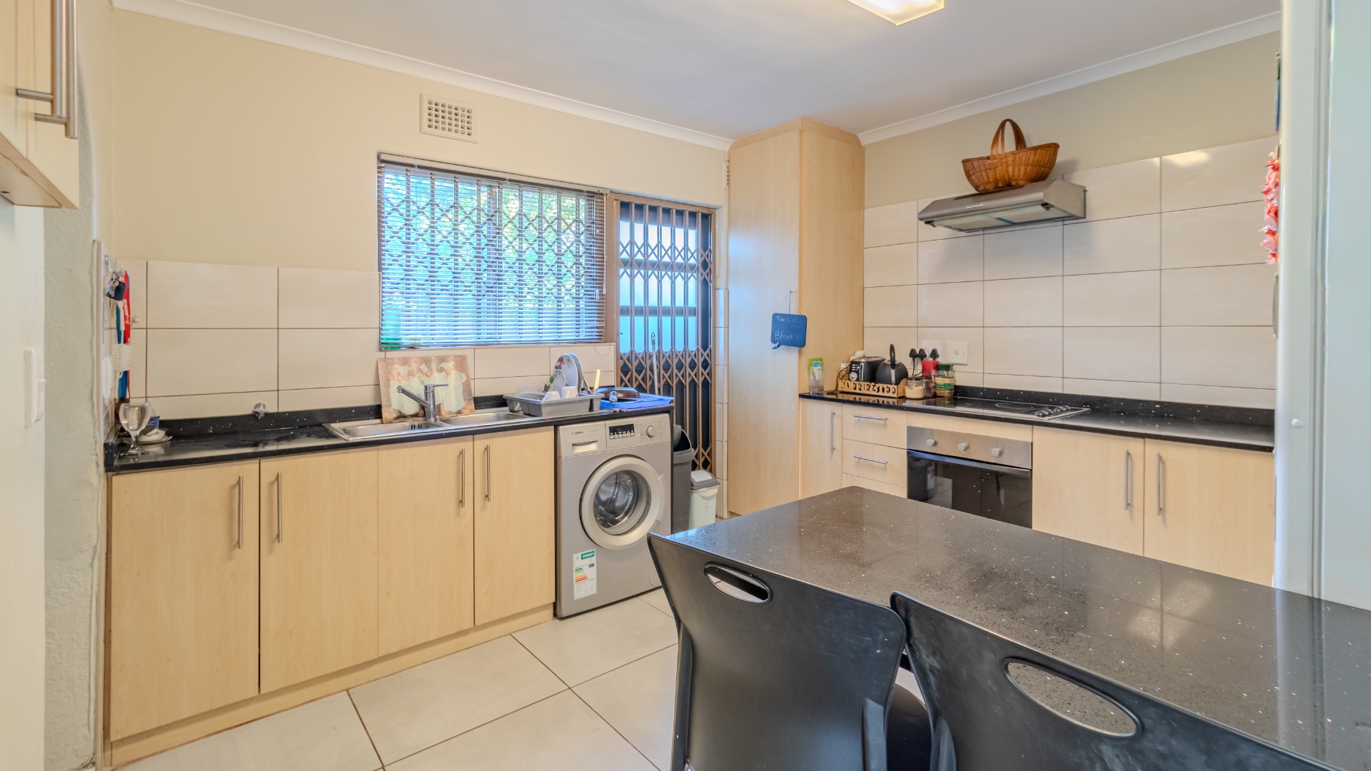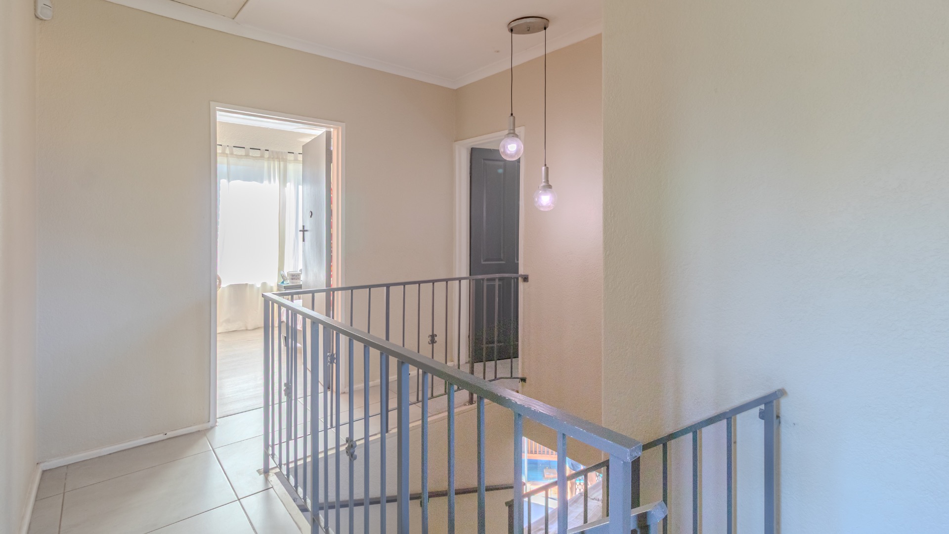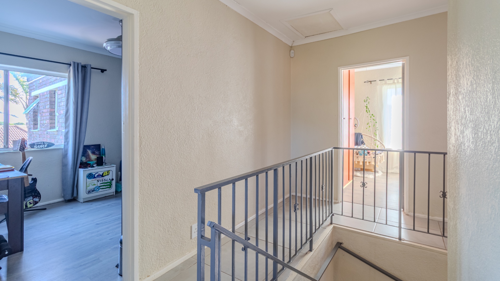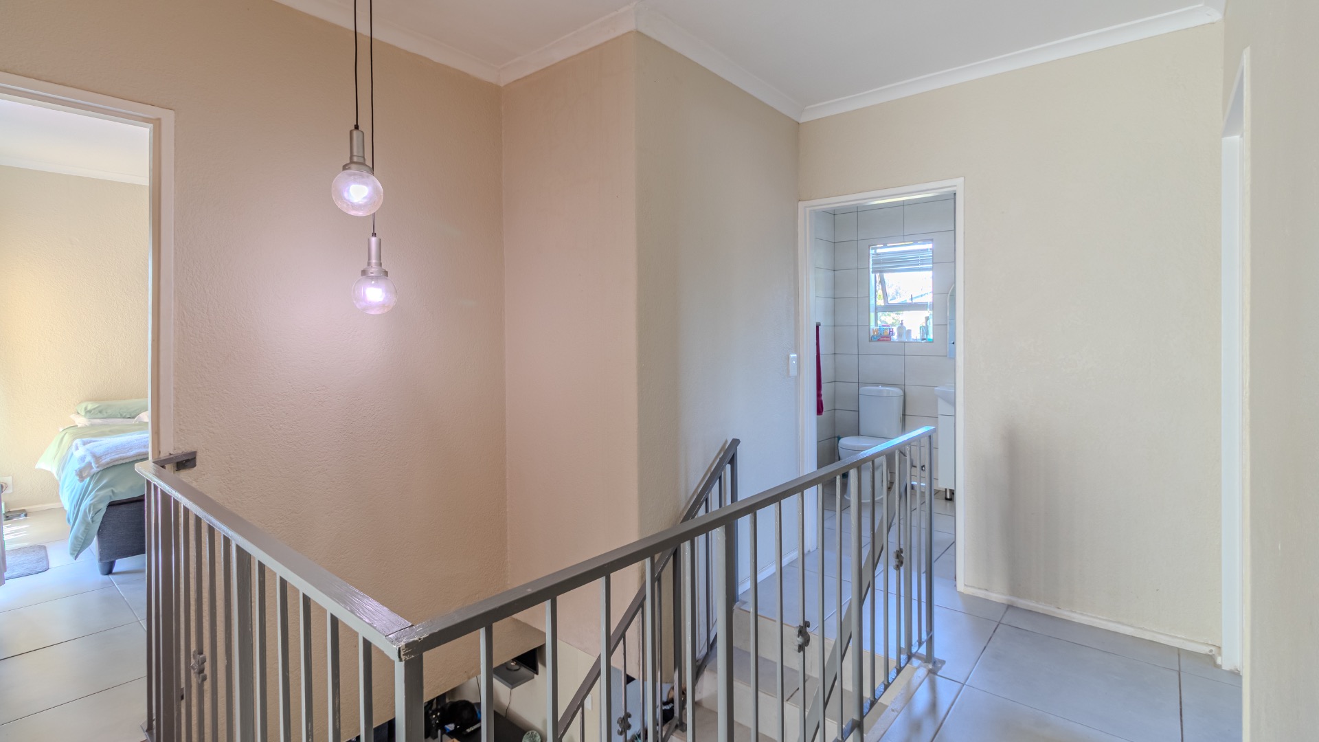 One of only three units in a secure complex, this double-storey home features three bedrooms upstairs. The main bedroom includes built-in cupboards, tiled flooring, a private balcony and an en-suite bathroom. The second and third bedrooms are fitted with built-in cupboards and laminated flooring, and they share a second bathroom equipped with a bath and shower. A convenient guest bathroom is located on the lower level, right by the front door and entertainment.