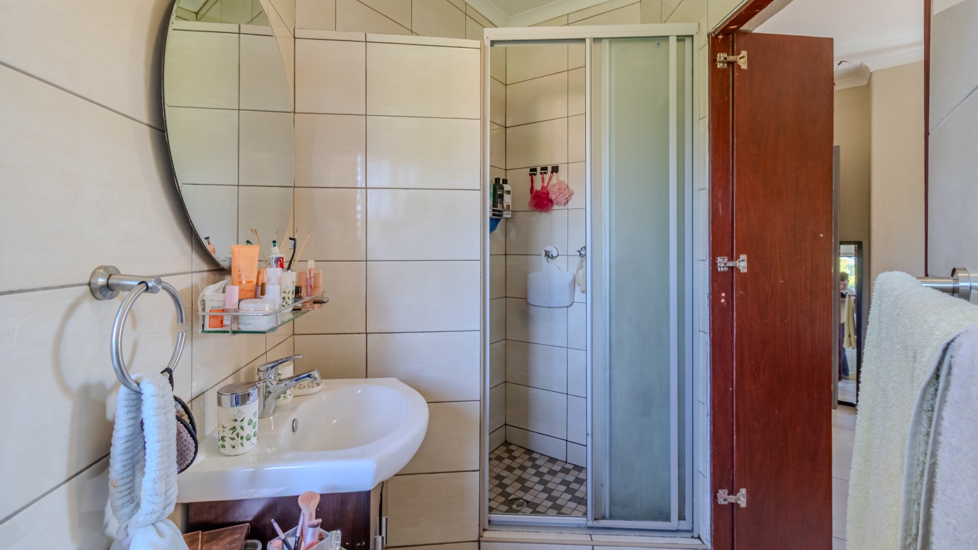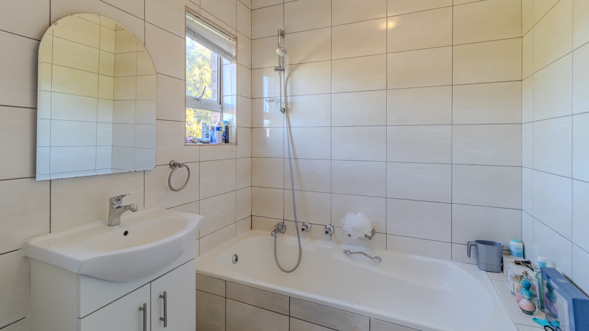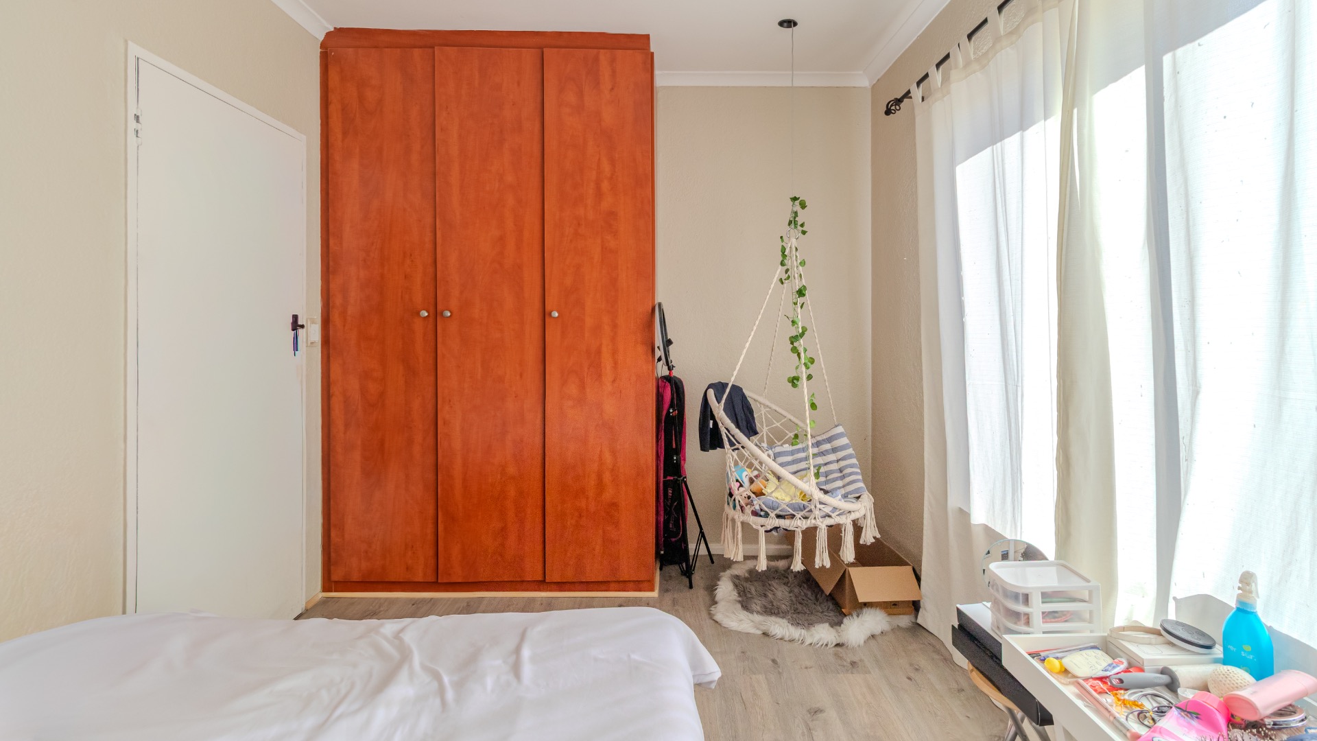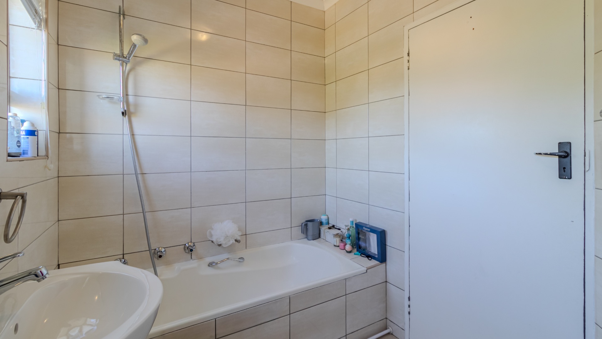 One of only three units in a secure complex, this double-storey home features three bedrooms upstairs. The main bedroom includes built-in cupboards, tiled flooring, a private balcony and an en-suite bathroom. The second and third bedrooms are fitted with built-in cupboards and laminated flooring, and they share a second bathroom equipped with a bath and shower. A convenient guest bathroom is located on the lower level, right by the front door and entertainment.