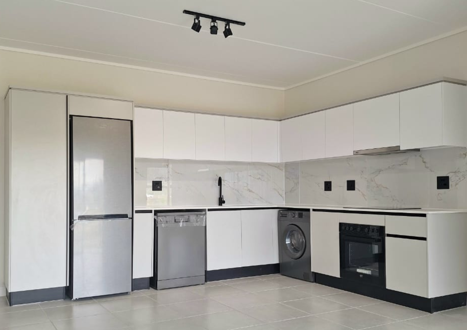 - Kitchen: open plan and includes a fridge, washing machine and dishwasher.
