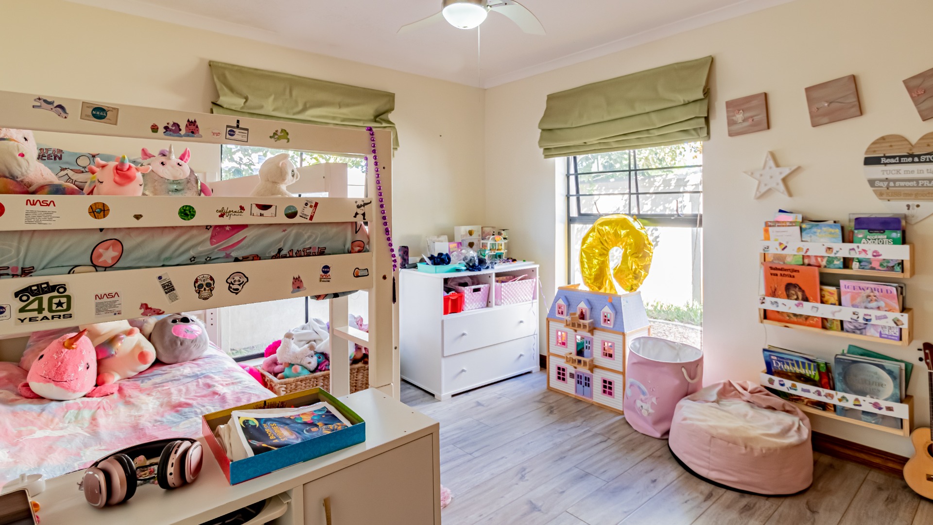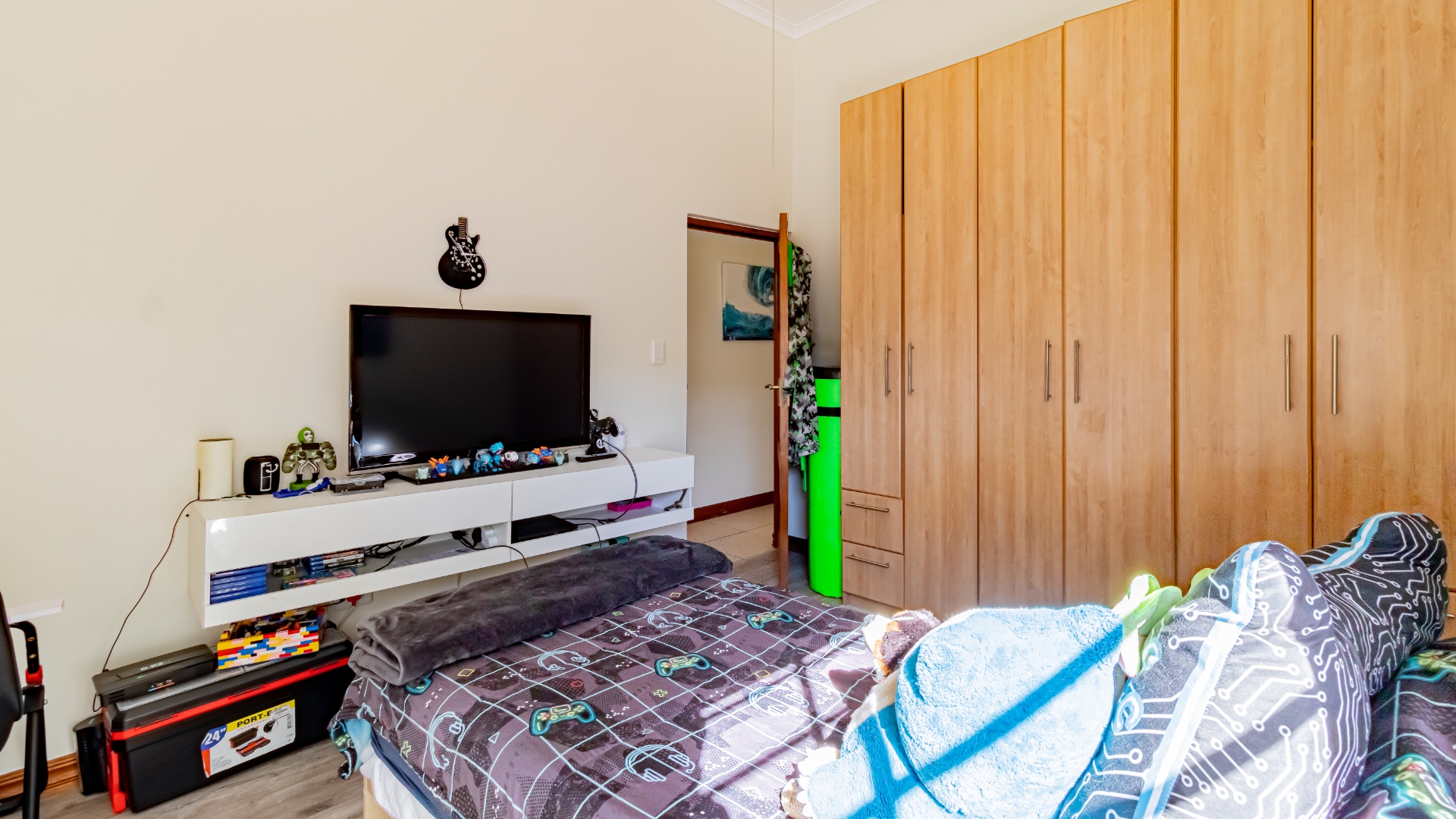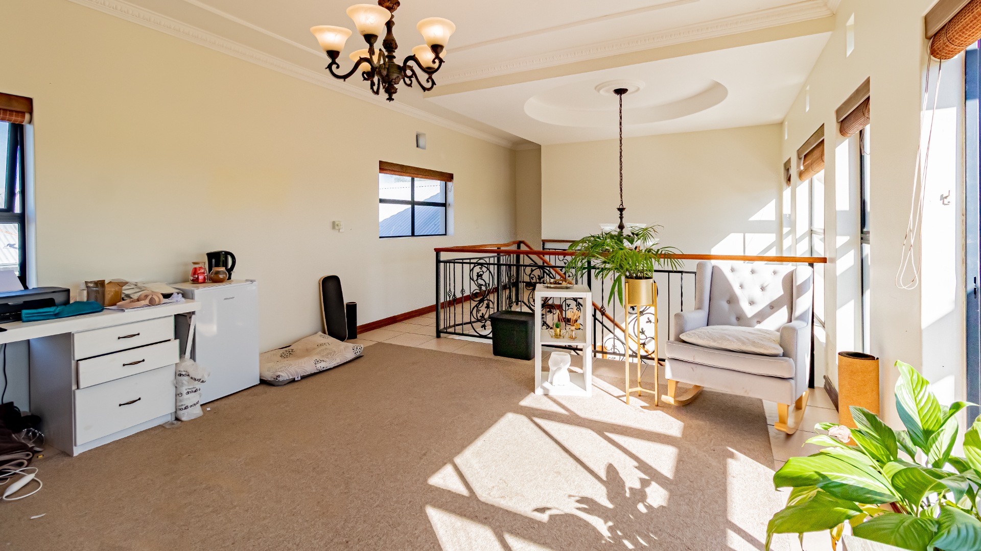 The other bedroom downstairs (4th) also has built in cupboards. The 5th can be used as a study or a smaller bedroom. There is a bedroom upstairs which can be a guest bedroom.