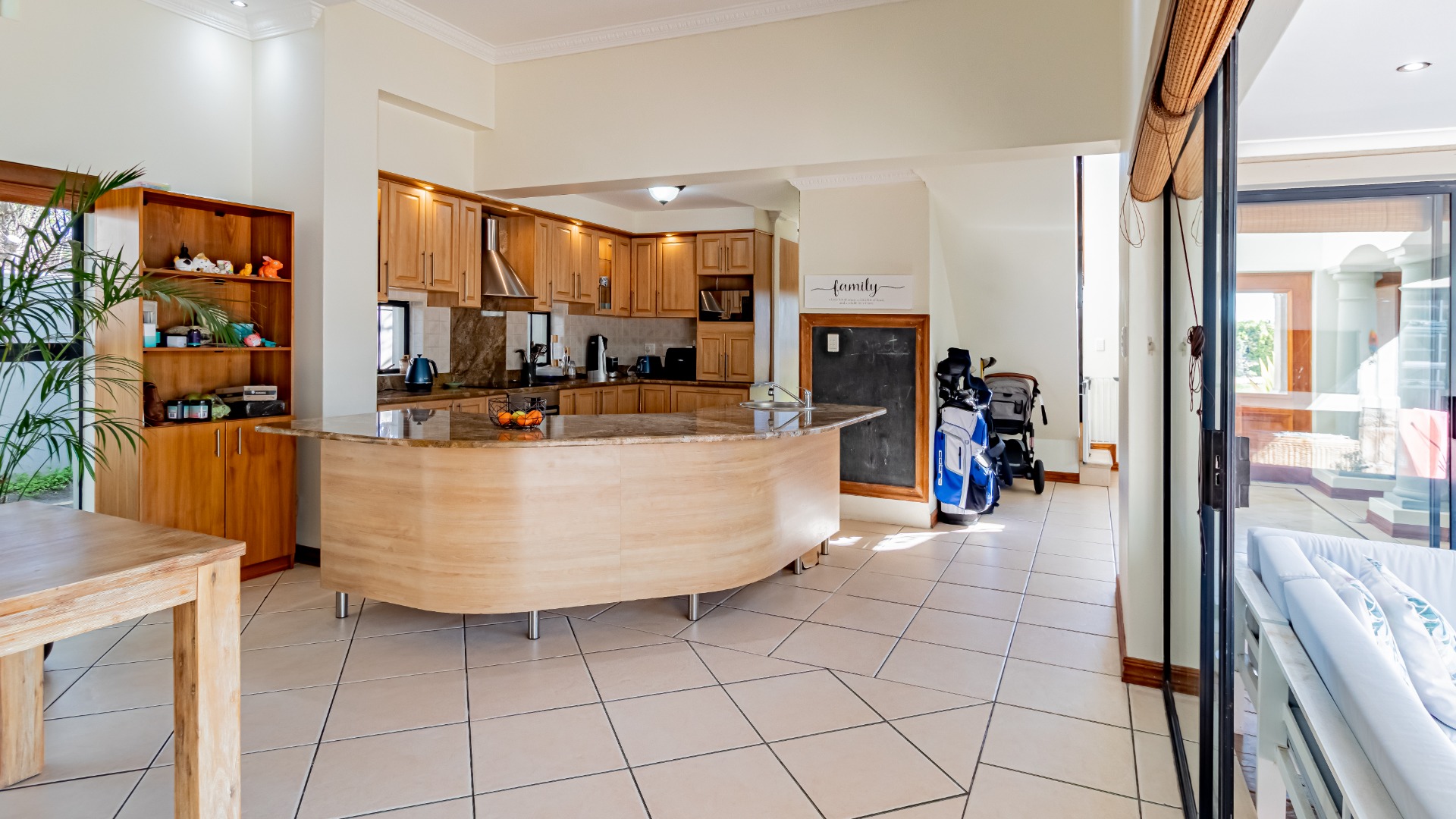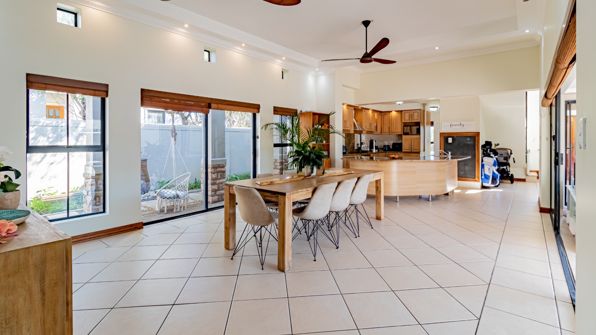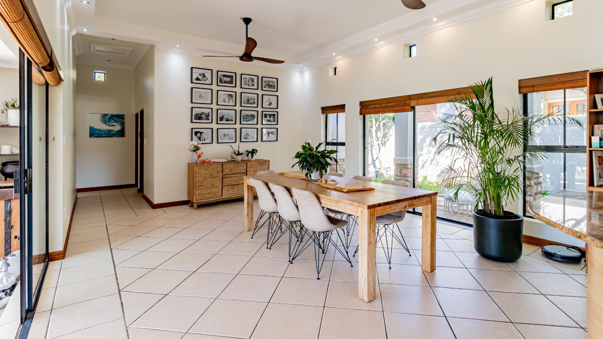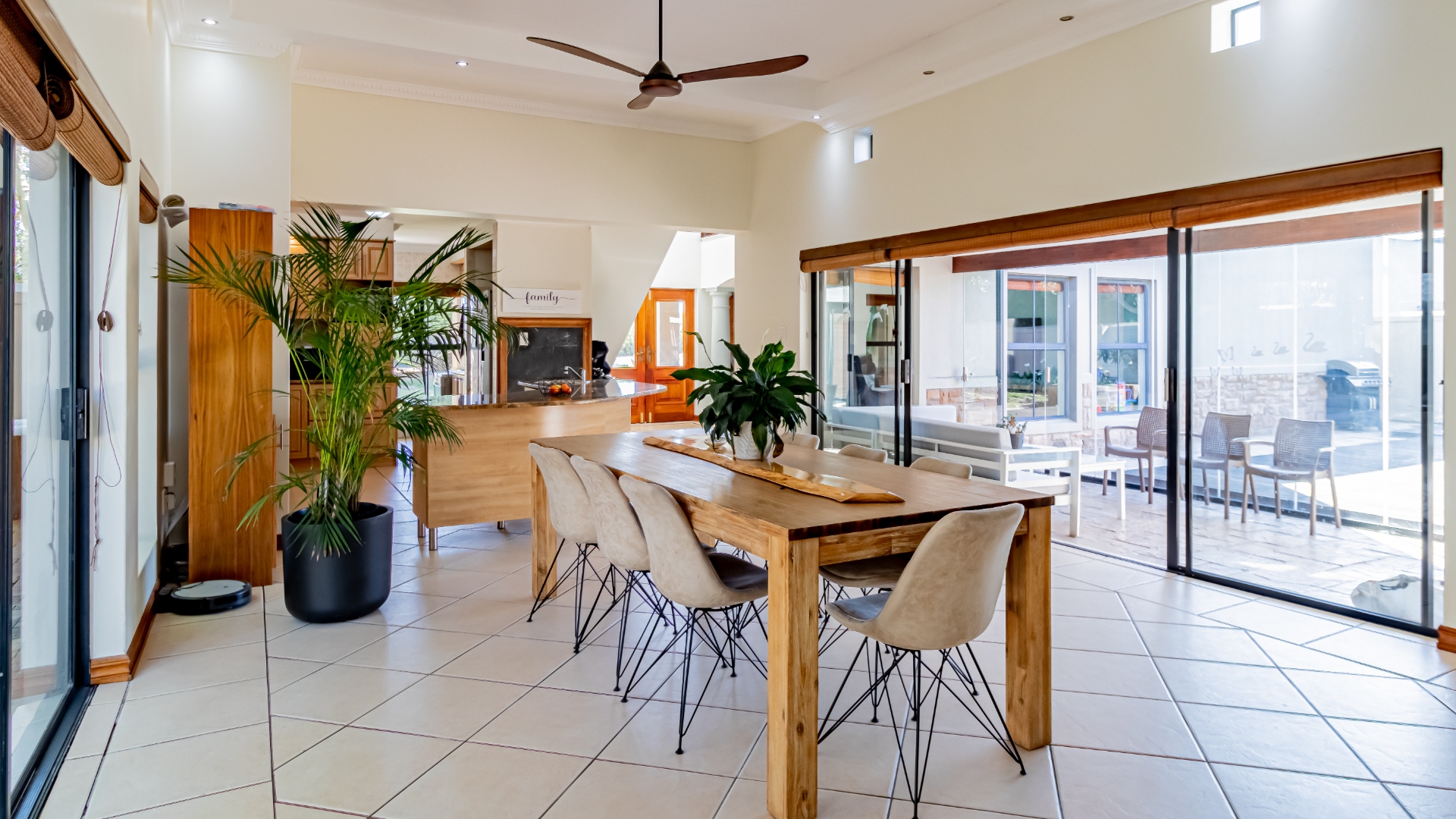 The living areas off the kitchen is lovely and open plan. The kitchen is spacious with lots of built in cupboards as well as a separate scullery. Space for a double door fridge. The leads to the indoor braai room that has stack away doors to the outside pool and garden. The garden is North Facing and wind-free.